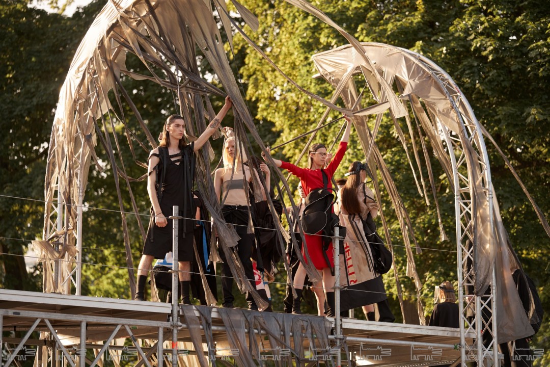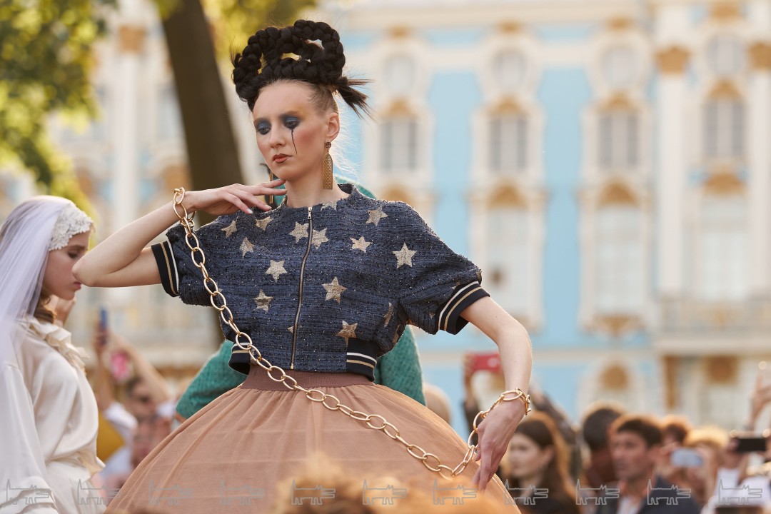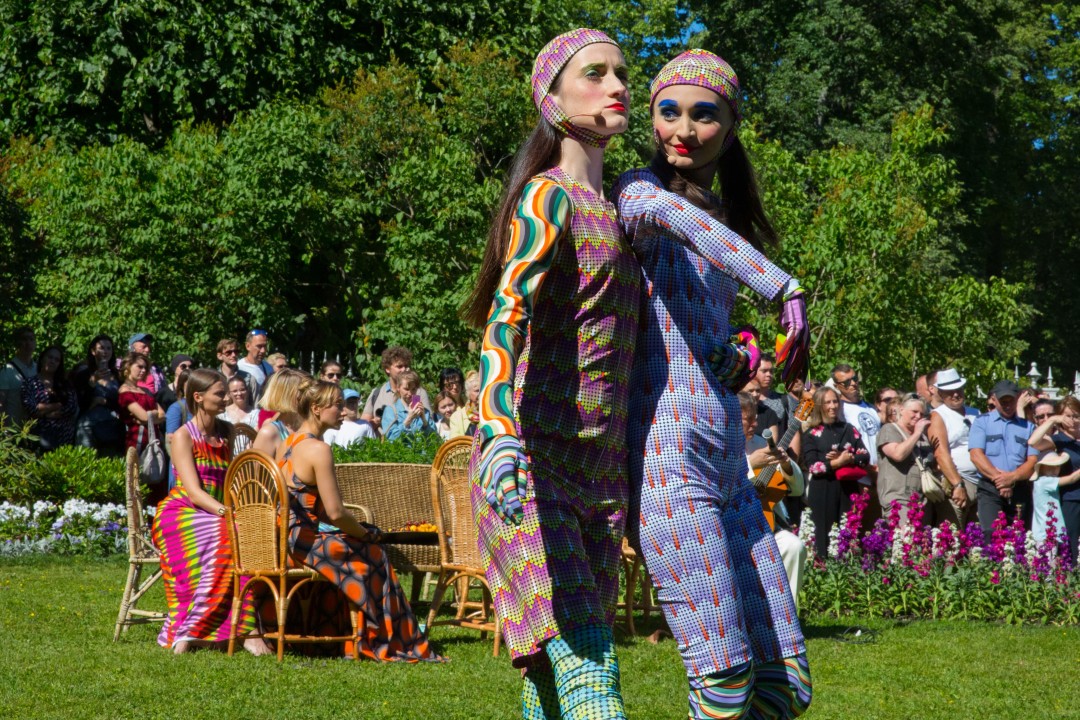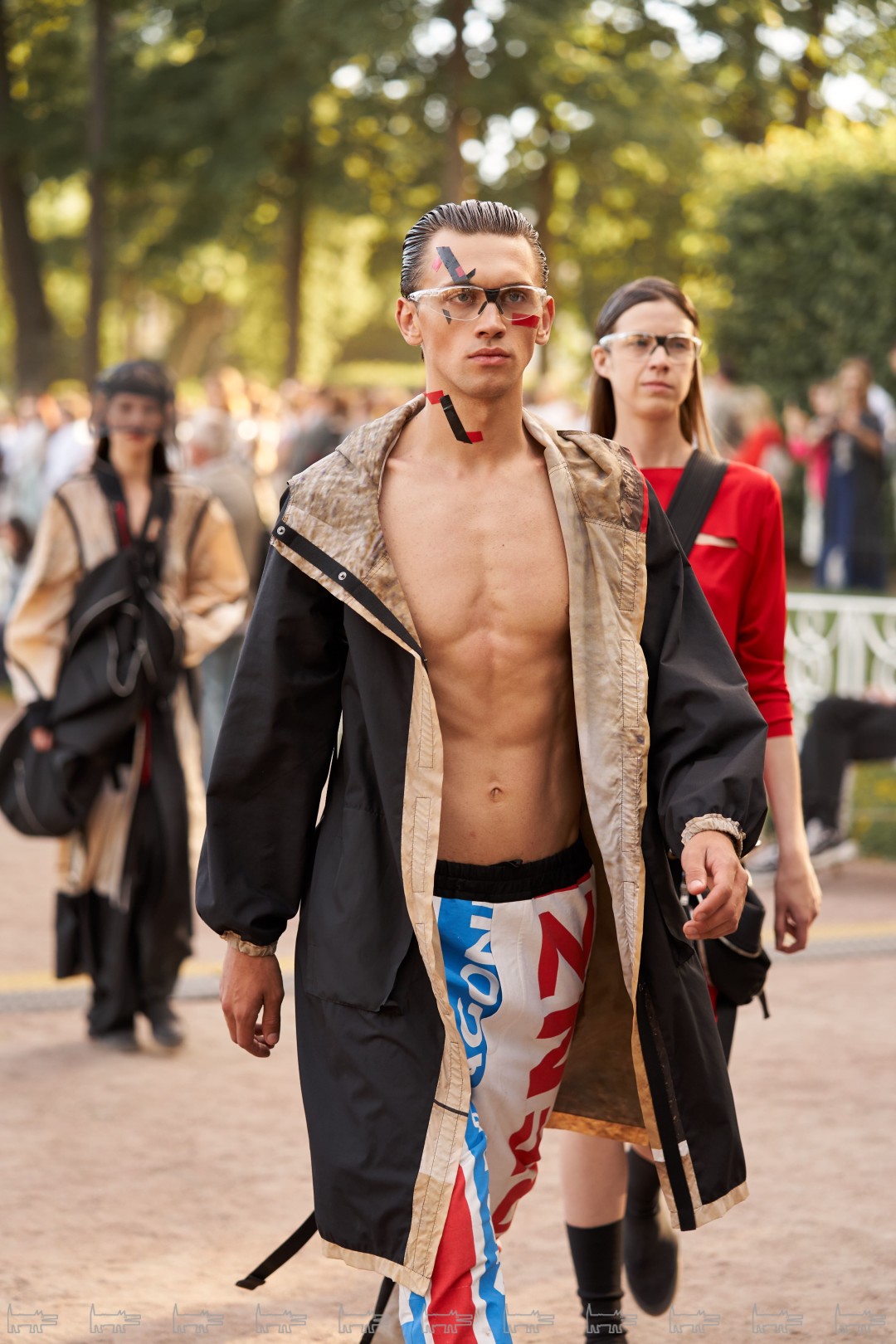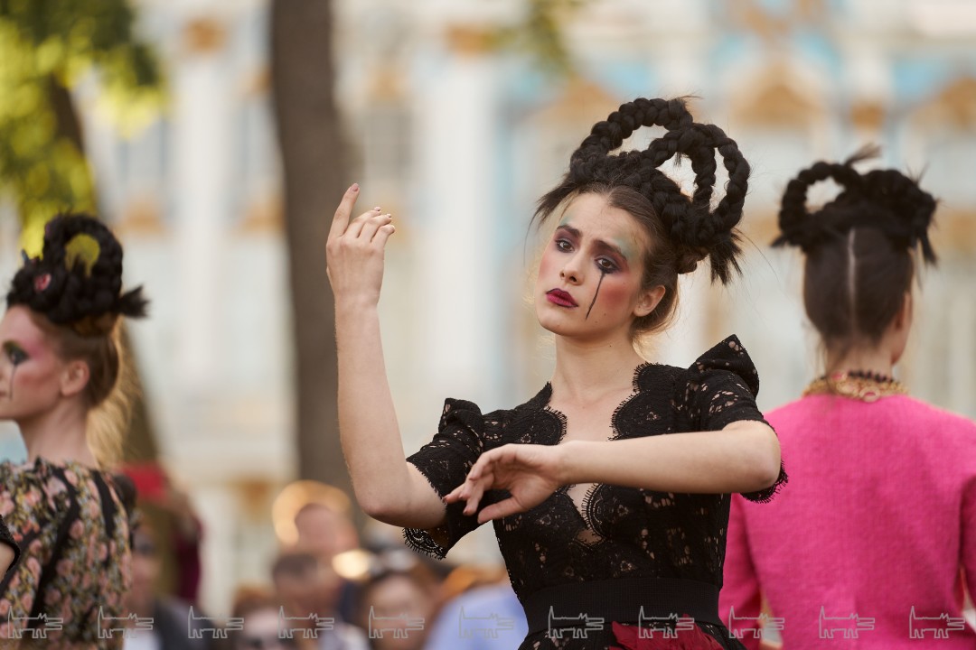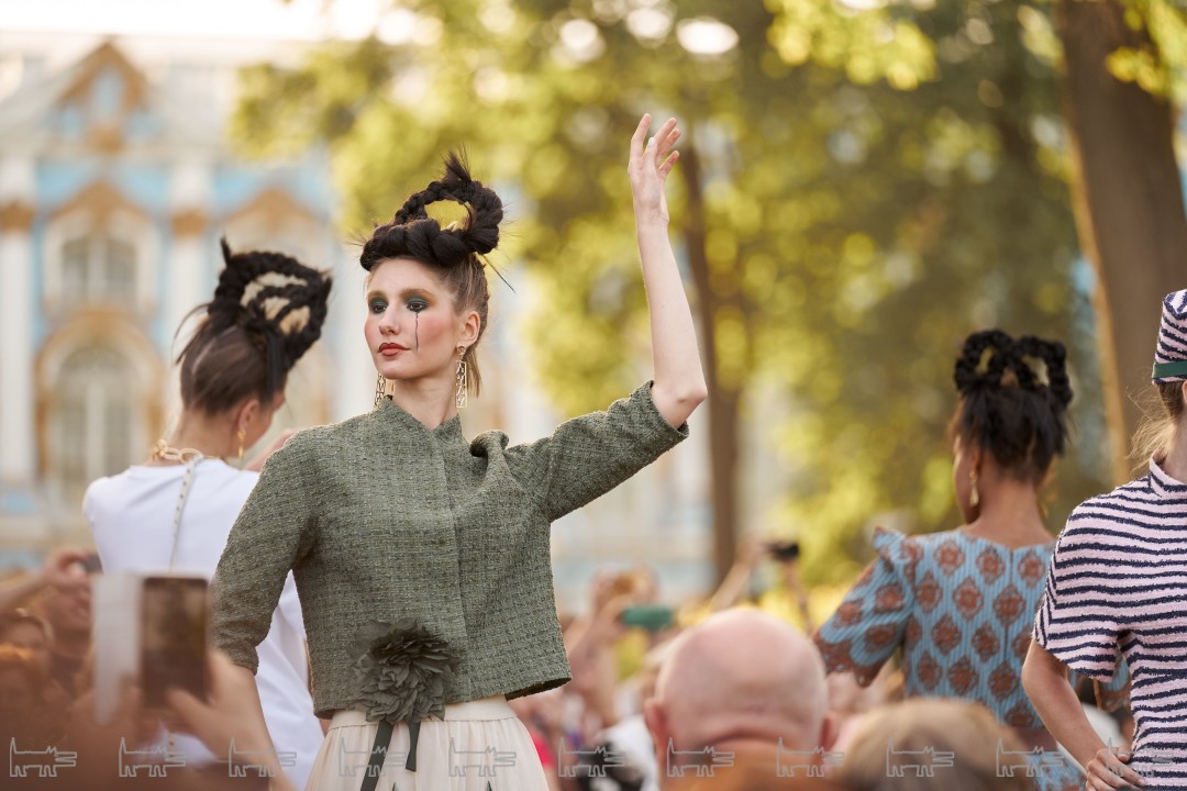 «Уважаемые гости, прозвучал первый звонок. До начала представления осталось 15 минут», — именно с этих слов начинались показы дизайнерских коллекций, разбитые на три театральных акта и прошедшие на разных площадках Екатерининского парка. Татьяне Парфеновой, как и в прошлом году, достался Фрейлинский садик, расположенный рядом с Камероновой галерей: на газоне поставили плетеные стулья и стол, расположили рисованные фигуры чаек. Спустя три звонка на него — в сопровождении звуков гитары — вышел внук Татьяны Валентиновны Платон, прочитавший строчки из чеховской «Чайки»: «Общая мировая душа — это я… я… Во мне душа и Александра Великого, и Цезаря, и Шекспира, и Наполеона, и последней пиявки. Во мне сознания людей слились с инстинктами животных, и я помню все, все, все, и каждую жизнь в себе самой я переживаю вновь!»