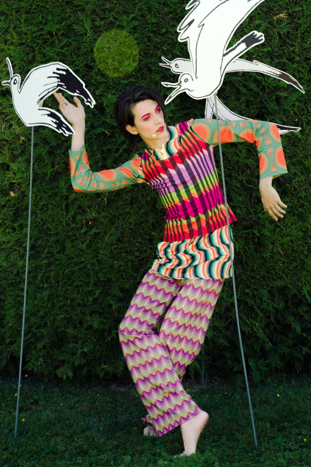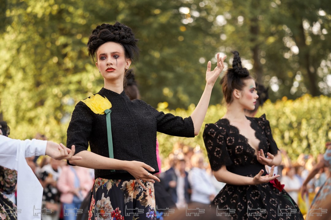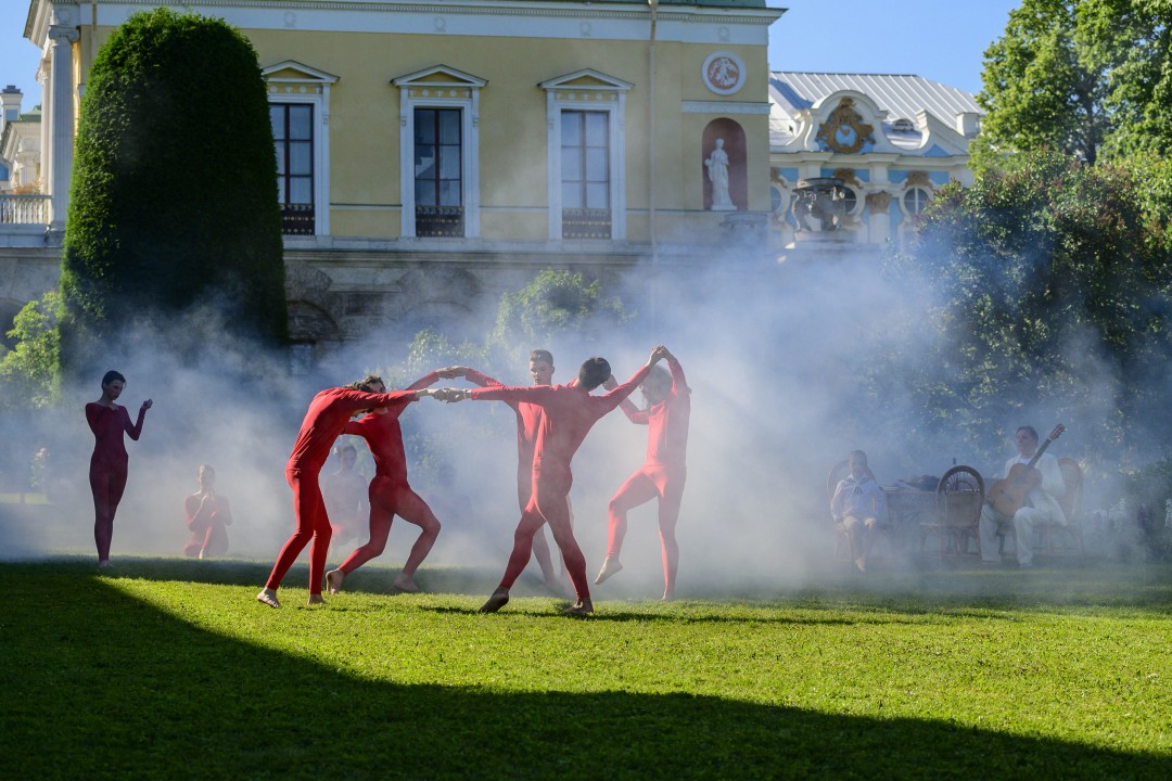 Через мгновение гитарная музыка сменилась стуками барабанов, а на площадке появились персонажи «Танца» Анри Матисса. На парнях и девушках, повторивших движения с культовой картины (которая якобы была написана под впечатлением от русских сезонов Дягилева), были красные костюмы бренда «Тело и Душа» (его Татьяна Парфенова создала вместе с балериной Дианой Вишневой). А после во Фрейлинский садик снова вошли чеховские герои — «Три сестры», которых исполнили сотрудницы модного дома Tatyana Parfionova, и владельцы «Вишневого сада», разыгравшие несколько сцен из пьесы. Для их перфоманса дизайнер переосмыслила образы из осенне-зимней коллекции «Орфизм»: чепчики, платья, юбки и брюки с геометрическими фигурами, будто бы написанными по картинам Сони Делоне, Антону Павловичу наверняка бы понравились!