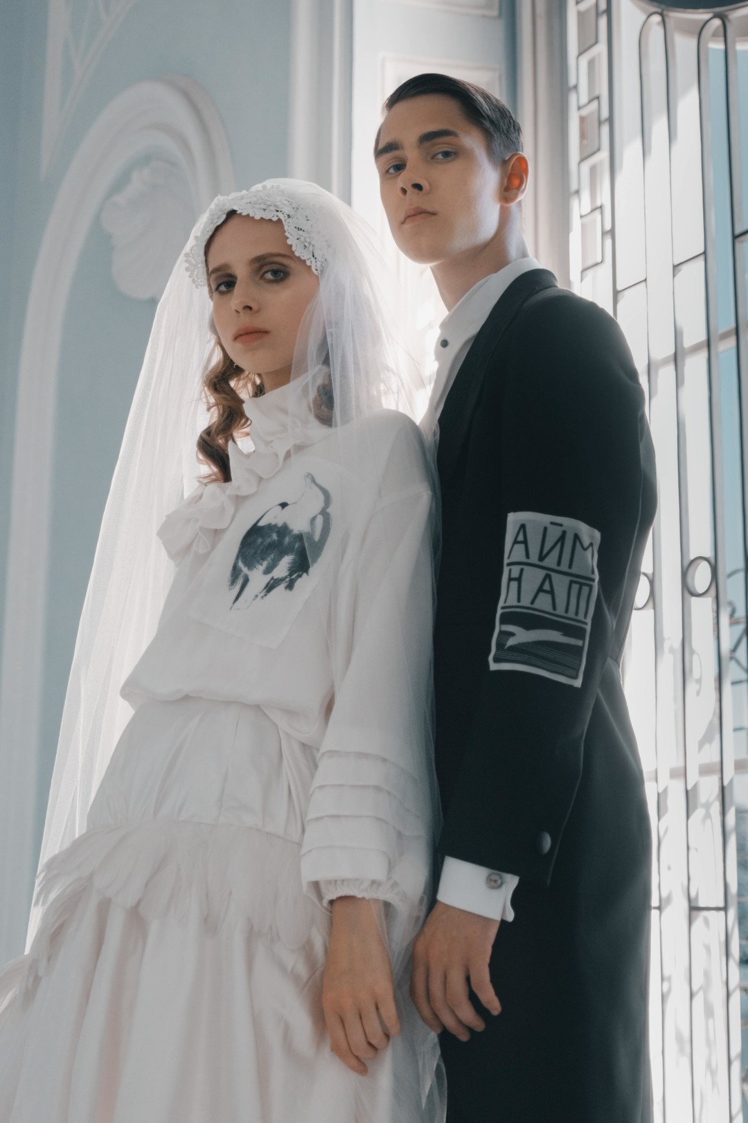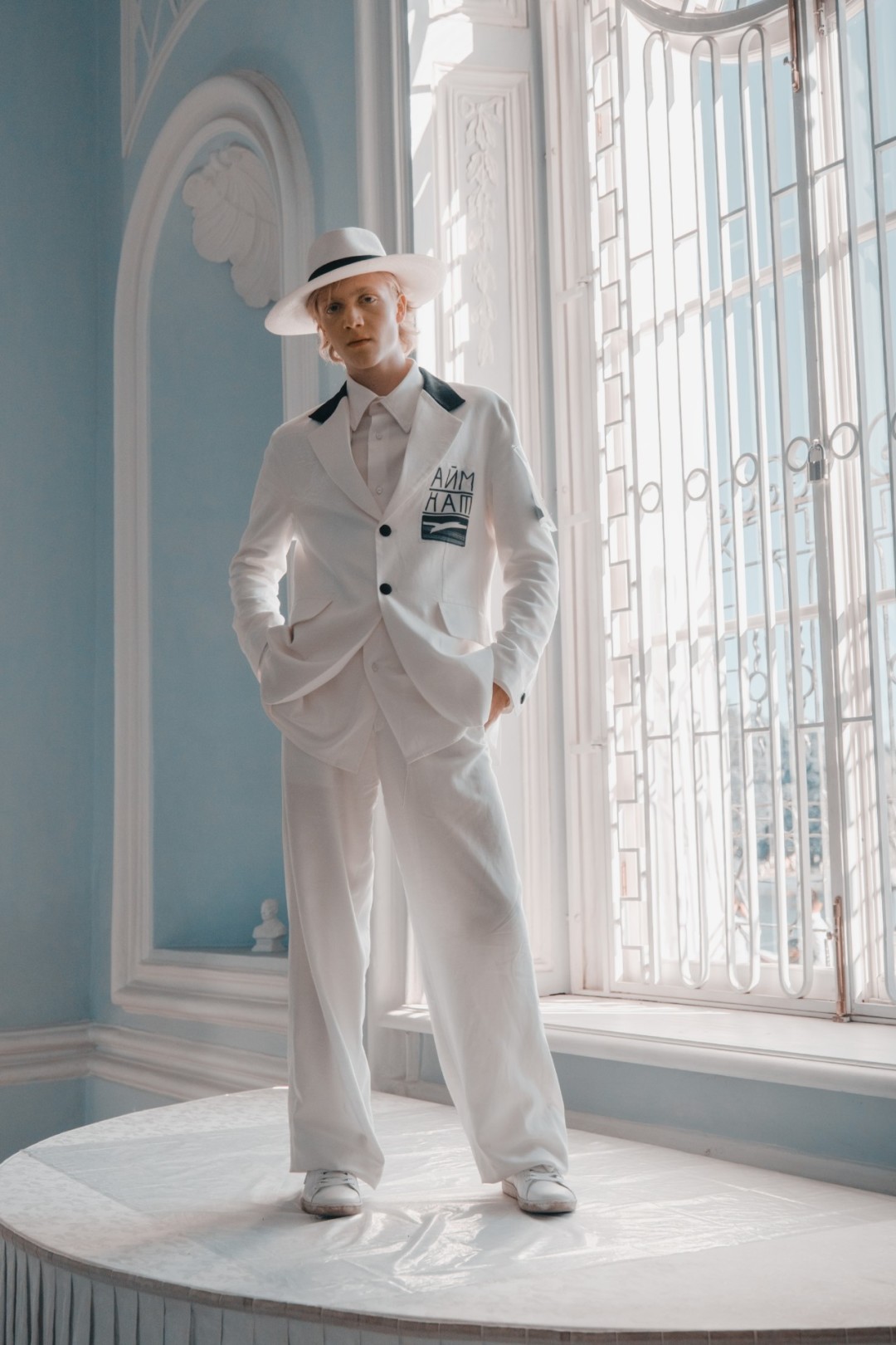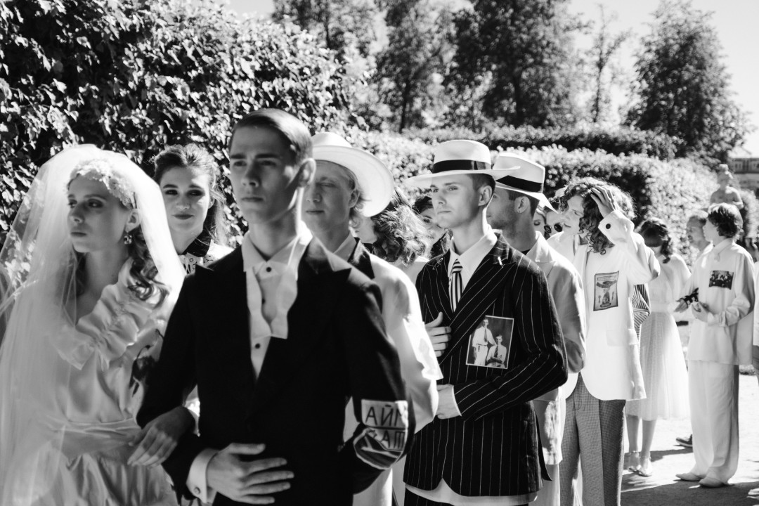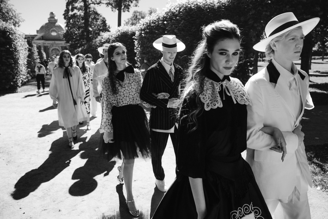 Появления Леонида Алексеева на «Ассоциациях» ждали с особым нетерпением: весной дизайнер перезапустил свой бренд мужской одежды и теперь создает коллекции под лейблом House of Leo. И если в рамках дебютного показа в Москве он размышлял на тему «папиного» гардероба, то здесь, как и Татьяна Парфенова, взял за основу произведения Чехова. Перед зрителями на Эрмитажной аллее, на которую выходят окна Екатерининского дворца, развернулись сцены из пьесы драматурга «Свадьба»: невеста в белом платье с рюшами и жених в дендистском черном костюме веселились под аккомпанемент Jazz Philharmonic Orchestra и в сопровождении многочисленных друзей. На одежде некоторых из них можно было заметить эмблему и фотографии из архивов МХАТа: по задумке Леонида Алексеева, который с детства мечтал побывать в московском театре, а спустя несколько лет придумал для него костюмы по «Запискам Пиквикского клуба» Чарльза Диккенса, показ должен был напоминать студенческий «капустник». «Актеры художественного театра каждое лето выезжали за город, где проводили время на природе, перевоплощаясь в своих персонажей, и часто придумывали целые спектакли. В окружении зелени сам Чехов часто читал им наброски своих пьес и раздавал будущие роли», — рассказывал дизайнер в процессе подготовки к шоу.