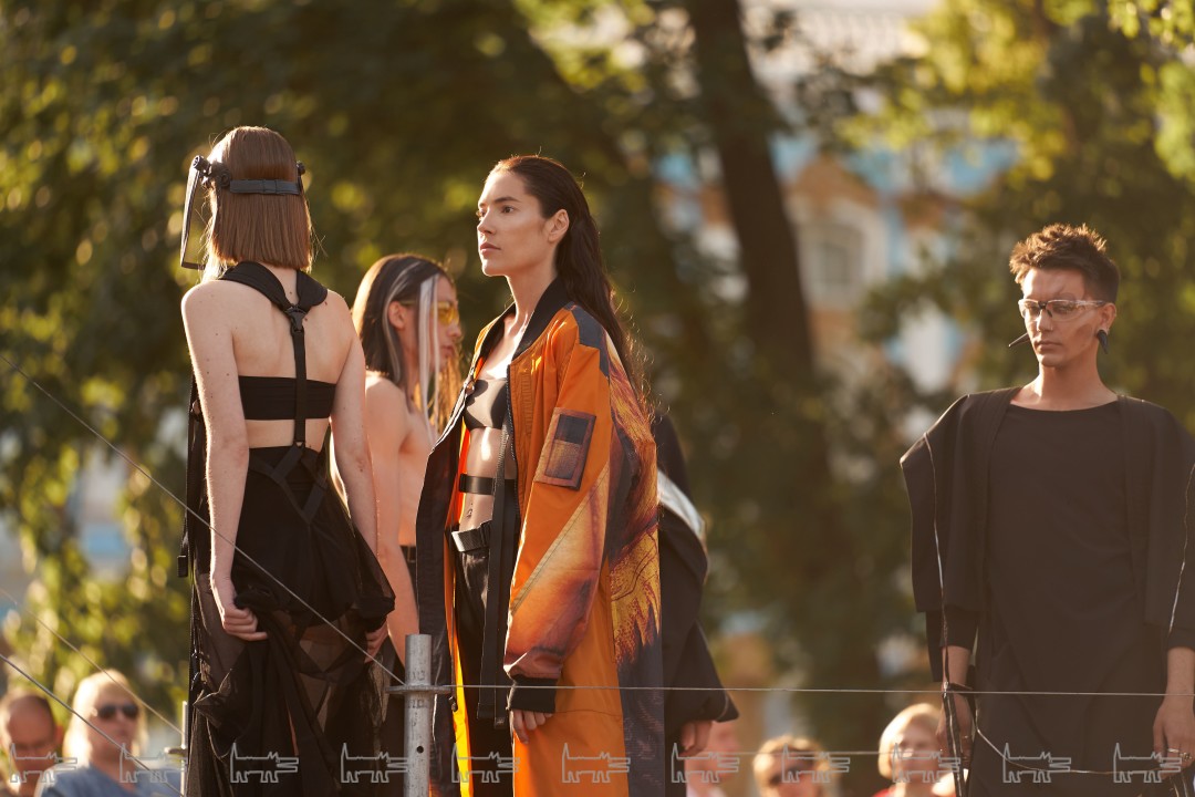 Если Лилия Киселенко вернулась к любимому тотал-блэку (на прошлых «Ассоциациях» она демонстрировала каракулевые мундиры, костюмы из золотой парчи, юбки с кринолином и платья с вышитыми бутонами), то Янис Чамалиди, наоборот, от него отошел. В его коллекции, показанной на металлической конструкции на Зеркальном прудике, впервые за долгое время появились яркие оттенки — оранжевый, синий и даже огненно-красный. Так дизайнер обозначил переход индивидуума («человека линейного пространства: вот пол, вот потолок, вот бог и дьявол, белое и черное») к дивидууму («персонаж нового века, на стыке времен»), который произошел в 1920-е годы, во время авангардного театра. «Делез говорил, что "дивидуум" — это человек расстроенный, а я хочу сказать что личность "дивидуума" многогранна и нуждается в изучении! В сущности, мы все такие, в нас много скрытых, нереализованных импульсов, которые мы могли бы творчески трансформировать. Раньше человек забивал это в себя, говорил себе "нет". Но сегодня мир изменился, и для новых ролей нам нужна новая концепция одежды», — объяснил идею показа Янис.
