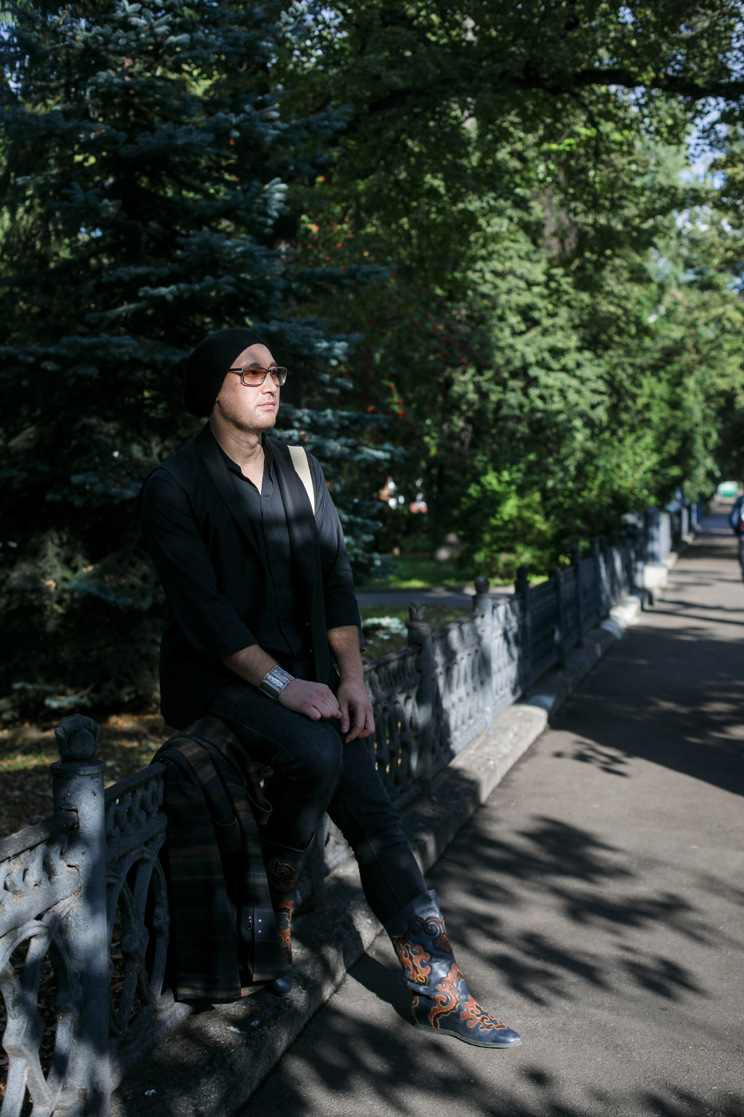 Входящий с прошлого года в ТОП-10 этно-дизайнеров России Султан Салиев переосмысливает и использует национальные элементы не только в своих коллекциях для подиума и клиентов. Одна из любимых вещей в его собственном гардеробе – сапоги, сшитые вручную мастером Арского промысла Айратом в старинной татарской технике кожаной мозаики, которые он смело сочетает с джинсами, одеждой в стиле кэжуал и авторскими пальто.