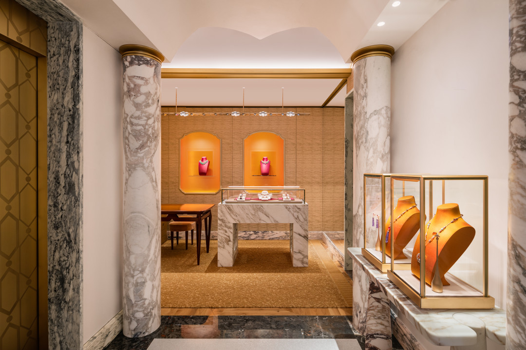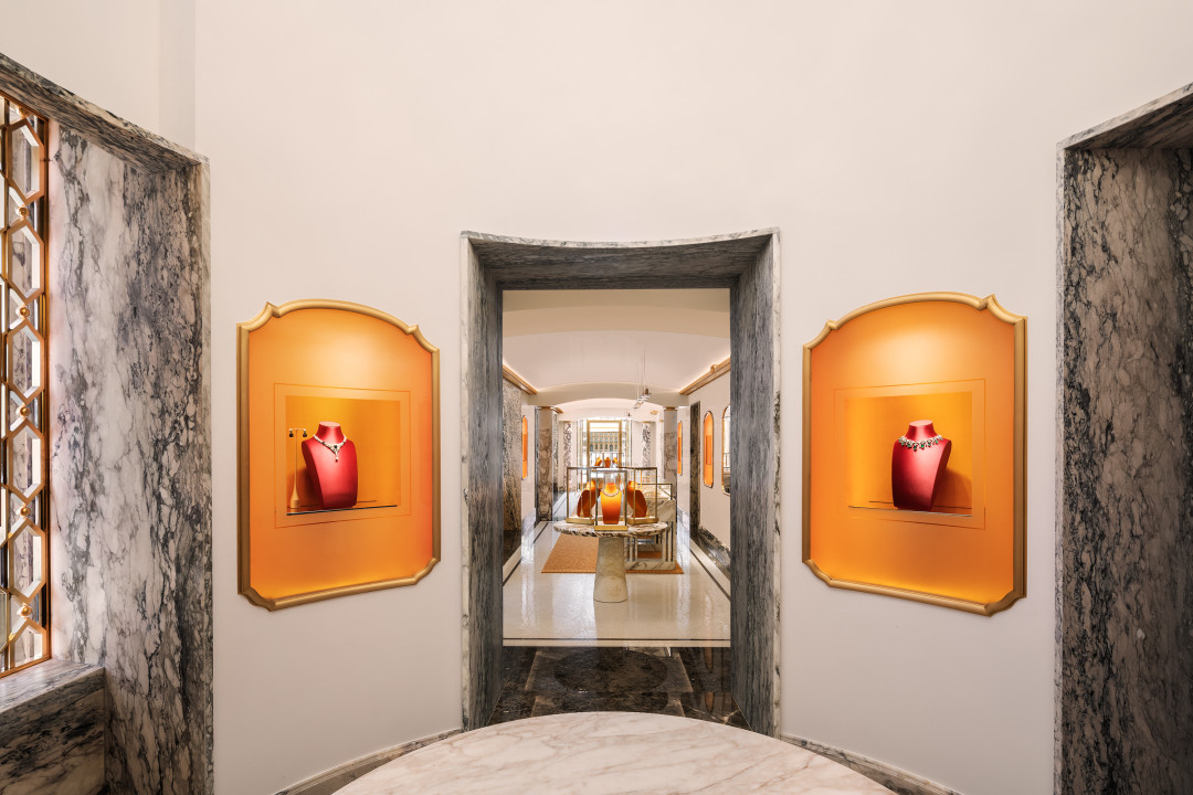 Некоторые предметы интерьера вообще прибыли в Париж из Рима. Пара колонн у входа в бутик, две красные вазы из порфира и инкрустированный консольный стол первоначально должны были украшать именно римский бутик. Также в продолжении темы столицы Италии — ее изображения на стенах авторства канадского фотографа Николаса Руэля и люстра 60-ых годов архитектора Джио Понти.