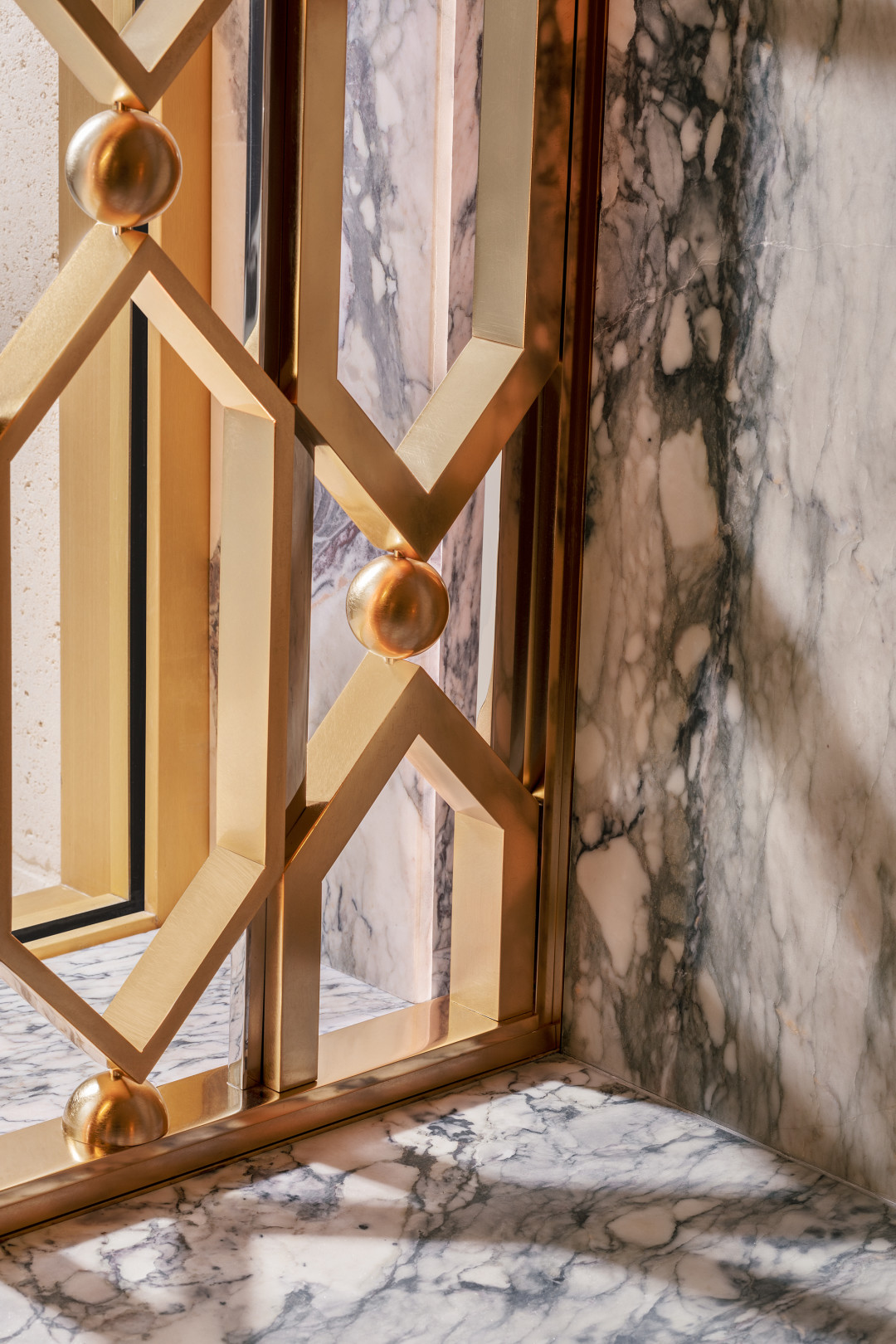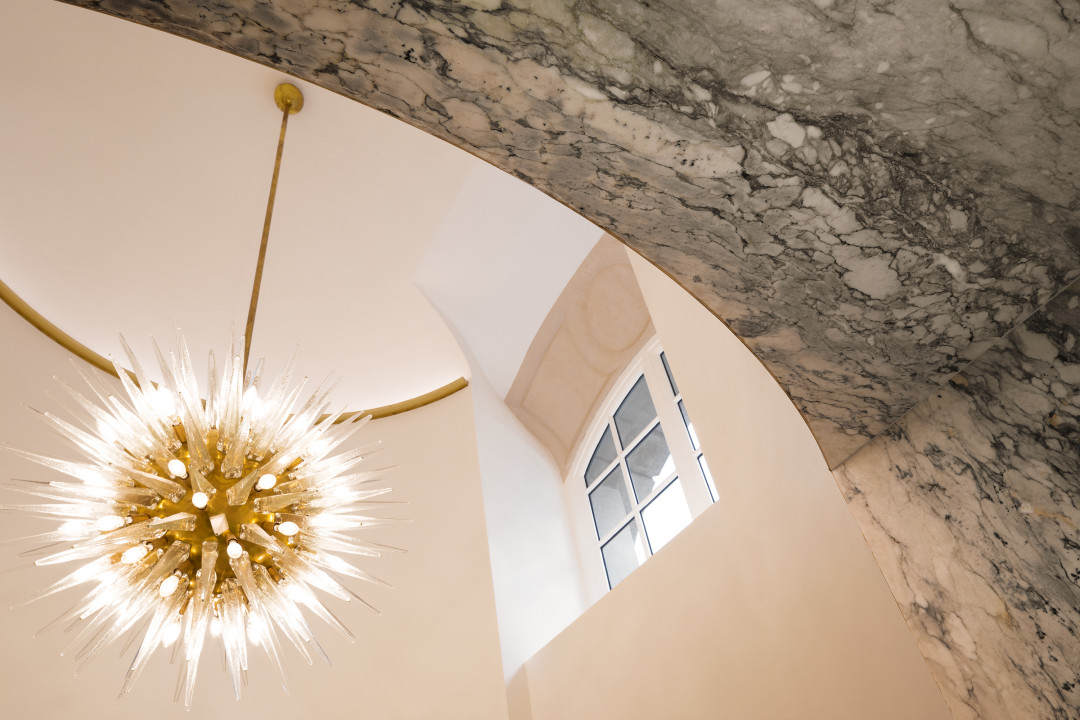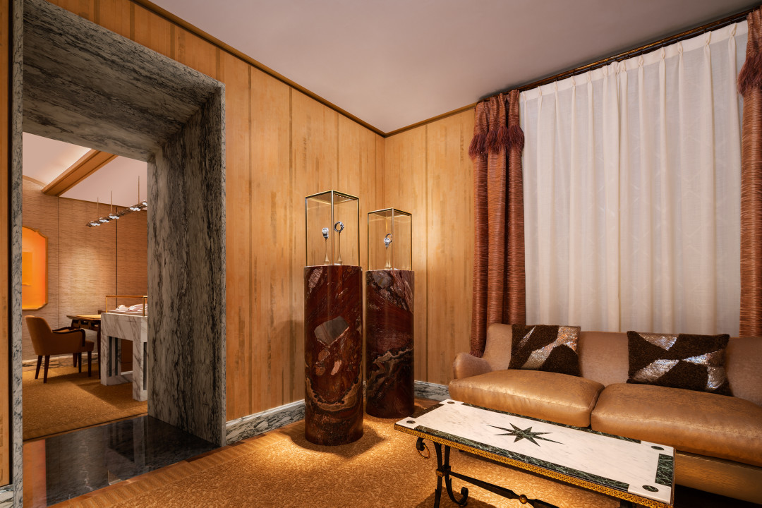 Например, один из источников освещения украшен мотивом, перекликающимся со знаменитой площадью Пьяцца дель Кампидольо работы Микеланджело в Риме, а выбранные Марино материалы: ореховое дерево, сияющие железо и латунь, шелк и бархат, призваны передать ощущение тепла и радости столицы Италии. Первый этаж бутика украшает мозаика, выложенная итальянскими мастерами-ремесленниками, а граненая плавающая лестница с геометрическими мраморными ступенями, обрамленная шестиугольной сеткой из латуни и нержавеющей стали, отсылает к украшениям Bvlgari. А именно — к винтажному браслету Bvlgari 30-х годов.