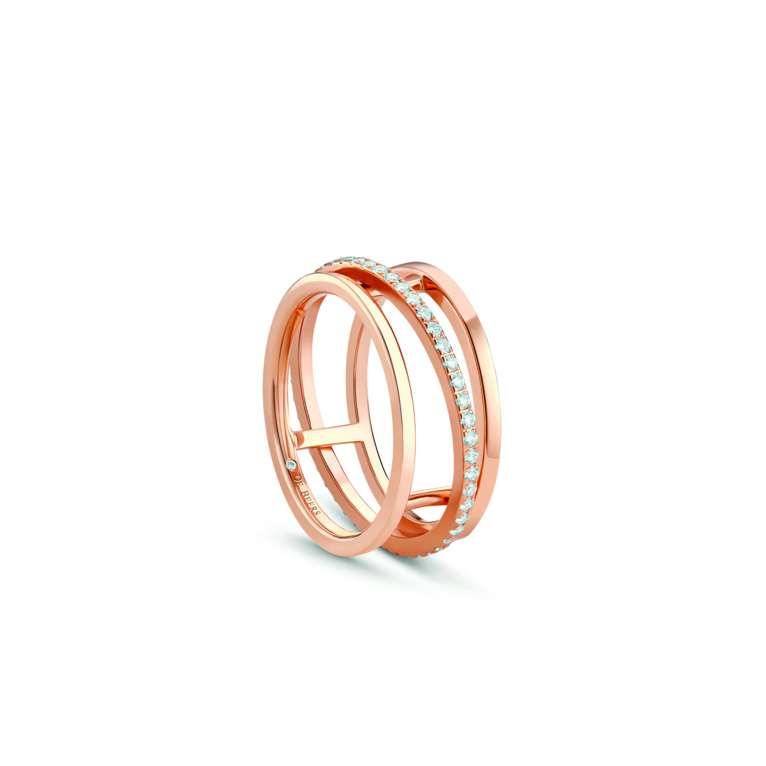 Одна из главных в мире компаний по добыче алмазов даже некрупные камни оформляет эстетски — например, как бриллиантовую дорожку между двух внешних колец из розового золота.