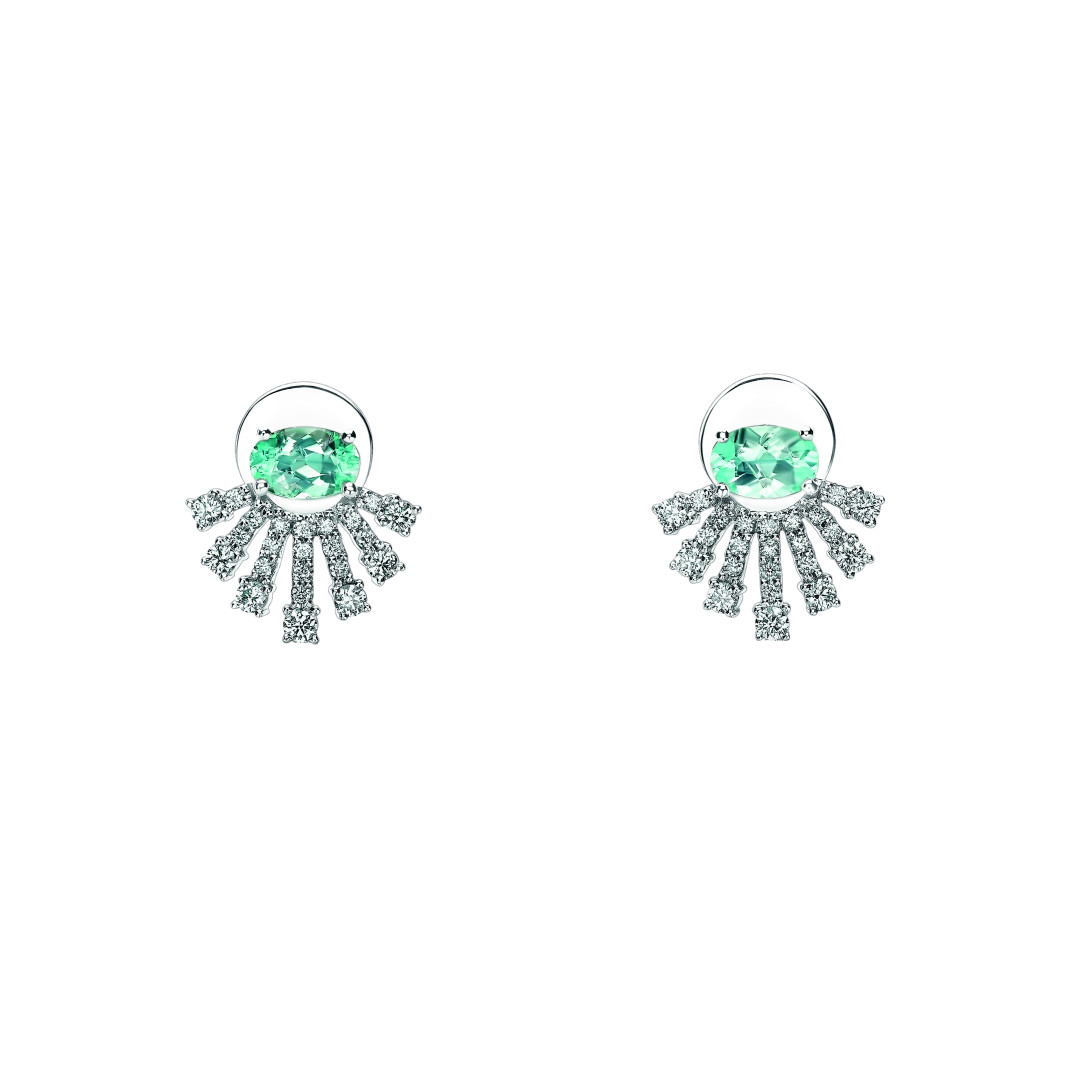 Турмалины параиба общим весом почти в 2,5 карата можно носить отдельно как серьги-гвоздики или подсветить гало из бриллиантовых лучей.