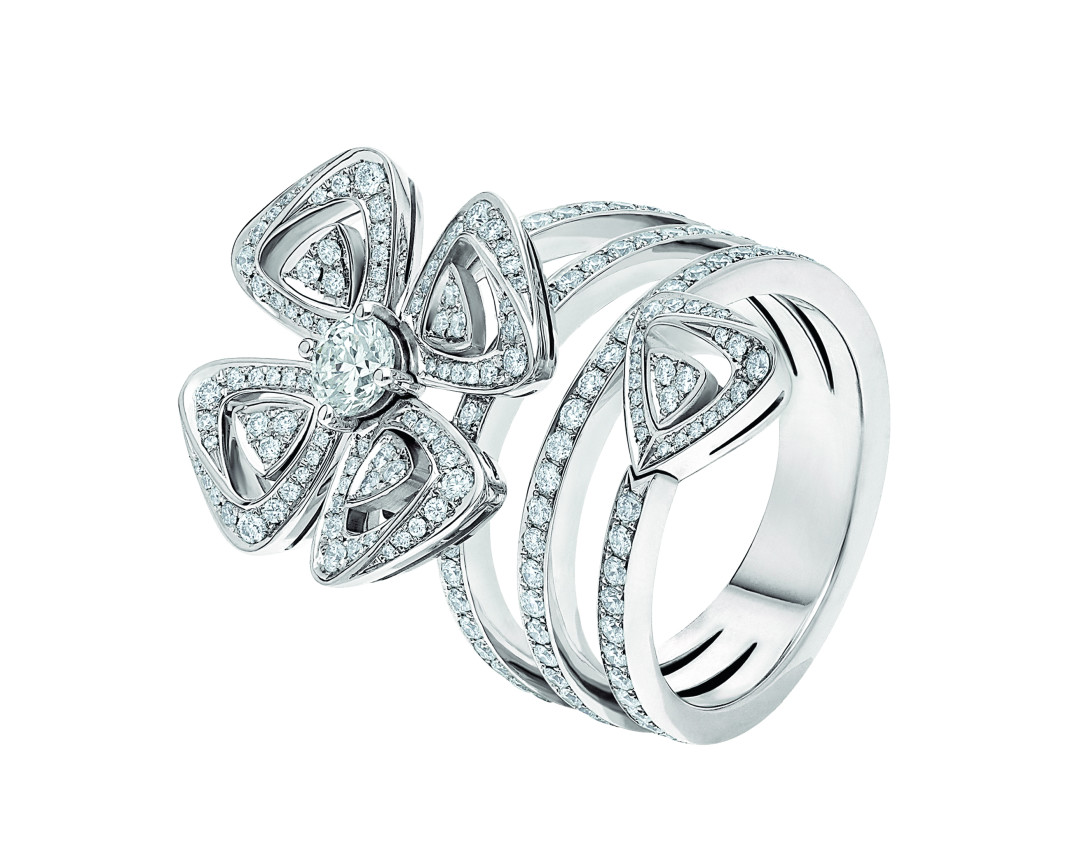 Драгоценный приз для всех любителей сирени: сезон четырехлепестковой флоры во всех отношениях технично продлевает Bvlgari. Цветок из белого золота распустился на новых украшениях коллекции Fiorever, включая кольцо в три охвата, браслет со спрятанным замком, серьги-трансформеры и шестикаратное колье, подвеску которого можно отстегнуть и носить как брошь.
