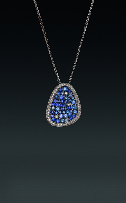 В кулоне из белого золота буквально на весу закреплен двумя крапанами сапфир весом 0,2 карата. (все адреса в Петербурге)