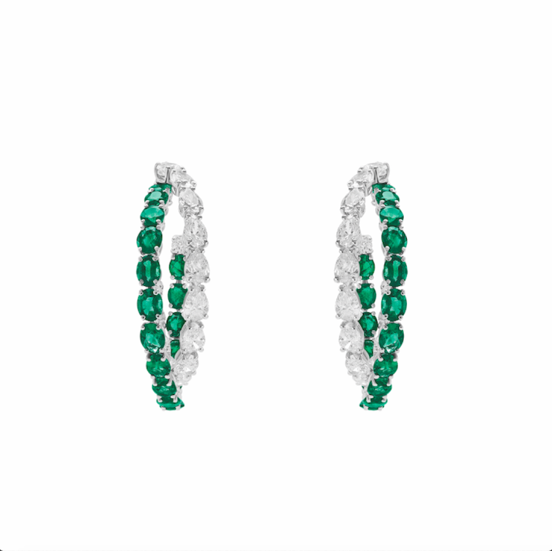 Гидропонику в жизнь! Поддерживаем эту идею серьгами из белого золота с бриллиантами огранки груша и похожими на зелень горошка овальными изумрудами.