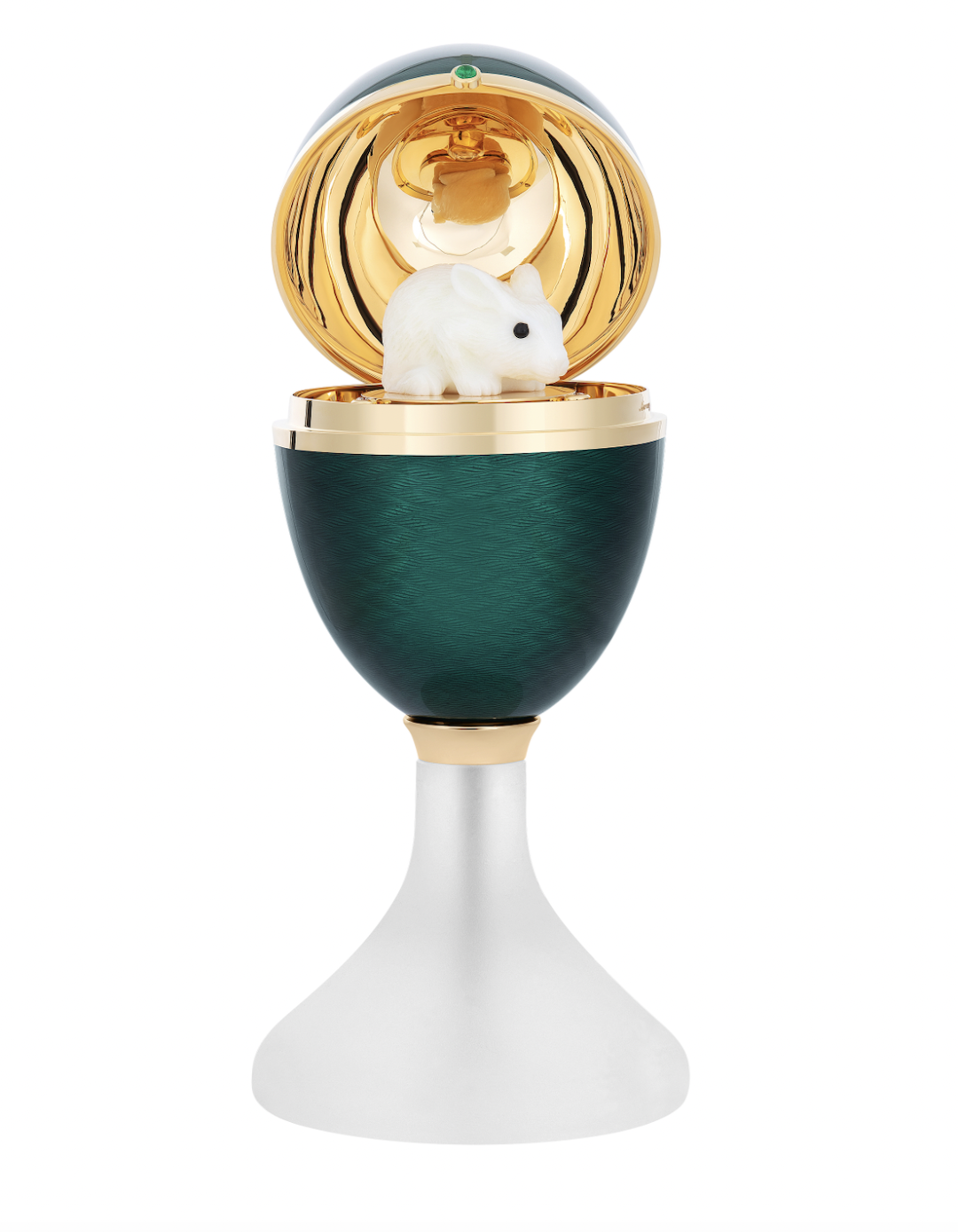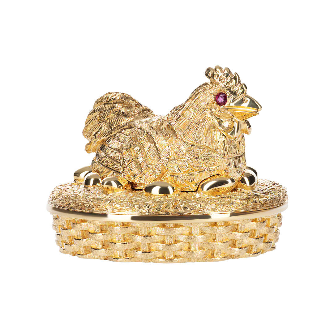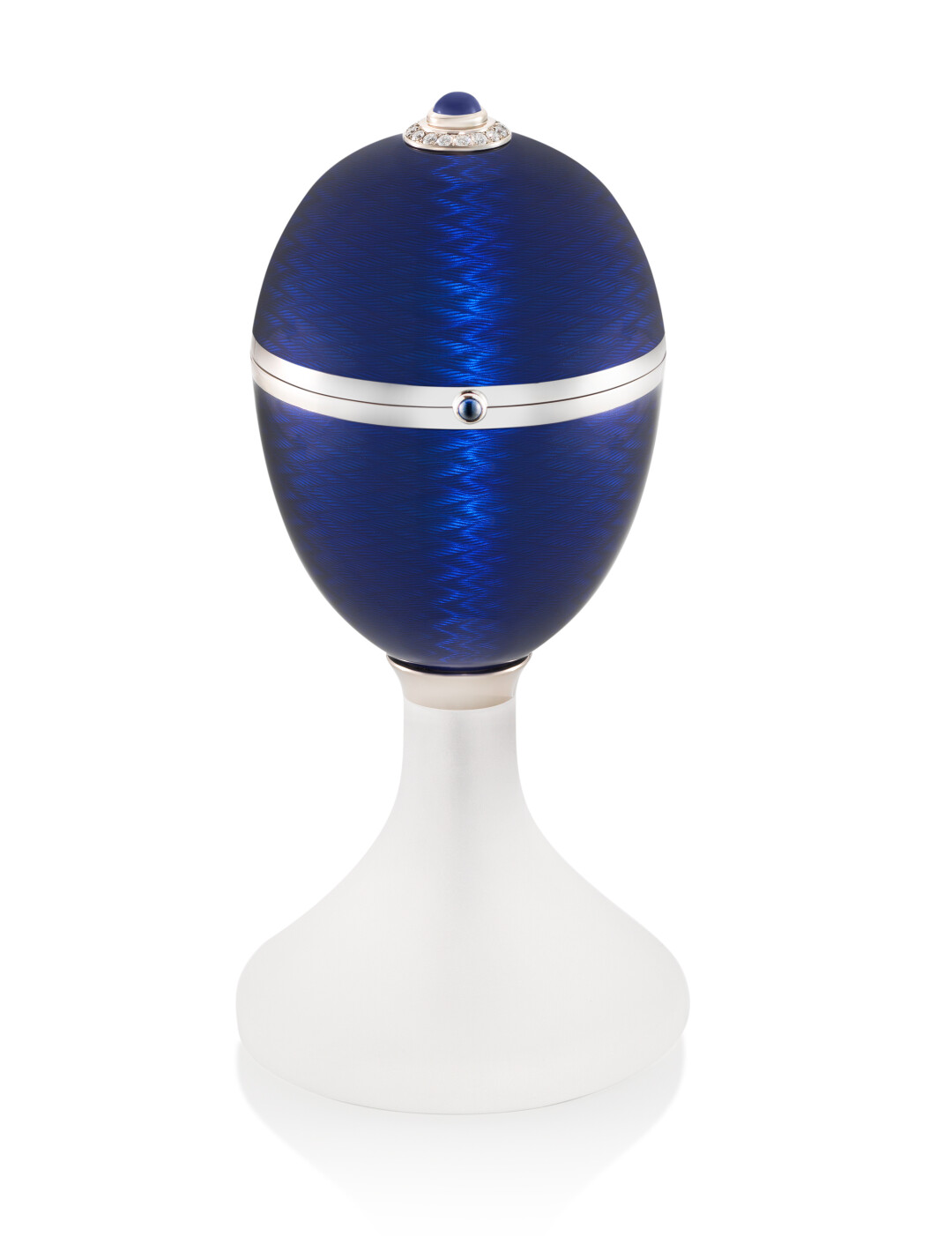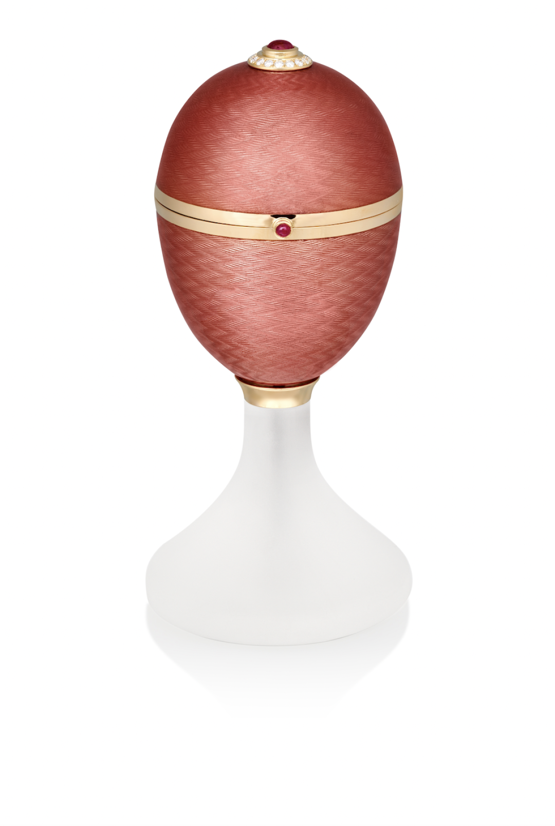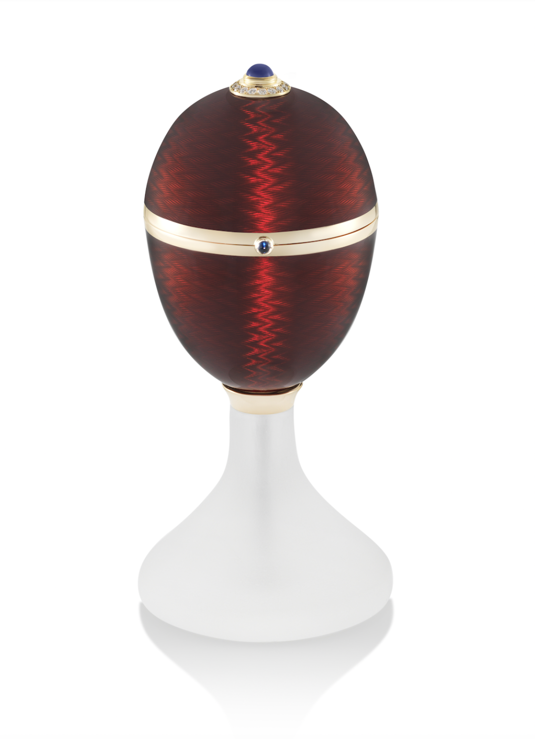 Сувенирные настольные яйца выполнены из золота и также покрыты перегородчатой эмалью разного цвета. Кроме того, они украшены драгоценными камнями: сапфирами, рубинами, изумрудами и бриллиантами. По желанию к ювелирному яйцу можно добавить сюрприз — дополнить его медведем из агата и бриллиантов, зайцем из белого опала и оникса или курицей в гнезде из золота и рубинов. Сувенирное яйцо можно использовать как шкатулку.