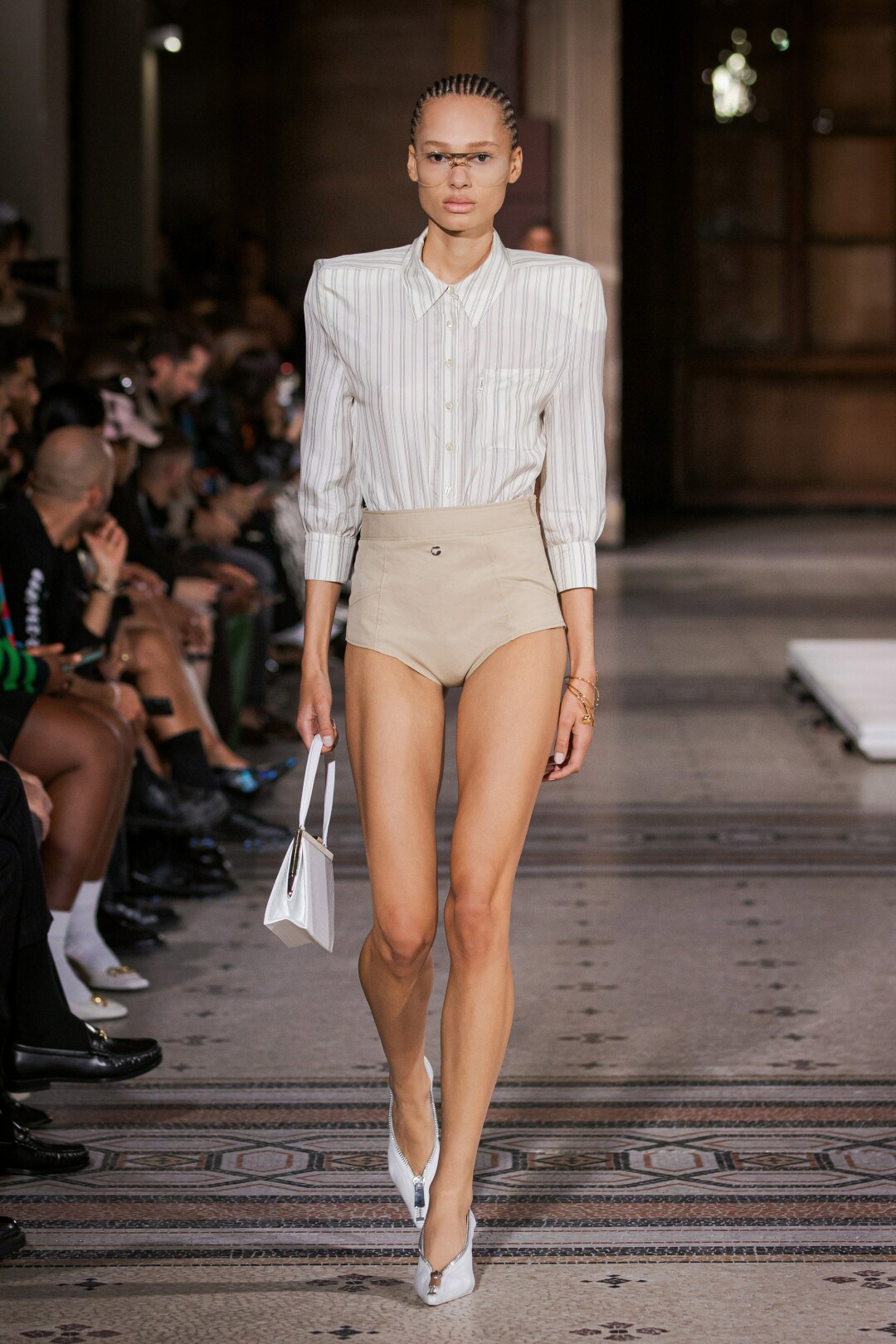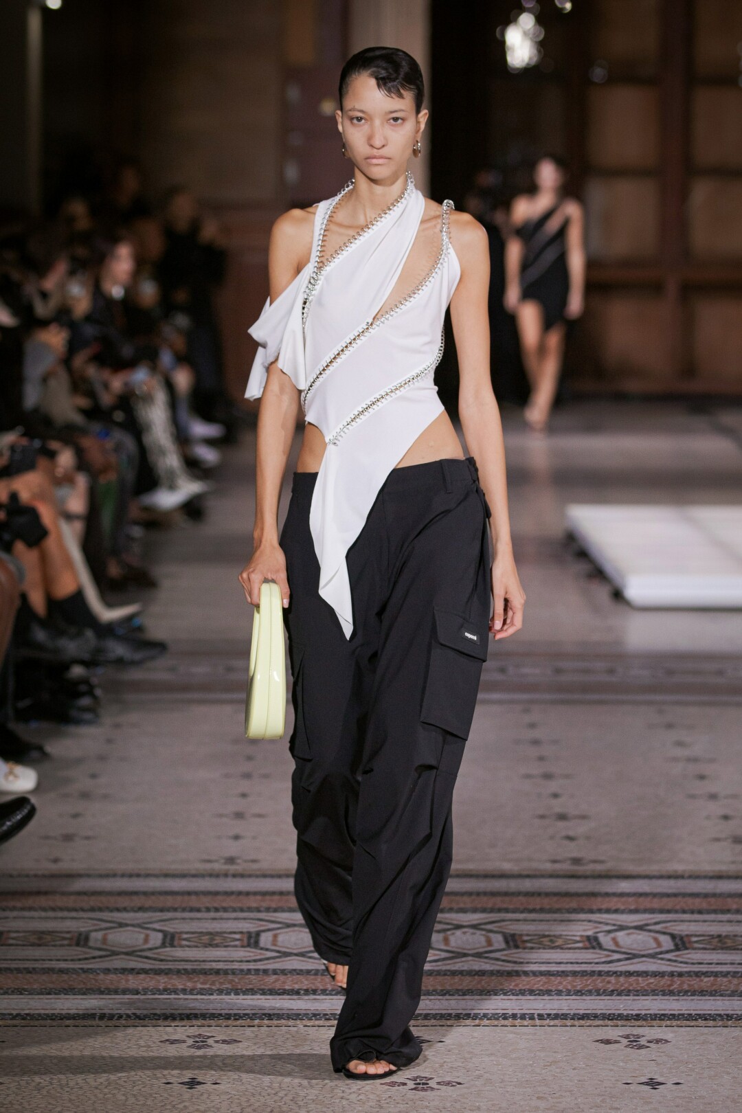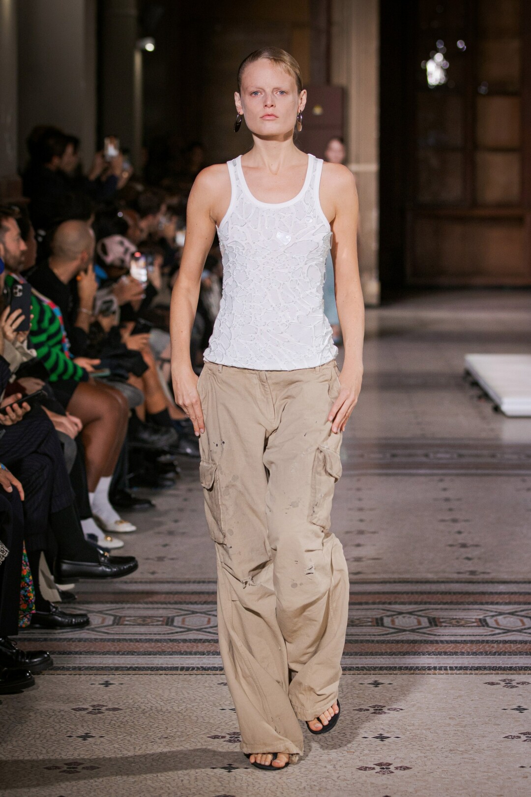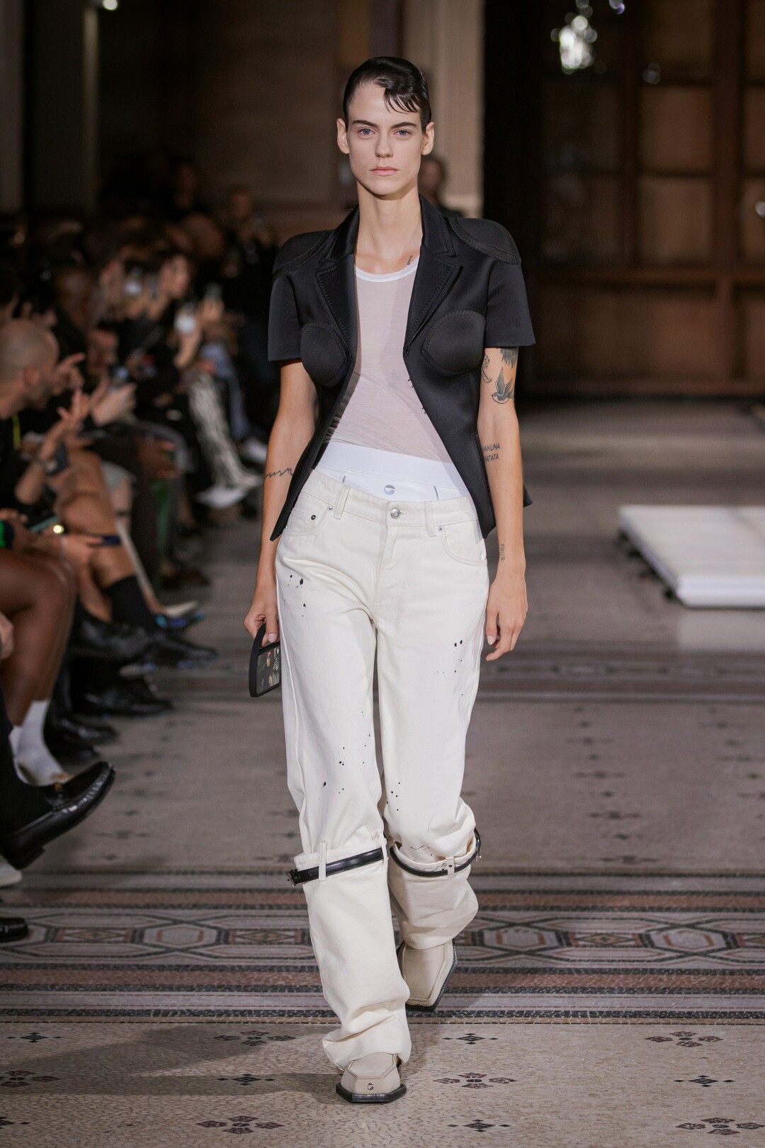 Кто ж теперь помнит, что до момента, когда Белла в стрингах приняла хлопковый душ Шарко, Себастьян Мейер и Арно Вайан вообще-то показали стоящую коллекцию. Были жакеты с увесистыми плечами в стиле роблокс, лихо скроенные топы из ленты и молний, джинсы с поясами на лодыжках и нарядные платья из битого стекла. Не говоря уже об ожерелье-наушниках, очках без дужек и сумке Swipe из кило чистого золота.