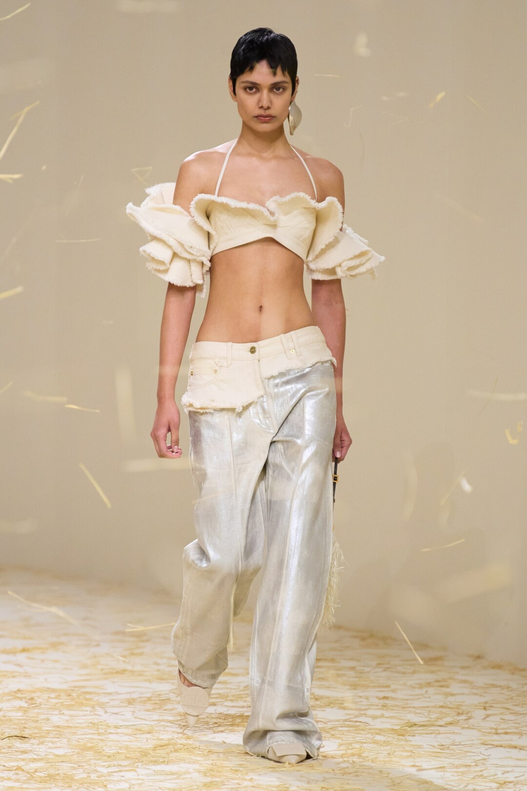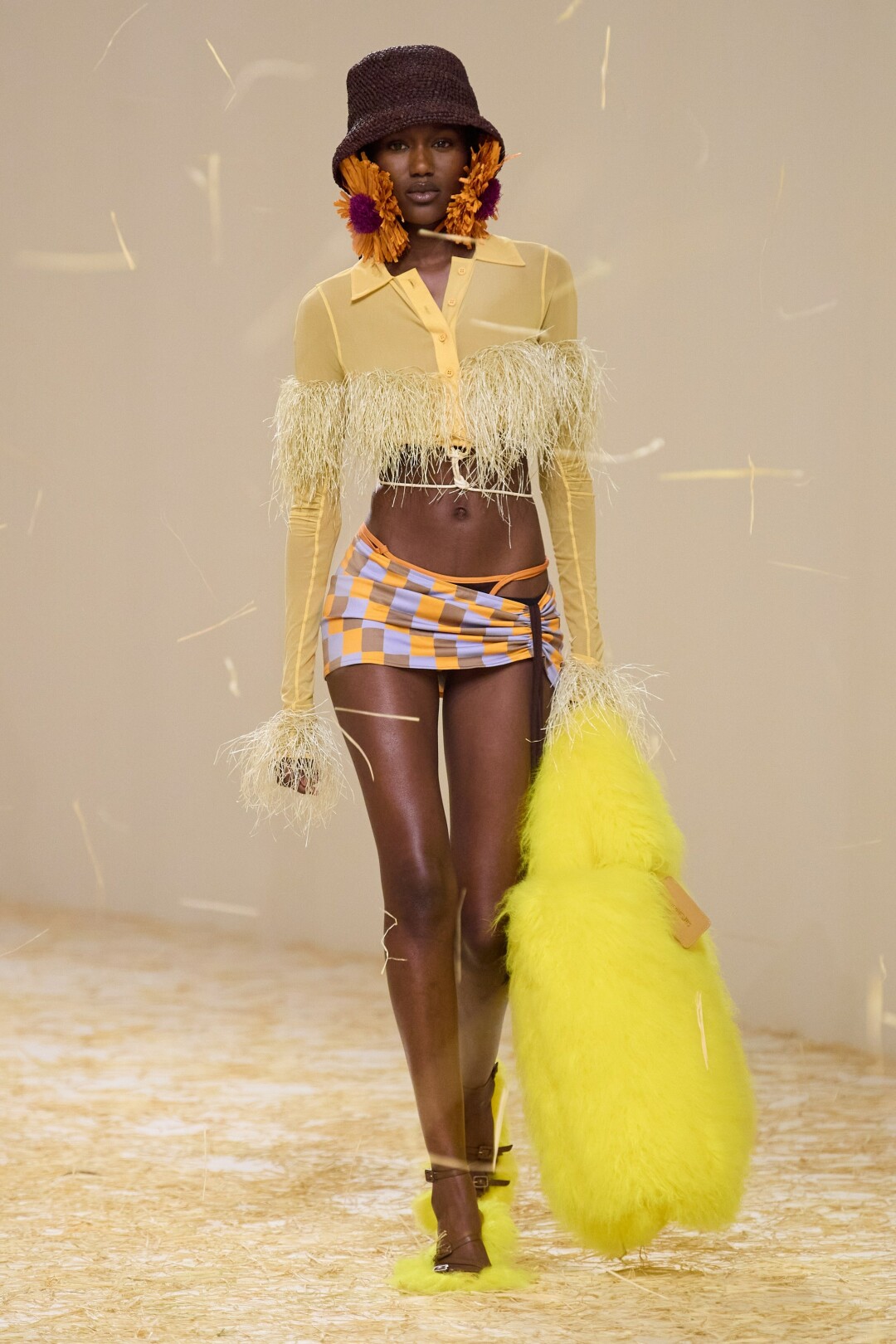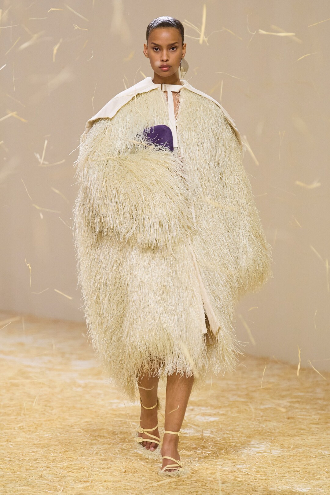 По сути Жакмюс предлагает нам перья из сена: те же приемы с пушистыми манжетами, порхающими топами и целым летящим манто (коллаб с Lesage), только не для для предновогоднего party season, а для теплого деревенского вечера. Дизайнер утверждает, что думал о девушках на Капри и в Портофино, но подпирать щечки подсолнухами (ок, маргаритками) можно и на курортах Краснодарского края.