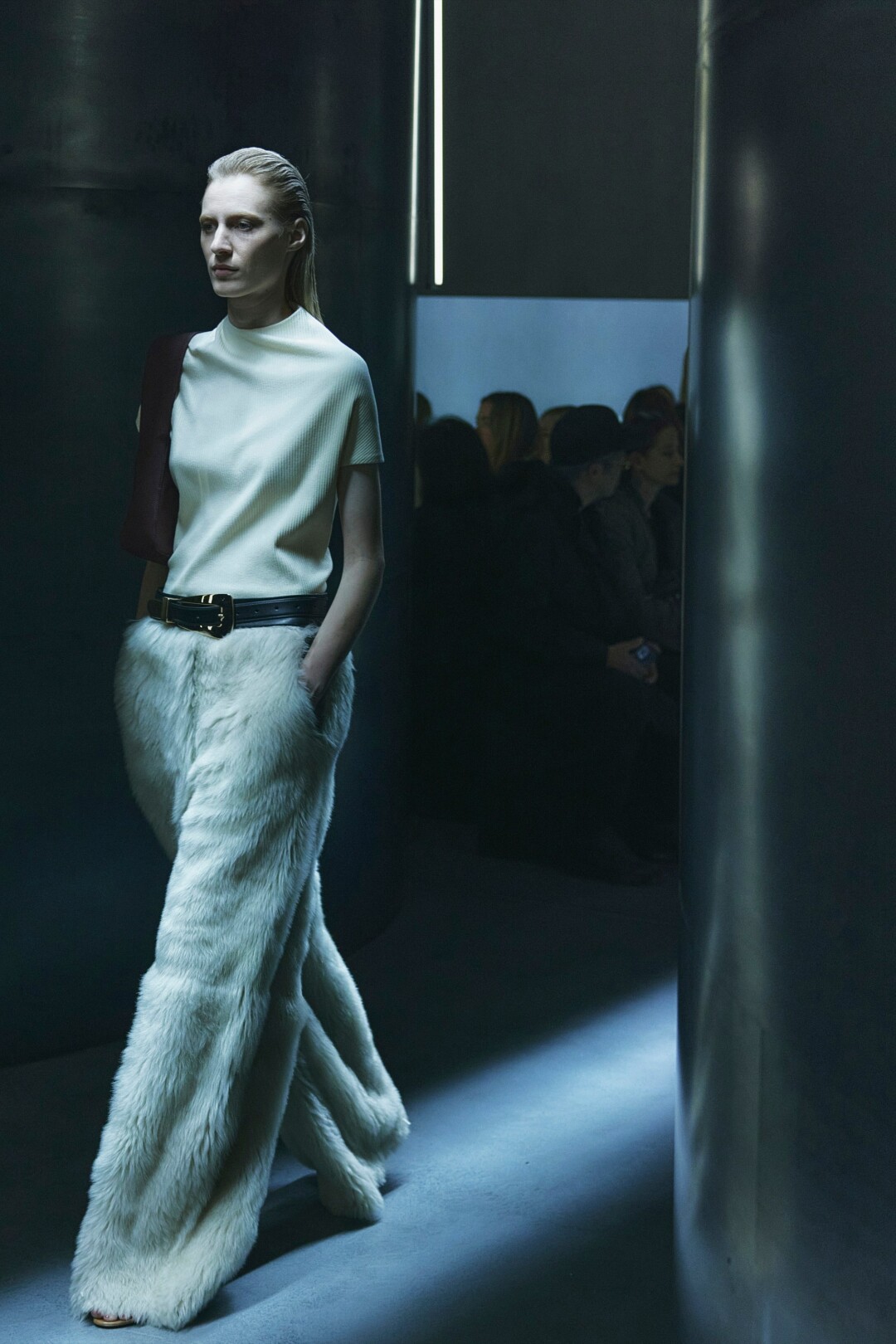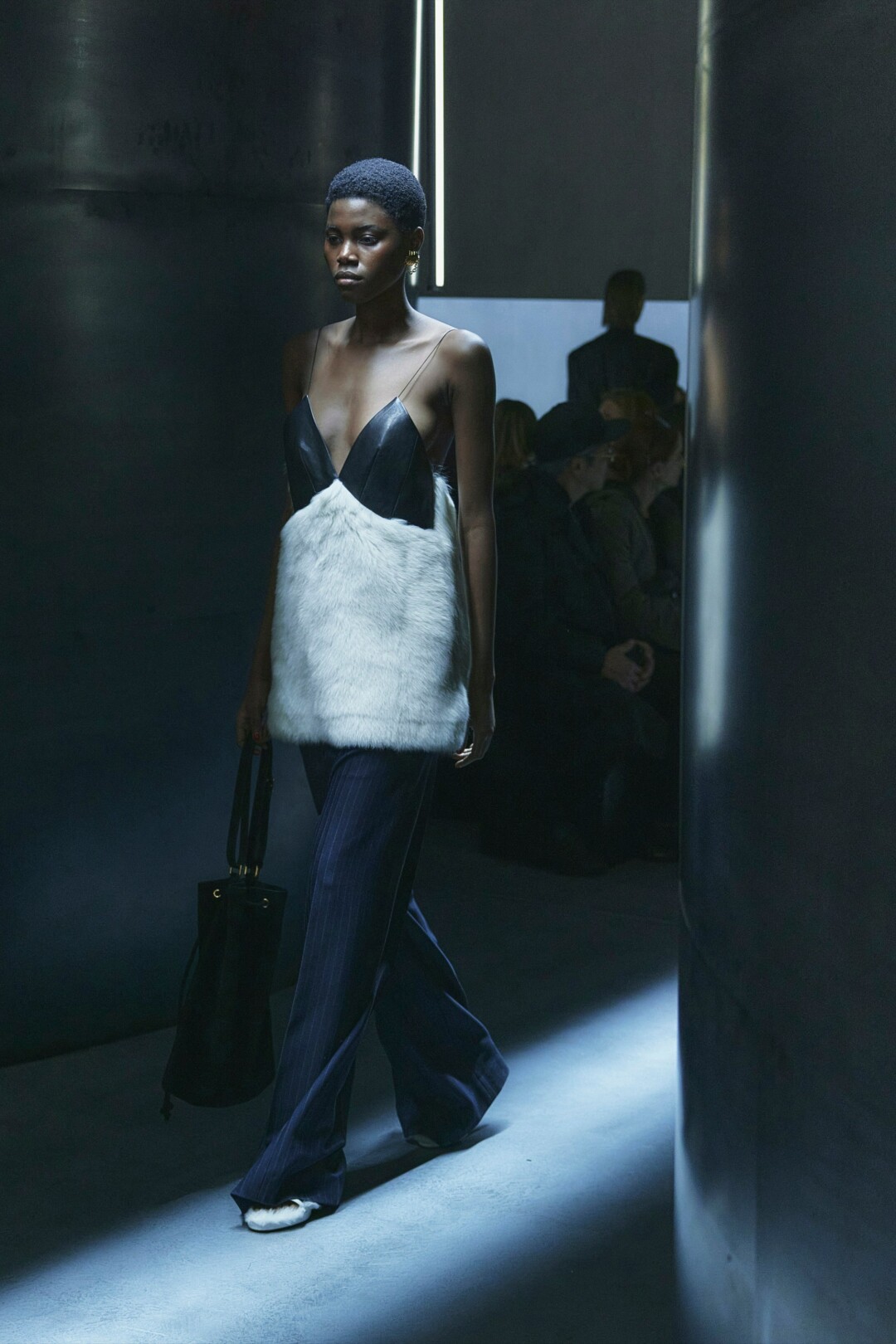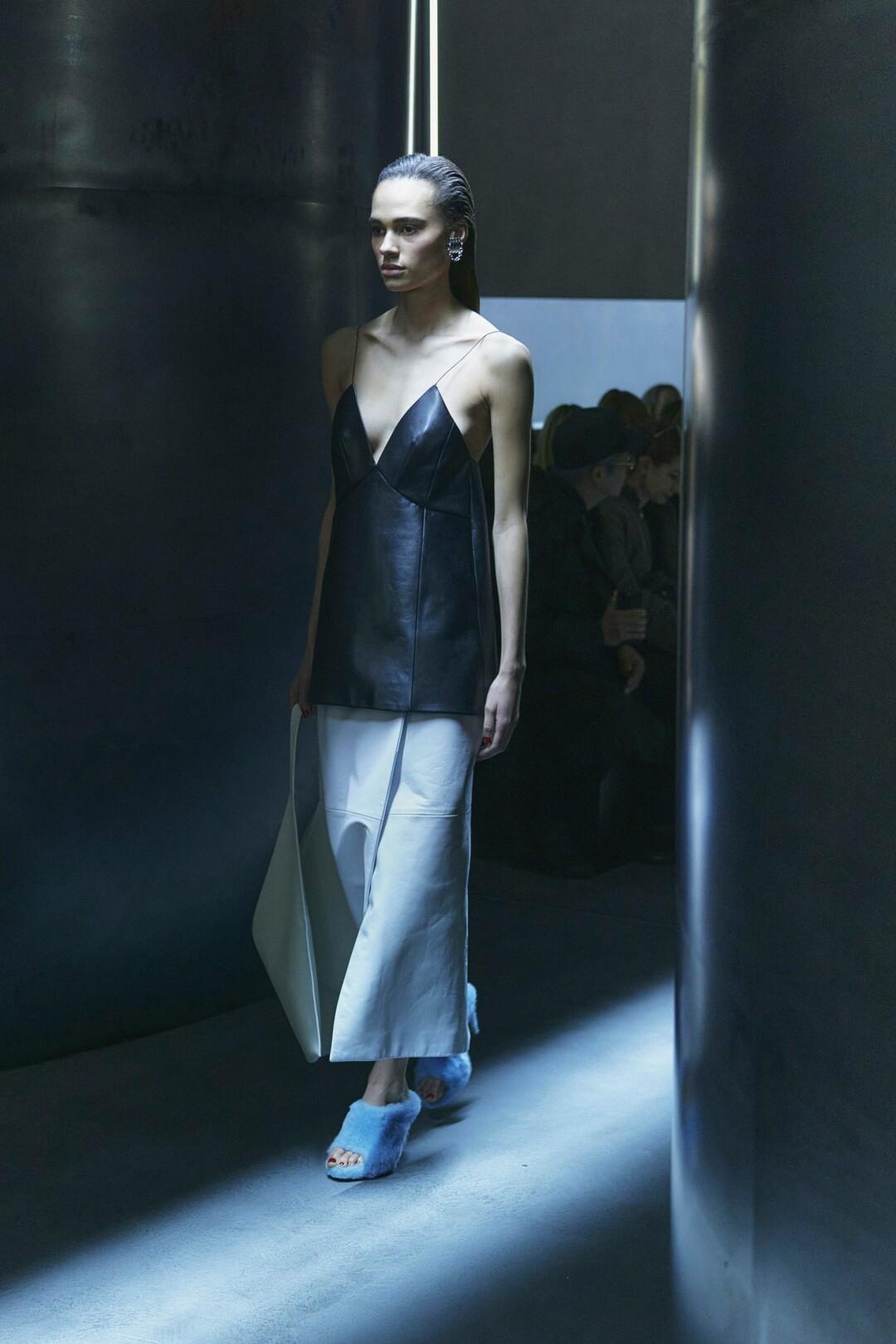 Осенне-зимняя коллекция Khaite, выросшего в хедлайнера нью-йоркской недели моды, для властных и теплолюбивых. Доминировать предлагается в черных кожаных пиджаках и кожаных юбках, а греться – в кашемировом комбинезоне, а также в меховых пальто, топах, мюлях и даже брюках. По замыслу автора, коллекция транслирует контролируемую, а не декларативную сексуальность.