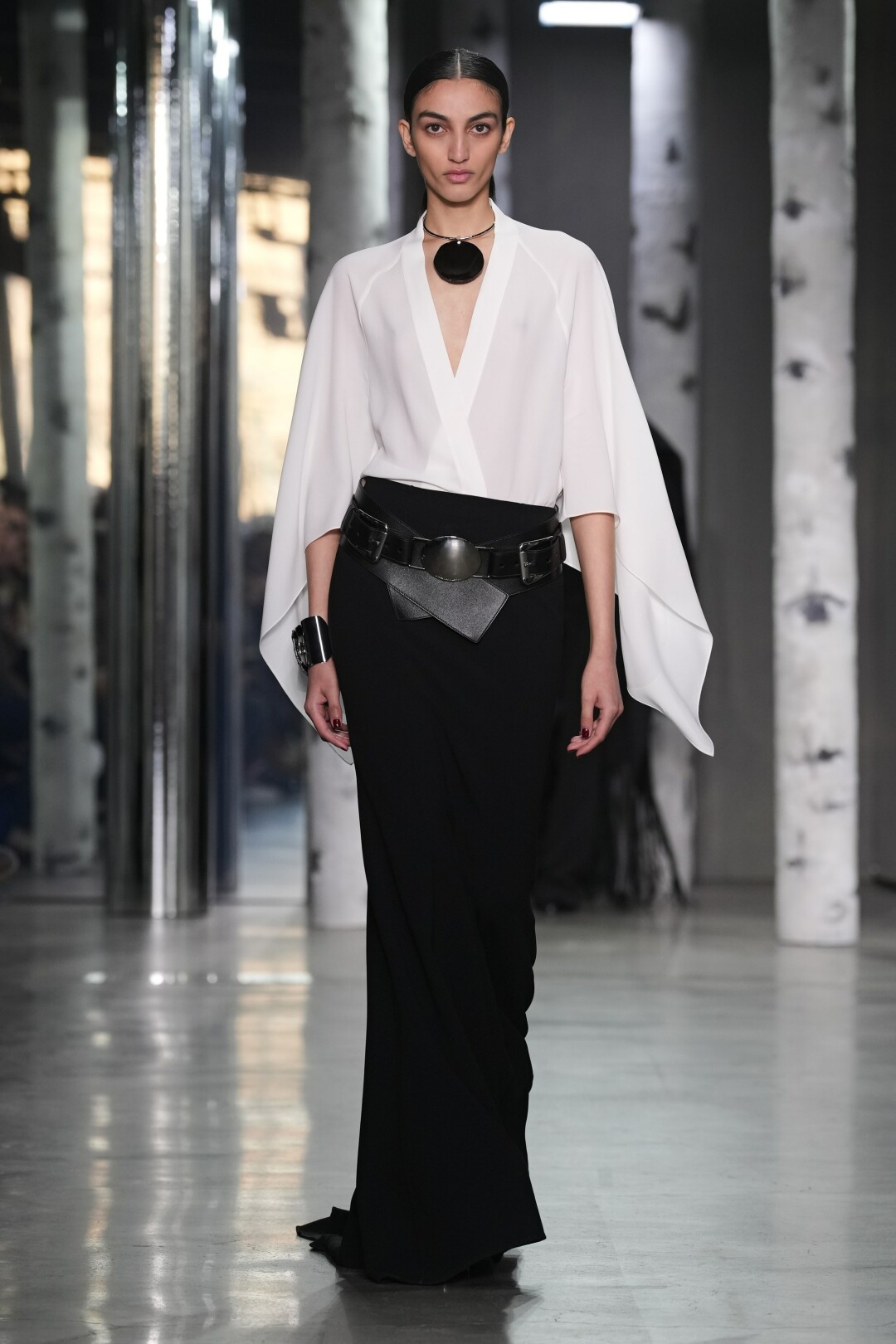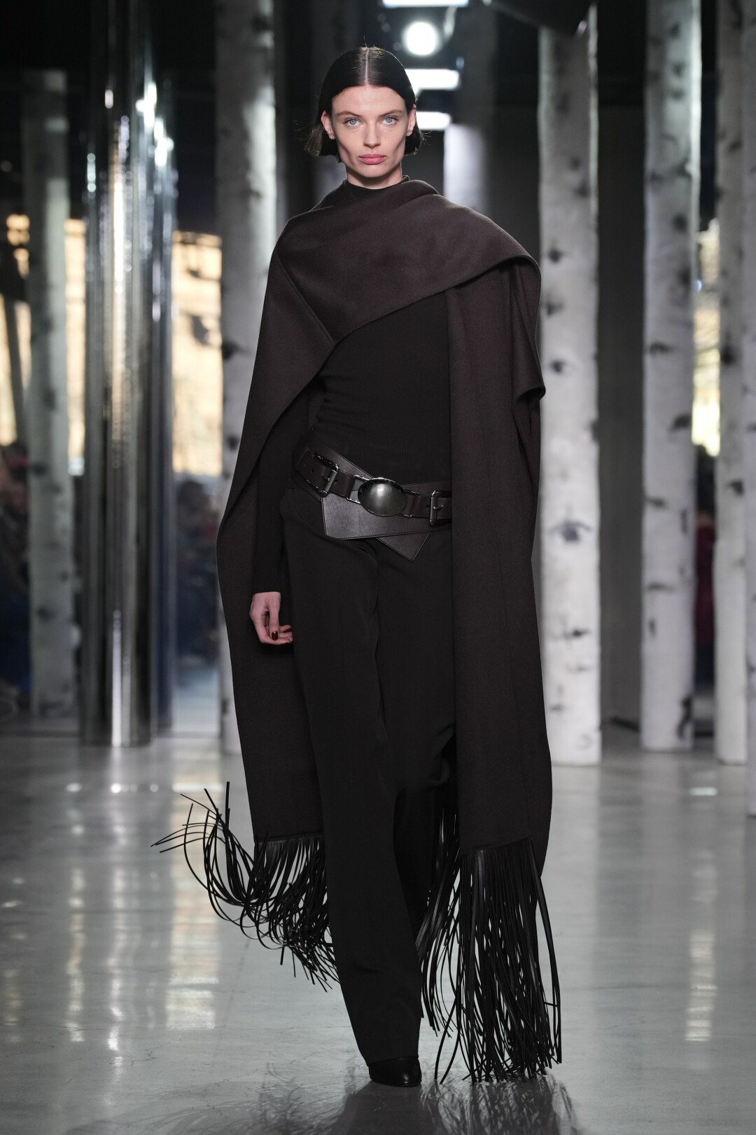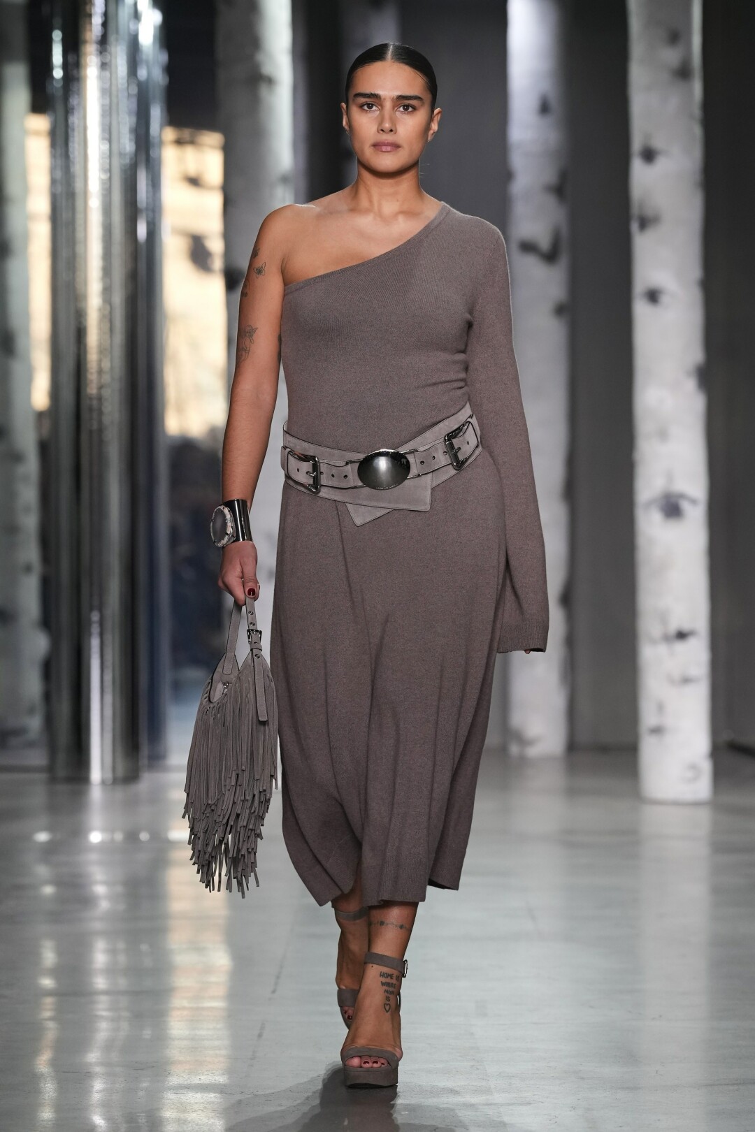Майклу Корсу всегда нравились 1970-е, так что самые лучшие его работы всегда вдохновлены этой эпохой. На мудборде дизайнера были все музы того времени: Глория Стейнам, Шер, Тина Тернер, Лина Хорн, Эли МакГроу и Джейн Фонда, а также его собственная мать Джоан. Первый образ напомнил Стайнем ее любимыми солнцезащитными очками, микро-шортами и сапогами до колен. Дальше цитаты 70-х продолжали появляться в виде расклешенных брюк (из трикотажа с мелкими блестками!), коротких замшевых платьев с бахромой, громоздких подвесов и поясов с грузными хромированными пряжками, которые Корс впервые показал еще в 2004 году.