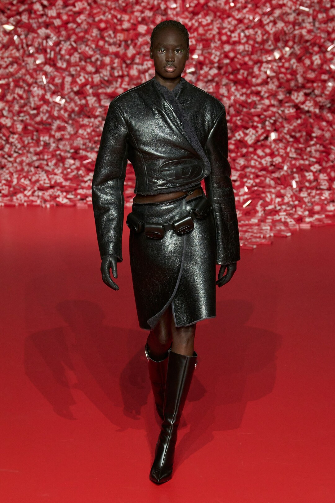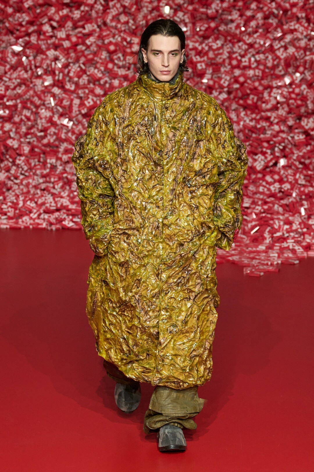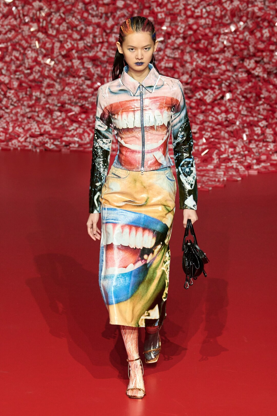 Гленн Мартенс продолжает экспериментировать с агрегатными состояниями денима: джинсы, протертые до состояния микросетки, куртка, заношенная даже не до дыр, а до нитей (основы и утка!), останки платья из денима, переходящего в пайетки (праздник, который мы заслужили). Бамстеры, мини и голые платья показывали под недвусмысленные стоны саундтрека на фоне горы презервативов, которые отныне станут раздавать в магазинах Diesel, чтоб вы не расплодились. Ведь впереди примерно зомби-апокалипсис: самое время для склизких пальто и курток в стиле кордицепс-шик (для последних из нас).