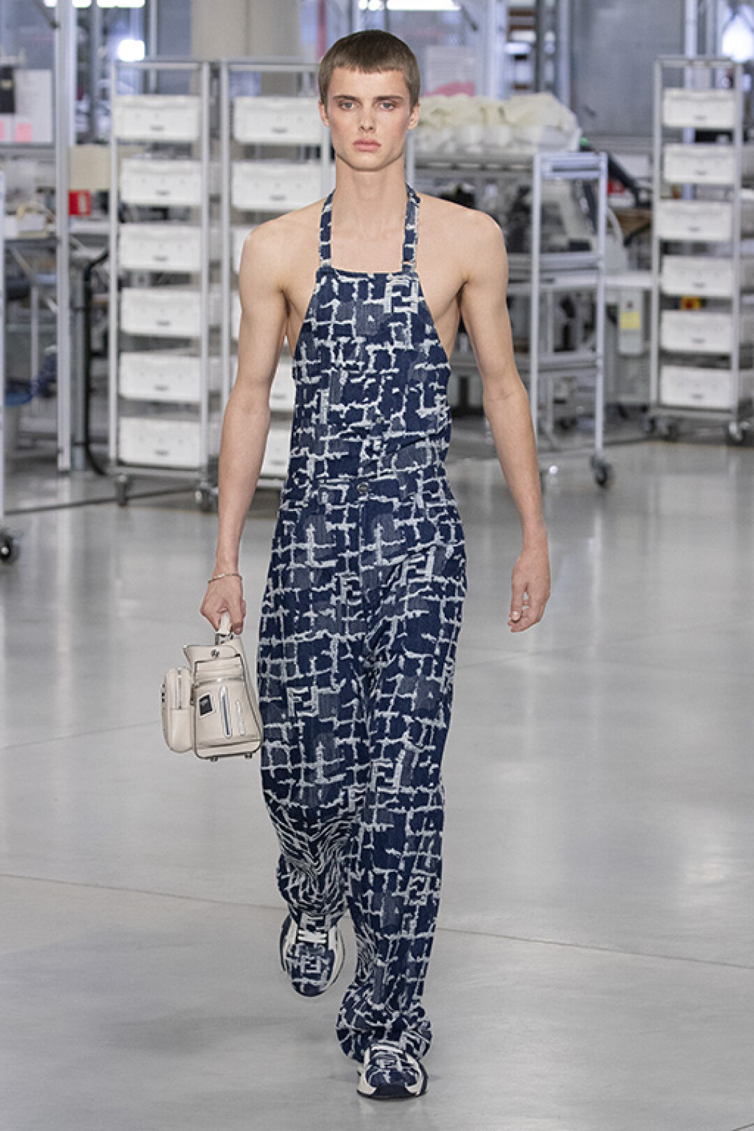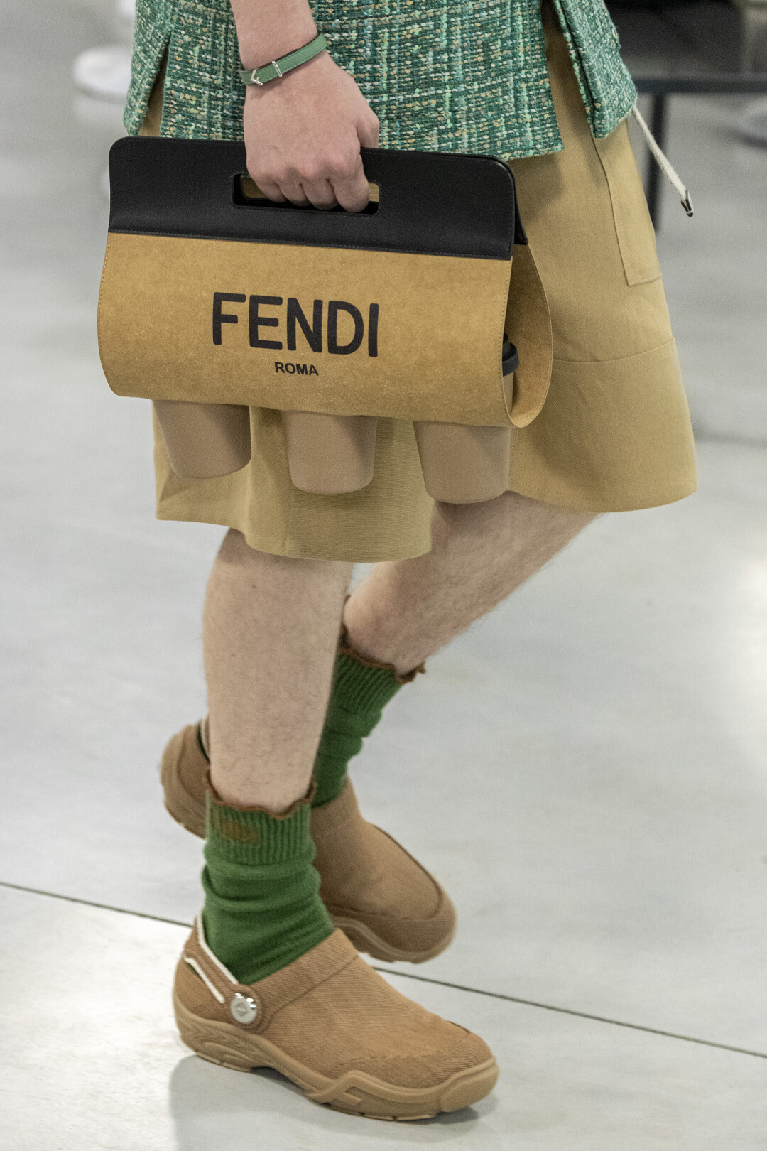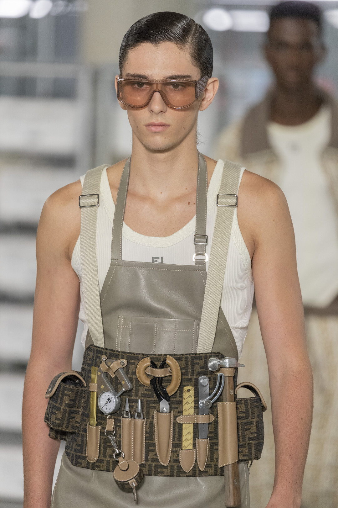 Мужчины за работой – сюжет, навеянный новой кожевенной фабрикой в Тоскане, приобретенной Сильвией Вентурини для растущих нужд Fendi. Получился не завод, а фабрика грез: фигуристые мужчины в фартуках на голое тело и трогательных носочках, торчащих из максимально роскошной версии кроксов несут кофе в сумках-подставках Fendi, и все только для того, чтоб еще с большим энтузиазмом мастерить твой новый багет. Больше всего хочется тренч с сантиметром (а вдруг похудела?) и кожаный пояс с колюще-режущими инструментами (это петербуржское).