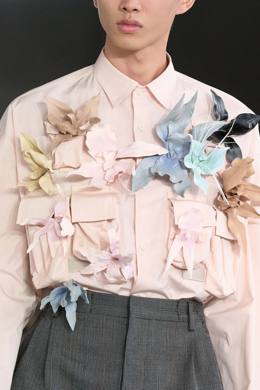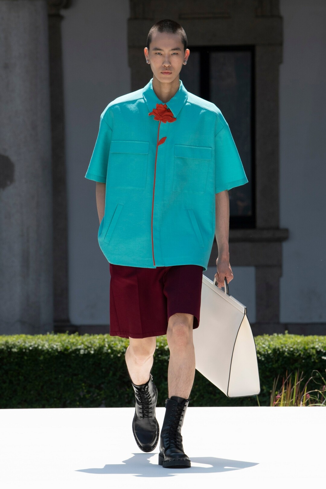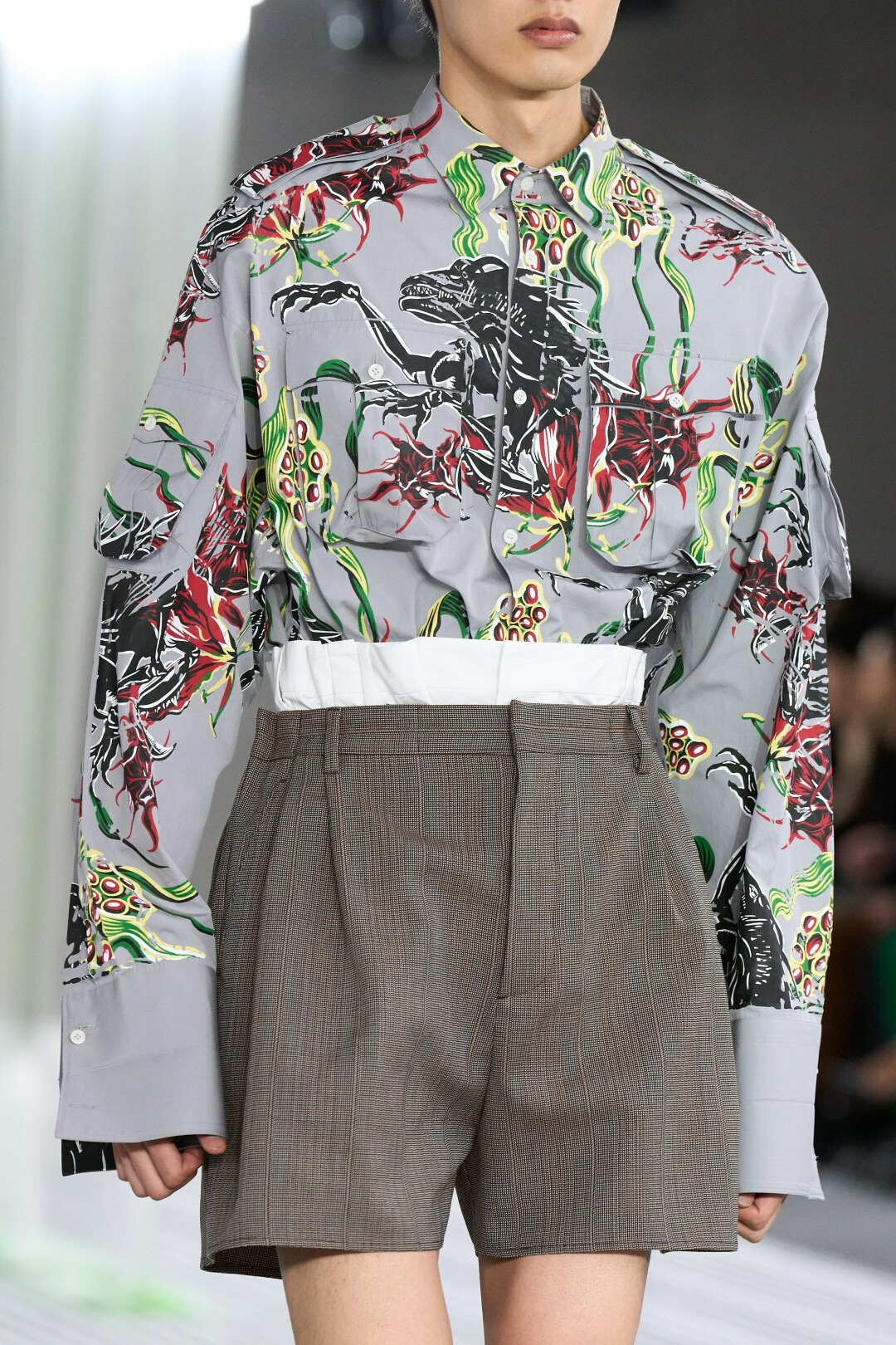 Синьора Миучча и Раф Симонс, виртуозы церебрального мудборда и стилистического трюка, не подвели и на этот раз: в референсах значится художник Йозеф Бойс  (не столько благодаря работам вроде знаменитых войлочных костюмов, сколько благодаря собственной манере одеваться: Йозеф питал слабость к карго-жилетам), и художник Ханс Руди Гигер (его Чужие прятались в цветах на рубашках, при этом новые сумки смотрелись только что снятыми с их лапок, а  прозрачная слизь сочилась из потолка на протяжении всего показа).  Новое актуальное стилистическое допущение – высокие черные носки с шортами (такое мы наблюдали и на показе Valentino) и непременно с цветными лаковыми лоферами. За нежность, хрупкость и уязвимость, как и у Valentino, в коллекции отвечали объемные цветы, распустившиеся промеж кармашков.