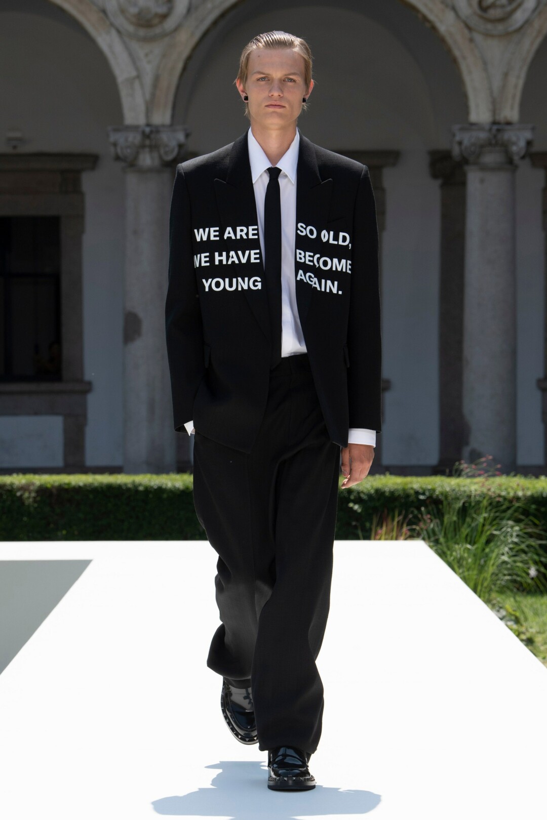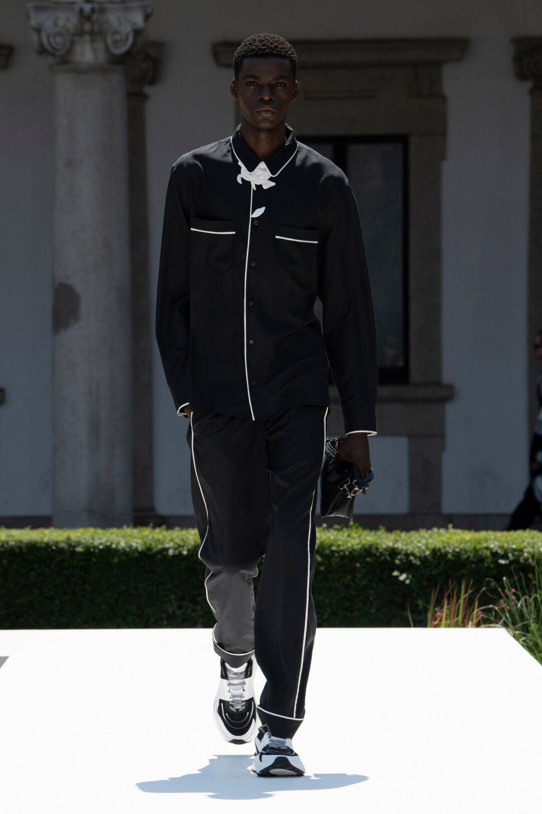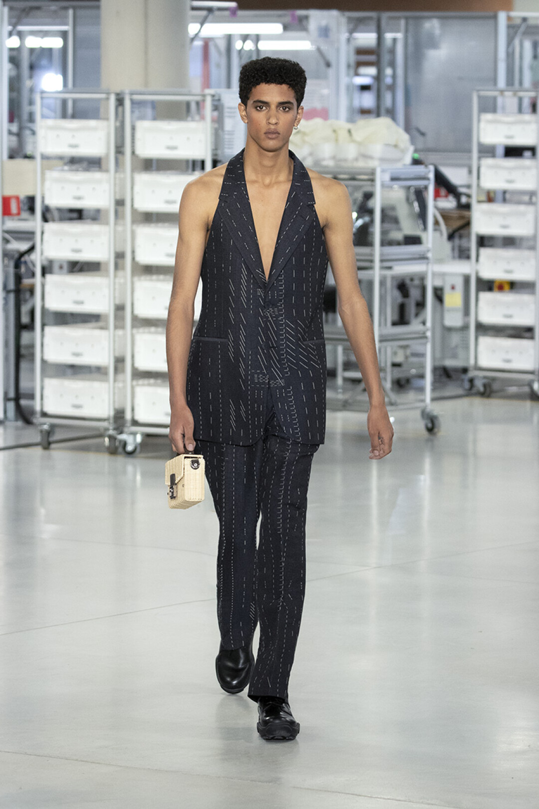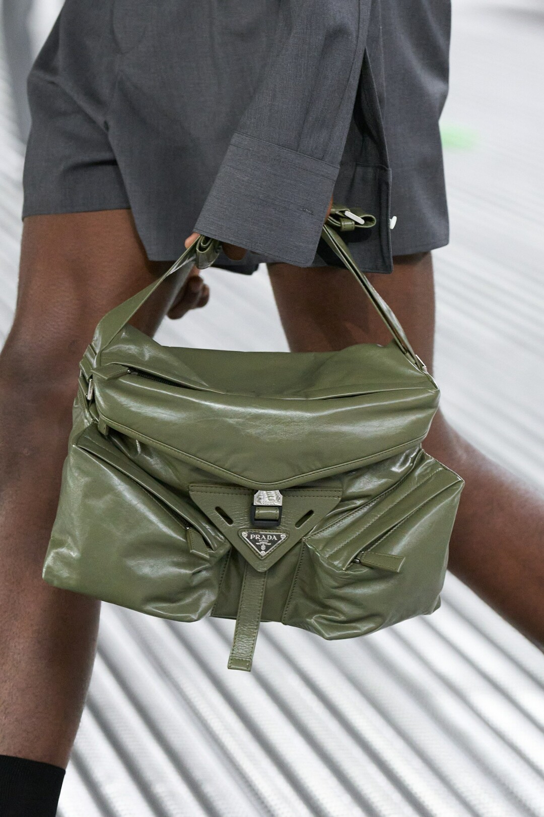 Синьора Миучча и Раф Симонс, виртуозы церебрального мудборда и стилистического трюка, не подвели и на этот раз: в референсах значится художник Йозеф Бойс  (не столько благодаря работам вроде знаменитых войлочных костюмов, сколько благодаря собственной манере одеваться: Йозеф питал слабость к карго-жилетам), и художник Ханс Руди Гигер (его Чужие прятались в цветах на рубашках, при этом новые сумки смотрелись только что снятыми с их лапок, а  прозрачная слизь сочилась из потолка на протяжении всего показа).  Новое актуальное стилистическое допущение – высокие черные носки с шортами (такое мы наблюдали и на показе Valentino) и непременно с цветными лаковыми лоферами. За нежность, хрупкость и уязвимость, как и у Valentino, в коллекции отвечали объемные цветы, распустившиеся промеж кармашков.