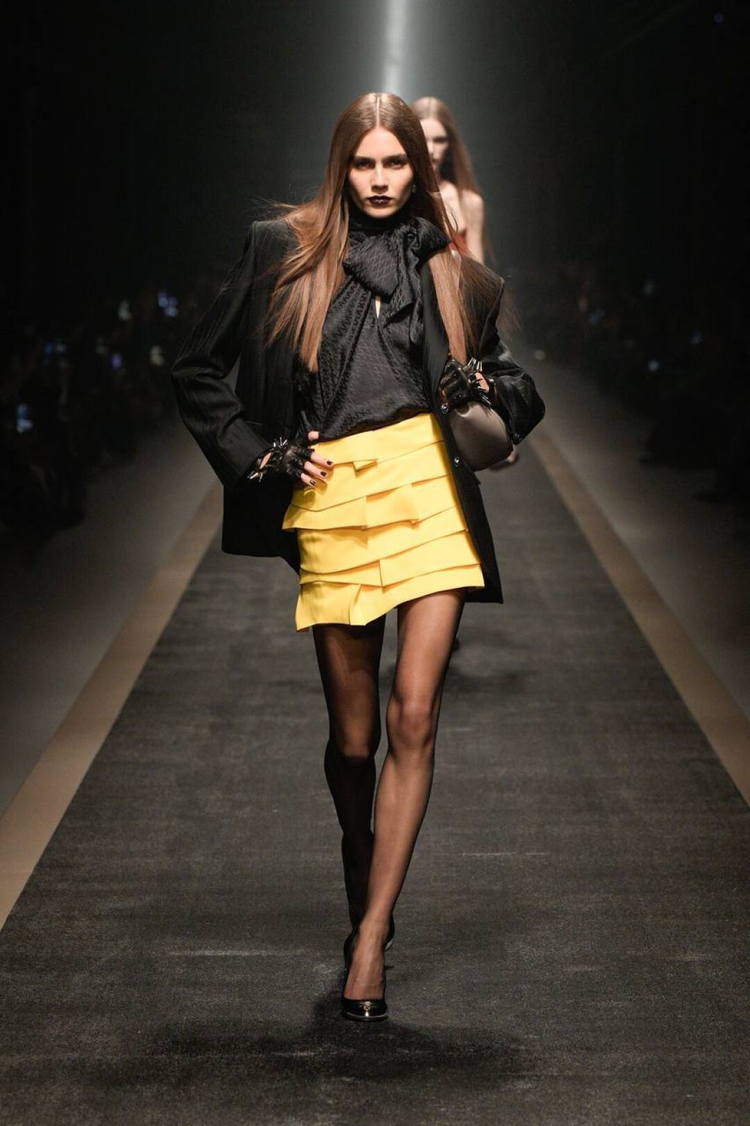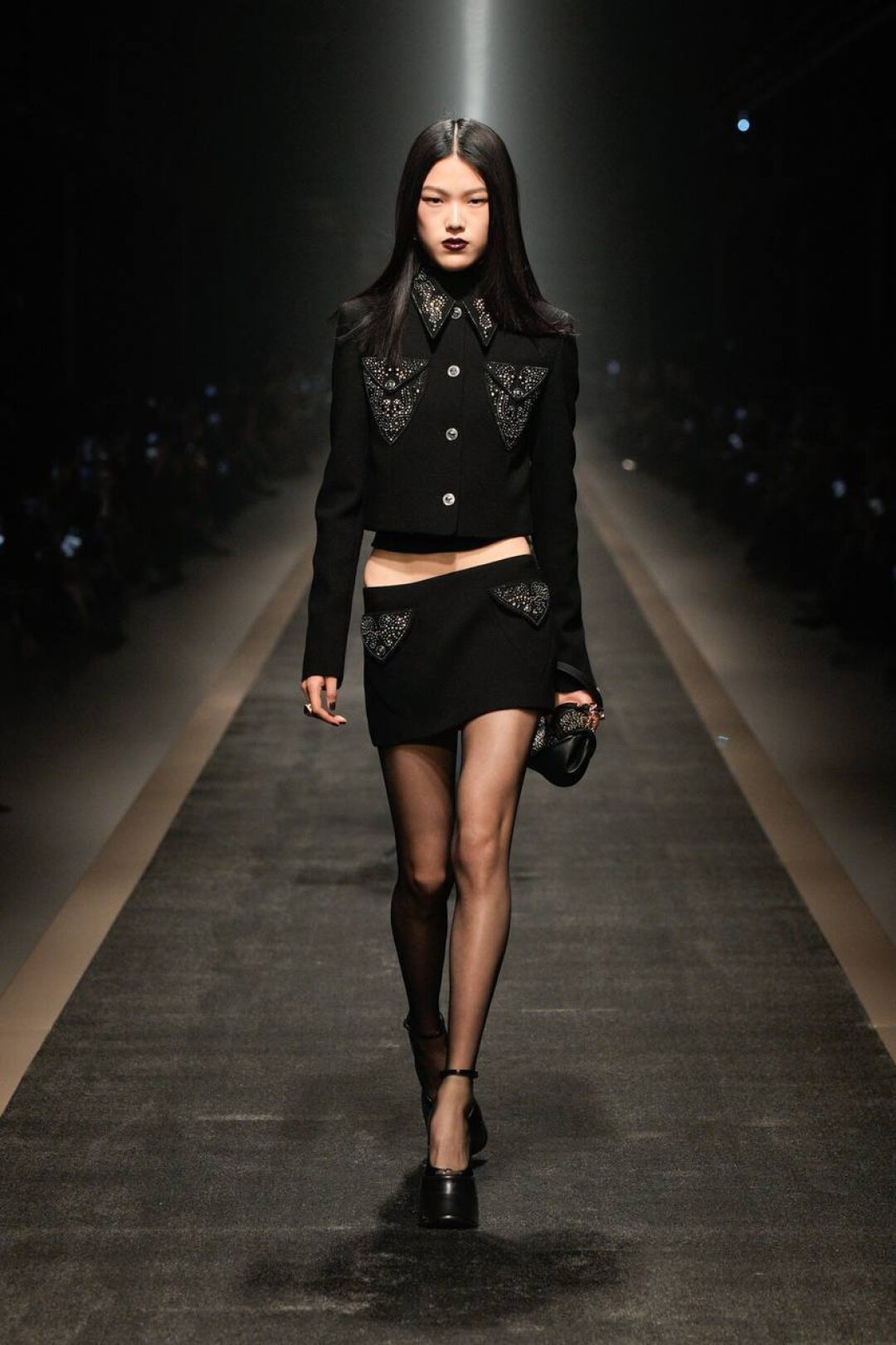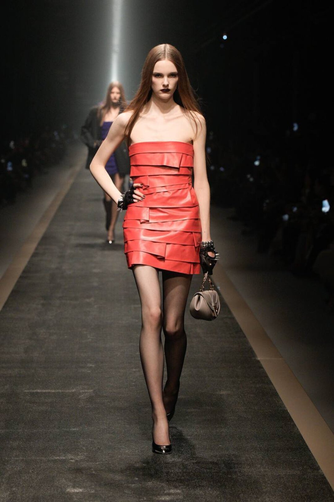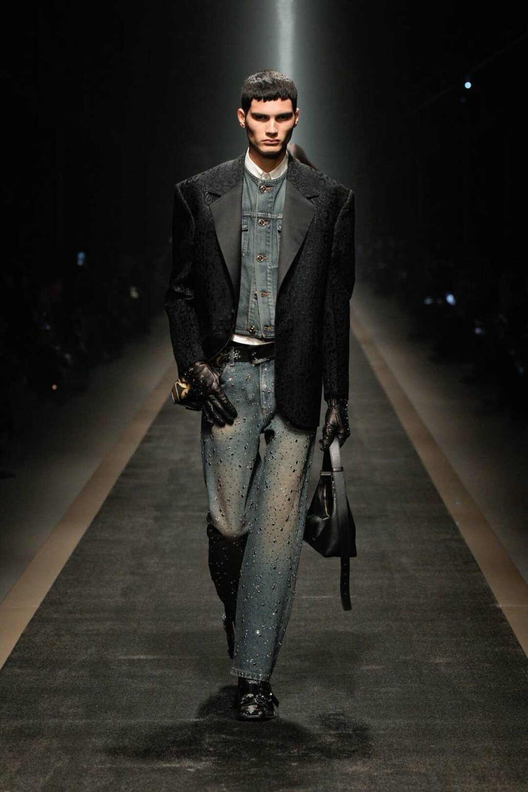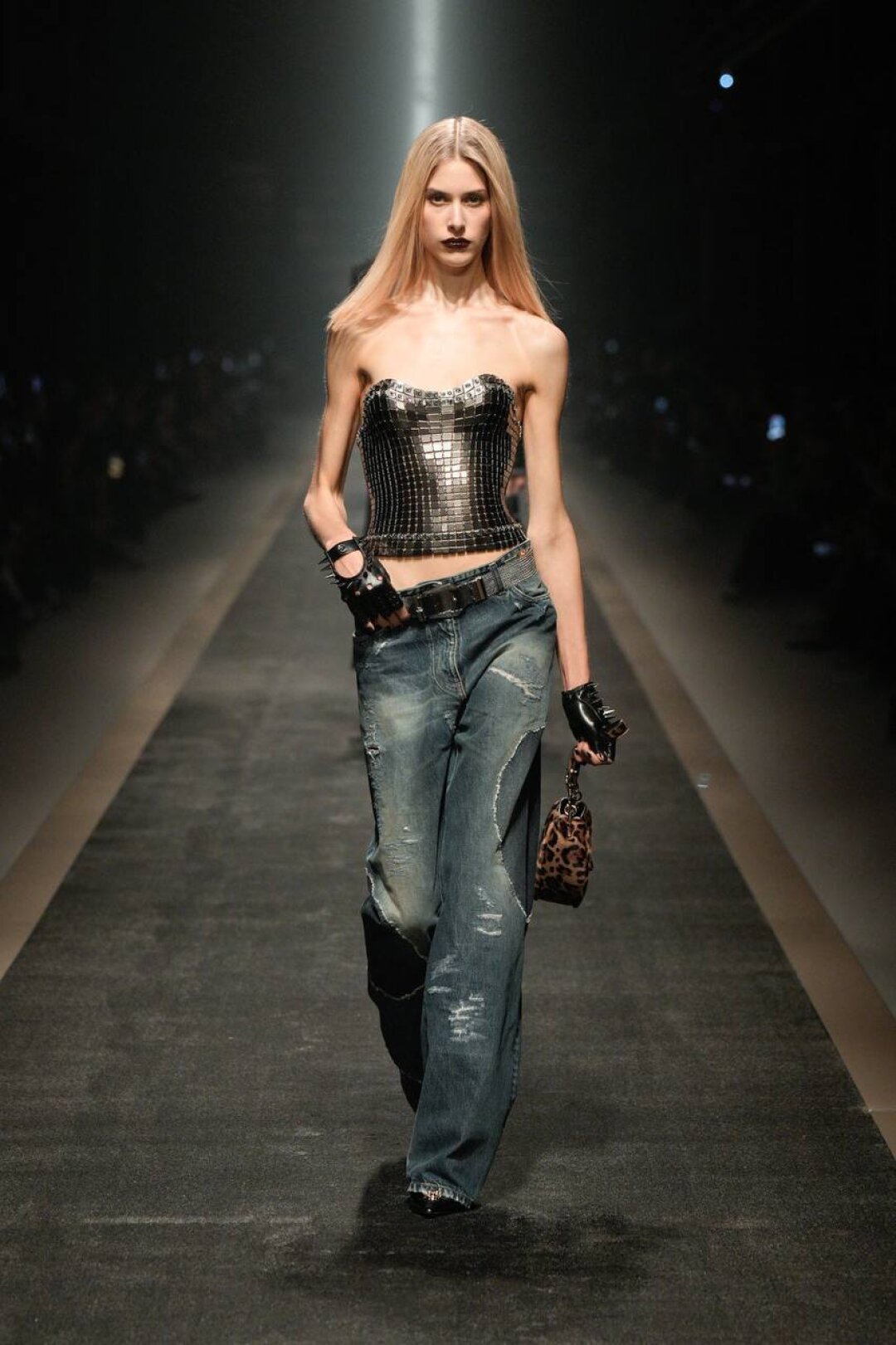 С уверенностью заявляем: экстранизкая посадка is back! Худрук Versace попыталась повторить успех Гленна Мартенса из Diesel и показала болтающиеся на бедрах джинсы (со стразами!) в тандеме с кроп-блузами и диско-корсетами. Женим высокое с низким (фэшн-мезальянс!) — миксуем вечерние платья с байкерскими перчатками, а роскошные жаккардовые смокинги — с потертым денимом.
