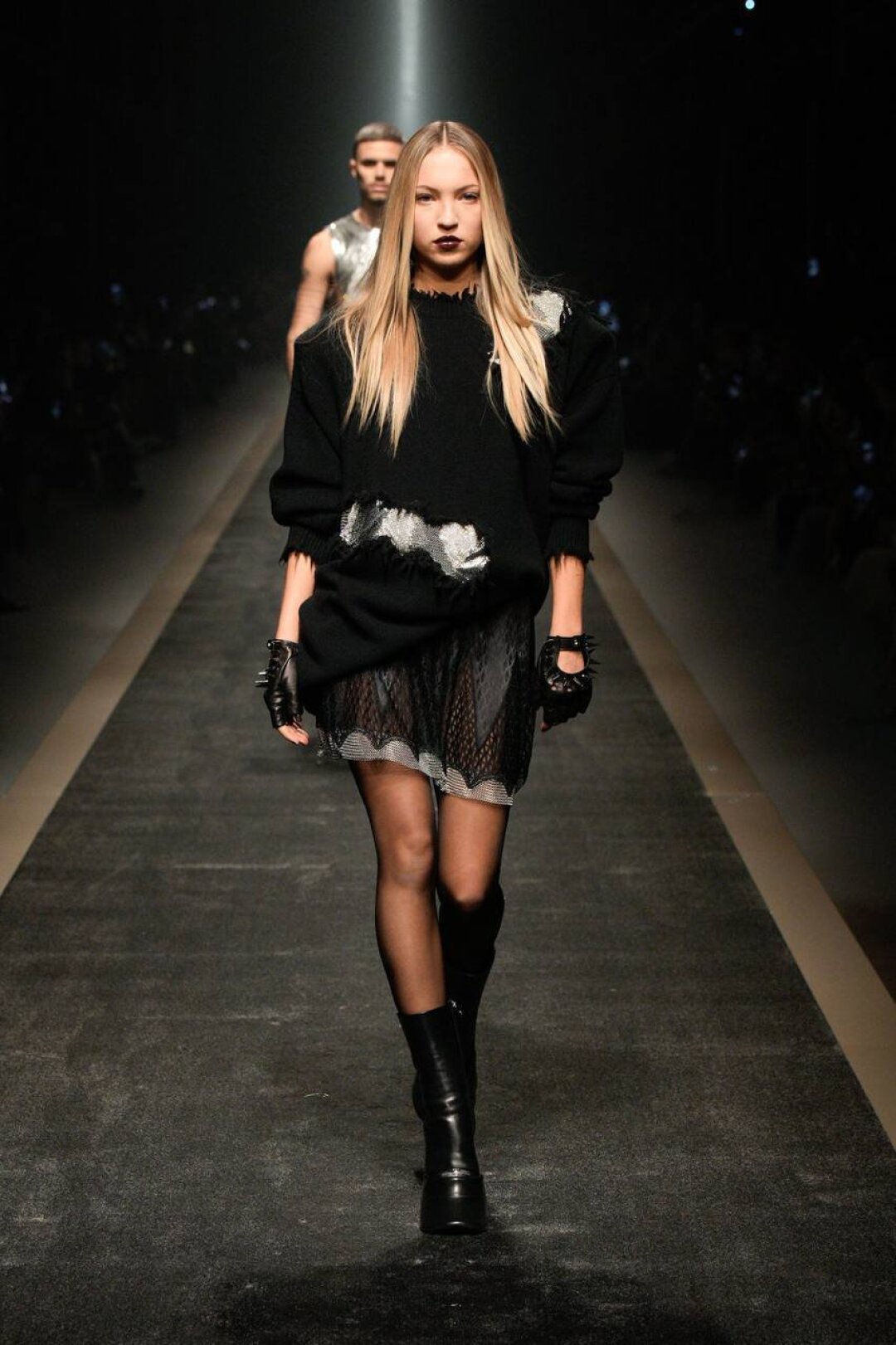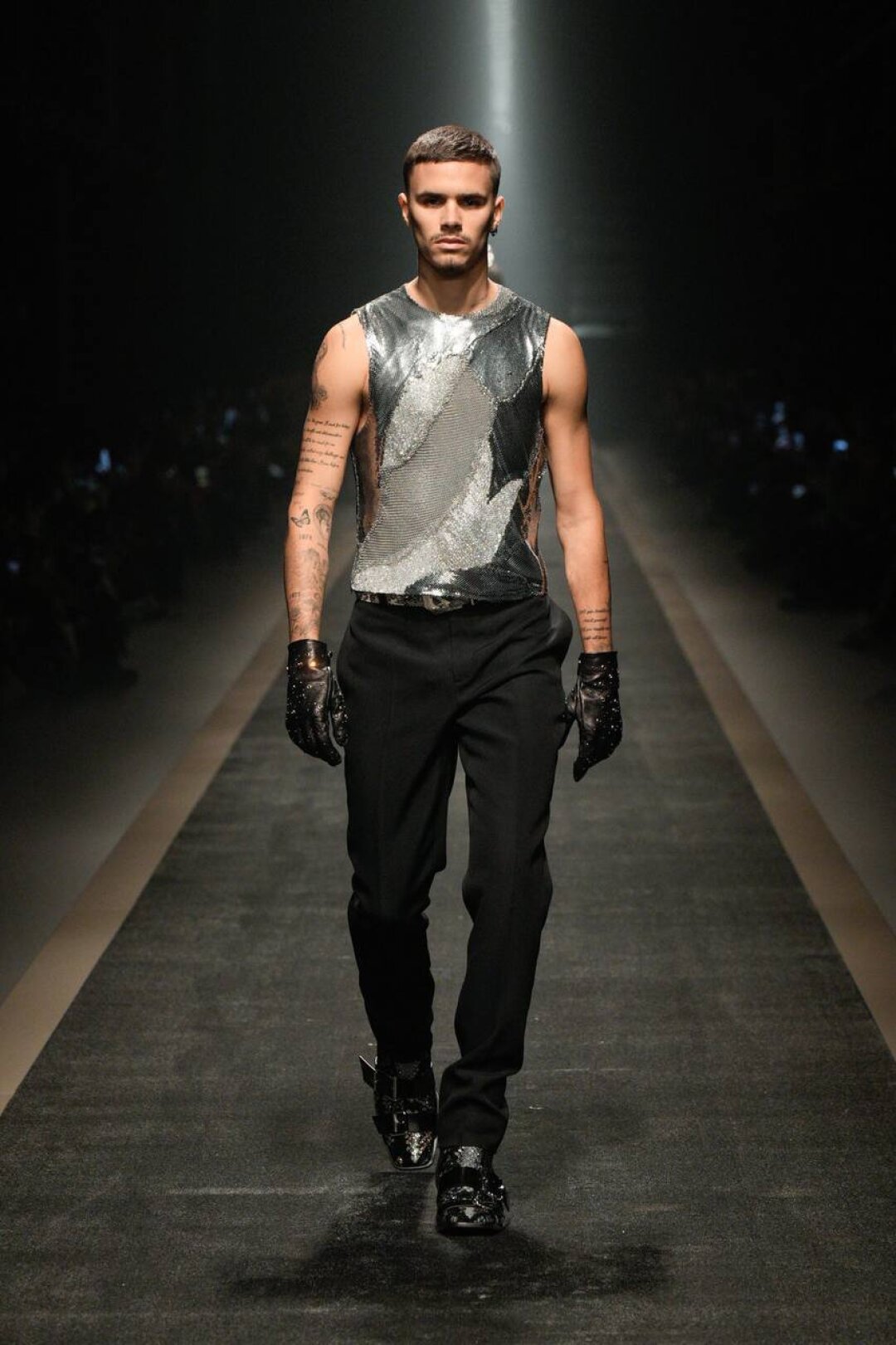 На случай праздников (и выпускных!) присматриваемся к металлик-платьям Франкенштейна, сшитым из разных видов серебристой ткани, которые выгуливаем с шипованными чепчиками и ботильонами-кольчугой. А мужчинам советуем примерить подобный топ с костюмными брюками, рептильными ботинками и перчатками со стразами (на подиуме показал сын Виктории и Дэвида Бекхэмов — Ромео!).