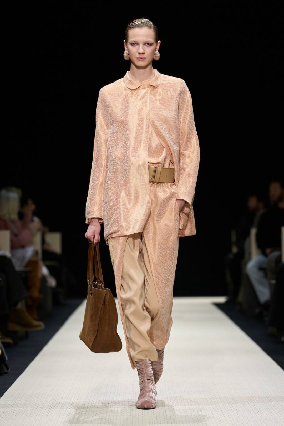 Не обошлось и без фирменных шинуазри-блуз, жакетов и накидок в китайском стиле и бархатных комбинезонов с золотистой восточной вышивкой. Абсолютный обувной хайлайт показа — полусапоги на плоской подошве, выполненные из драпированного бархата, из золотистого атласа, дополненные симметричными рядами пуговиц и вышитыми узорами (в том числе люрексом), которые стилисты замиксовали со всем — от свободных плиссированных брюк с манжетами до блестящих многослойных юбок и полупрозрачных макси-платьев.