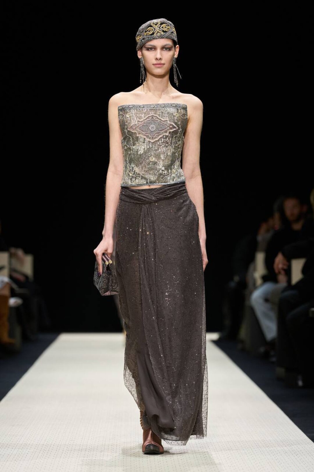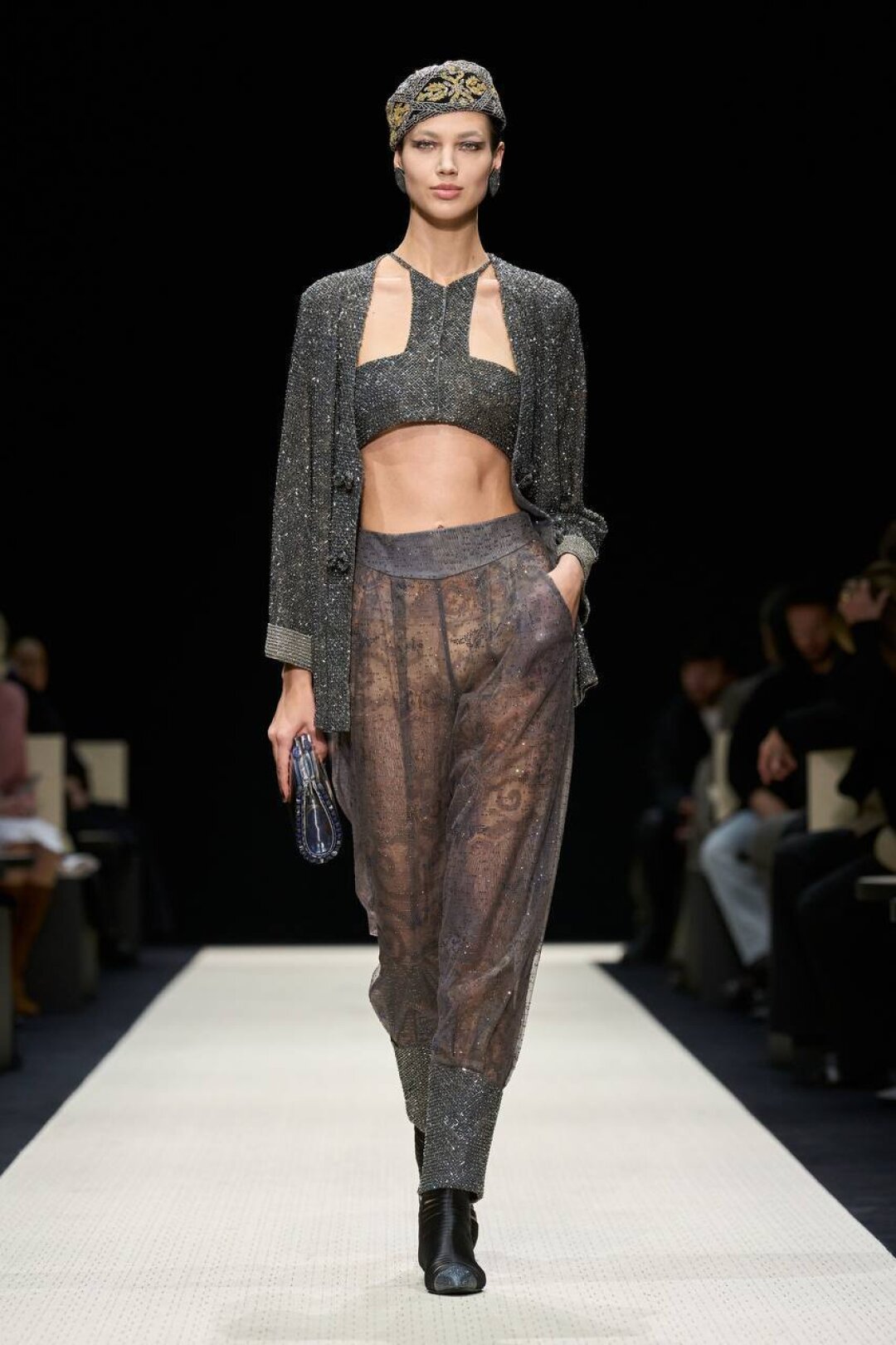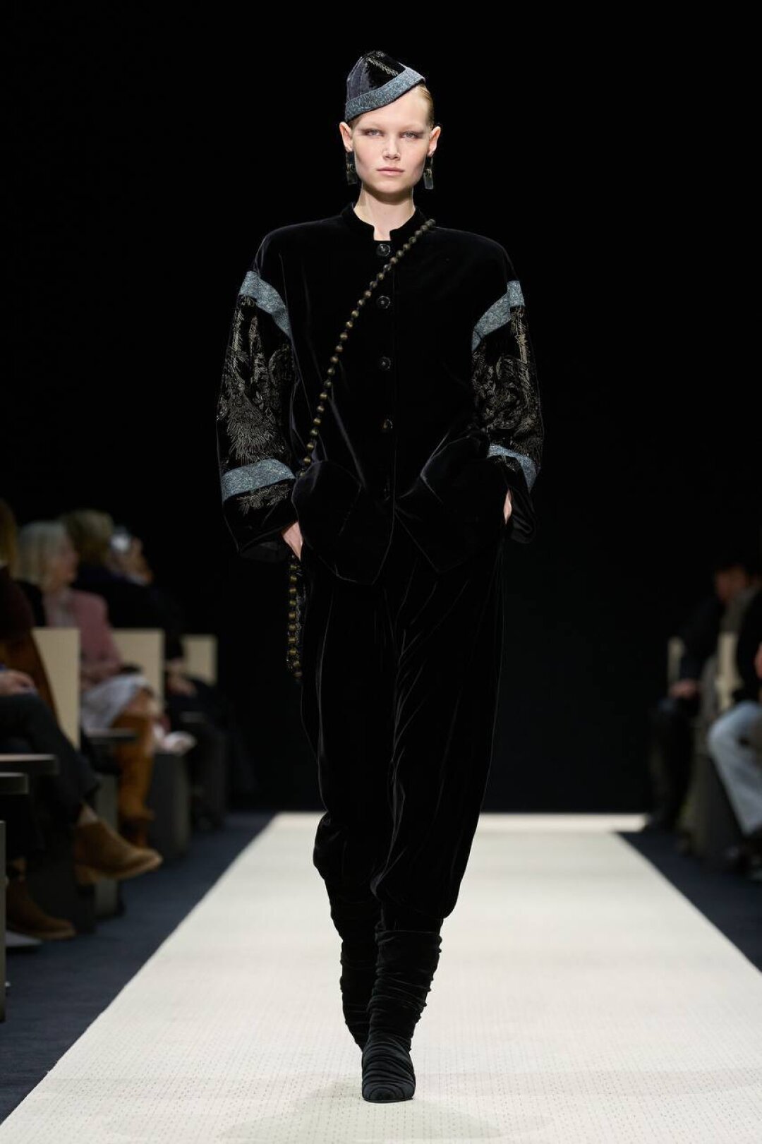 Не игнорируем головные уборы: в Giorgio Armani сочинили драгоценные тюбетейки, велюровые пилотки и декадентские чепчики