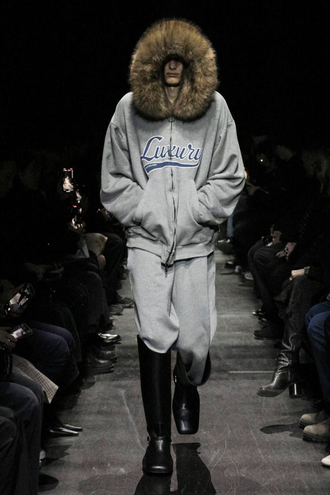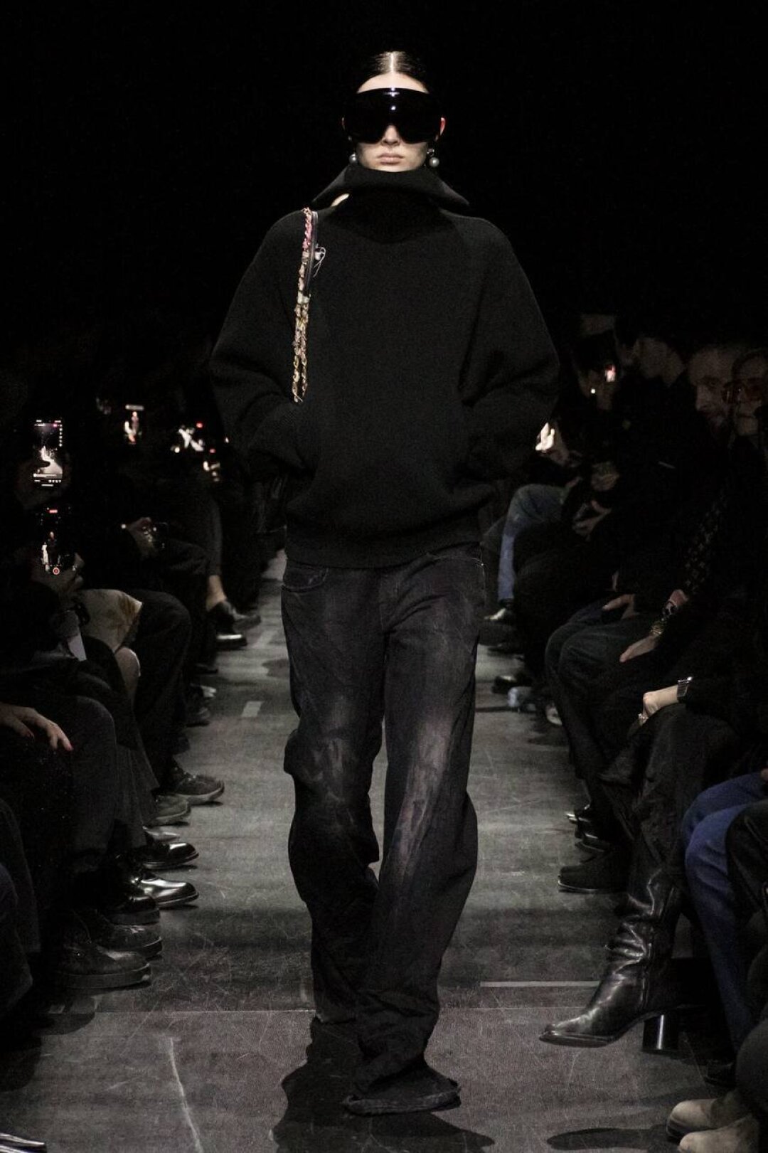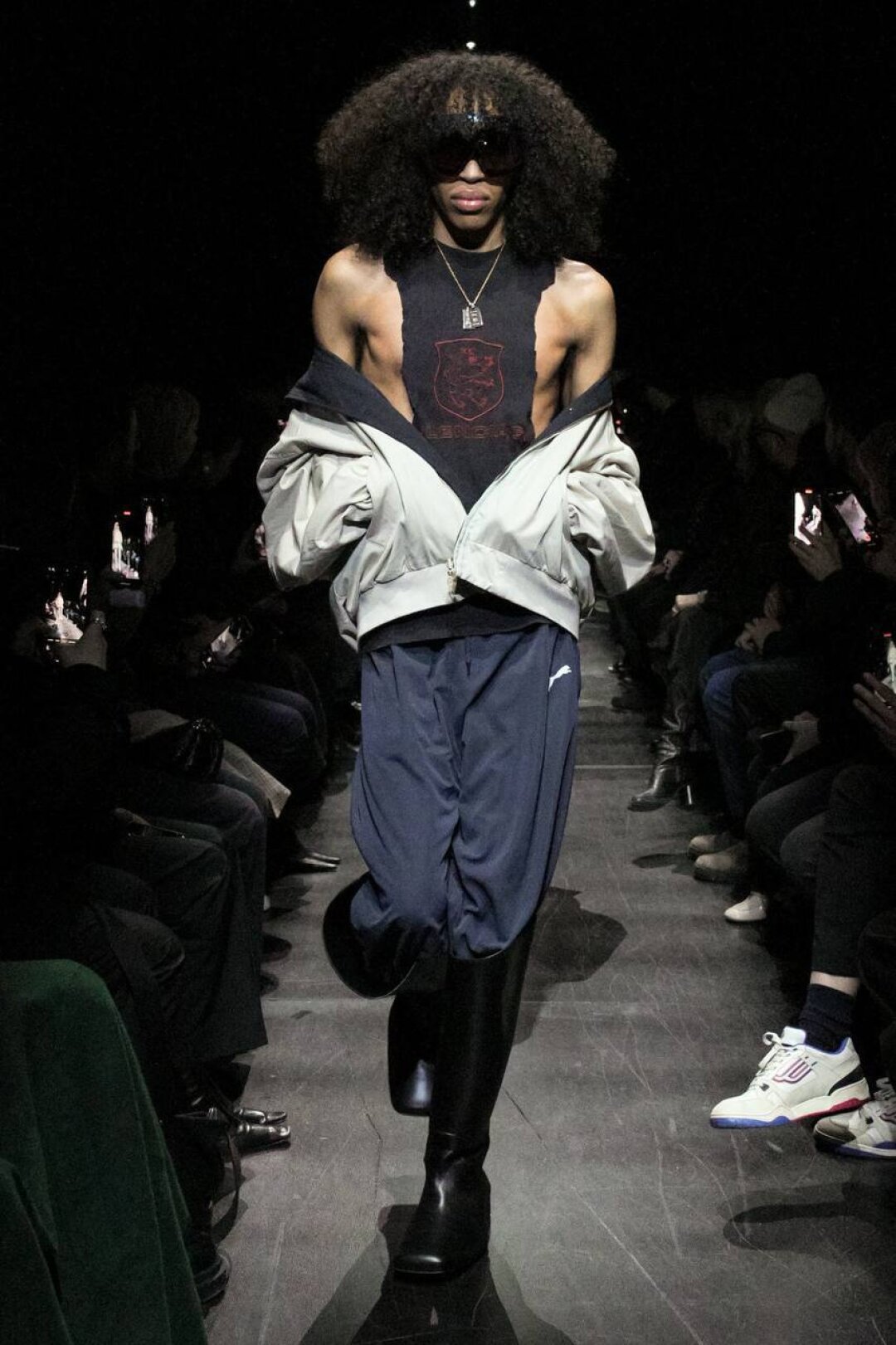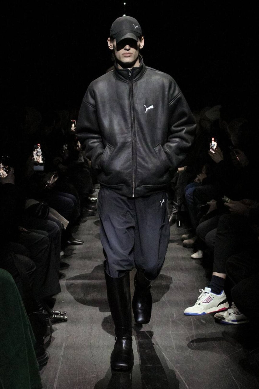 Офискор в исполнении Демны: строгие приталенные двойки на голое тело, помятые темно-синие и порванные полосатые (лайфхак: оставьте костюм и кошку в закрытой комнате на пару часов — ваш костюм Balenciaga готов!). Худрук Balenciaga продолжает костюмную тему видавшими виды сетами из денима (миксуем с лакированными лодочками!) и спортивными айтемами из коллаборации с Puma: Демна вспоминает постсоветское прошлое (читай: фэшн-принципы гопников!) и заправляет олимпийки в треники, сочетает их с высокими носками и узкими дутыми жилетами.
