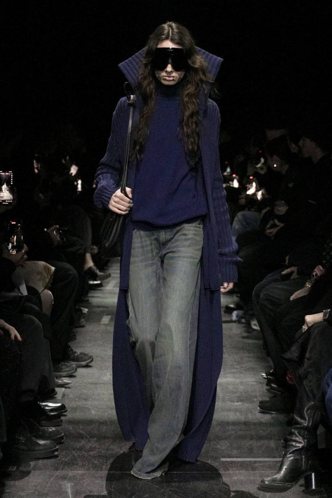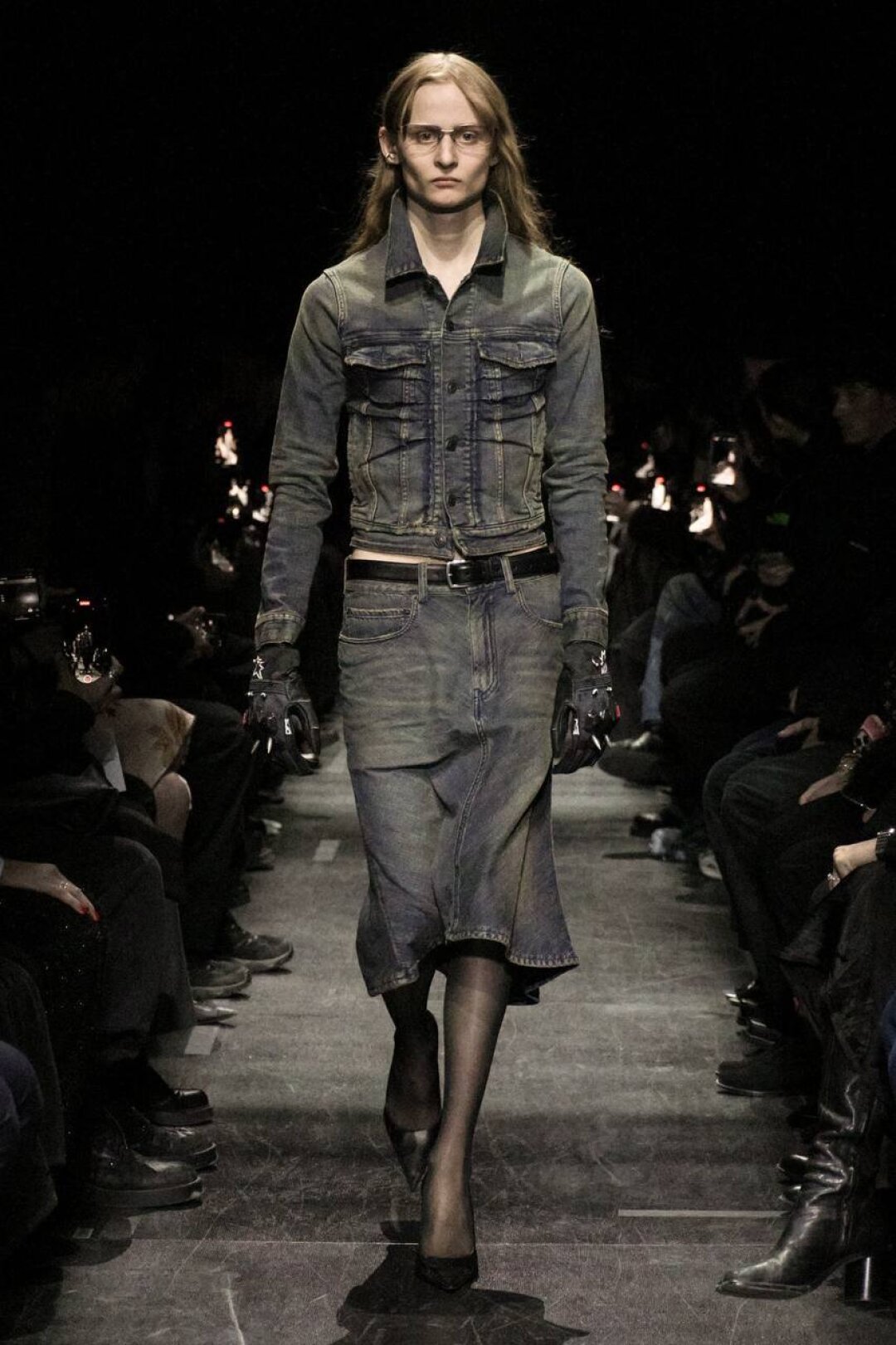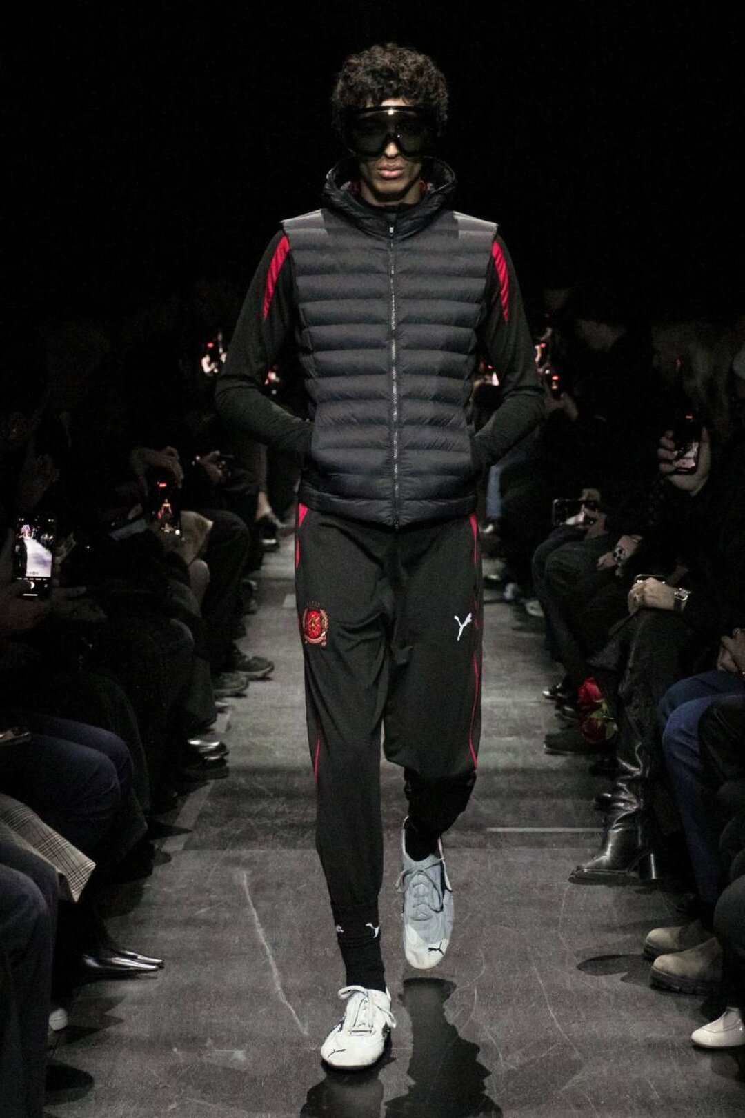 Офискор в исполнении Демны: строгие приталенные двойки на голое тело, помятые темно-синие и порванные полосатые (лайфхак: оставьте костюм и кошку в закрытой комнате на пару часов — ваш костюм Balenciaga готов!). Худрук Balenciaga продолжает костюмную тему видавшими виды сетами из денима (миксуем с лакированными лодочками!) и спортивными айтемами из коллаборации с Puma: Демна вспоминает постсоветское прошлое (читай: фэшн-принципы гопников!) и заправляет олимпийки в треники, сочетает их с высокими носками и узкими дутыми жилетами.
