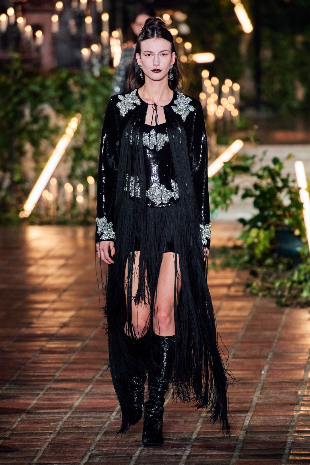 Синонимичные образы моделей завершили вуали, венки, перчатки и макияж с темные губами и выбеленной кожей. Всего дизайнеры показали 51 лук, создав, по их словам, новую женщину Rodarte – яростную и живую.