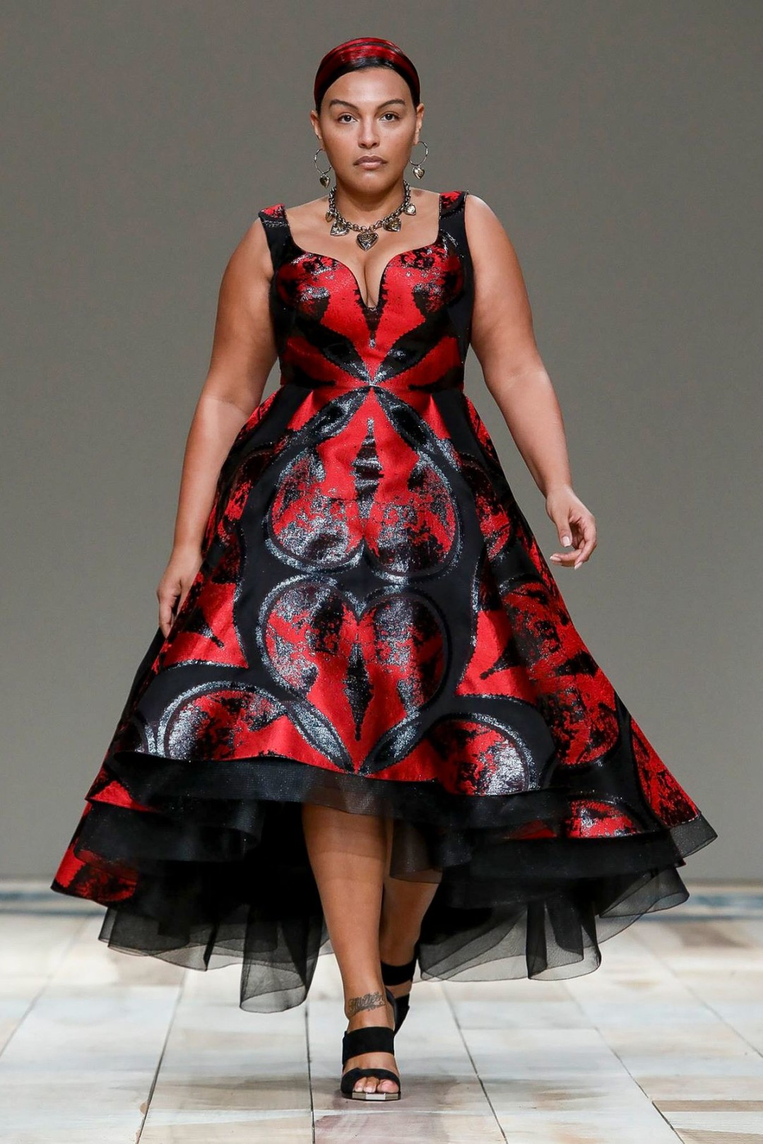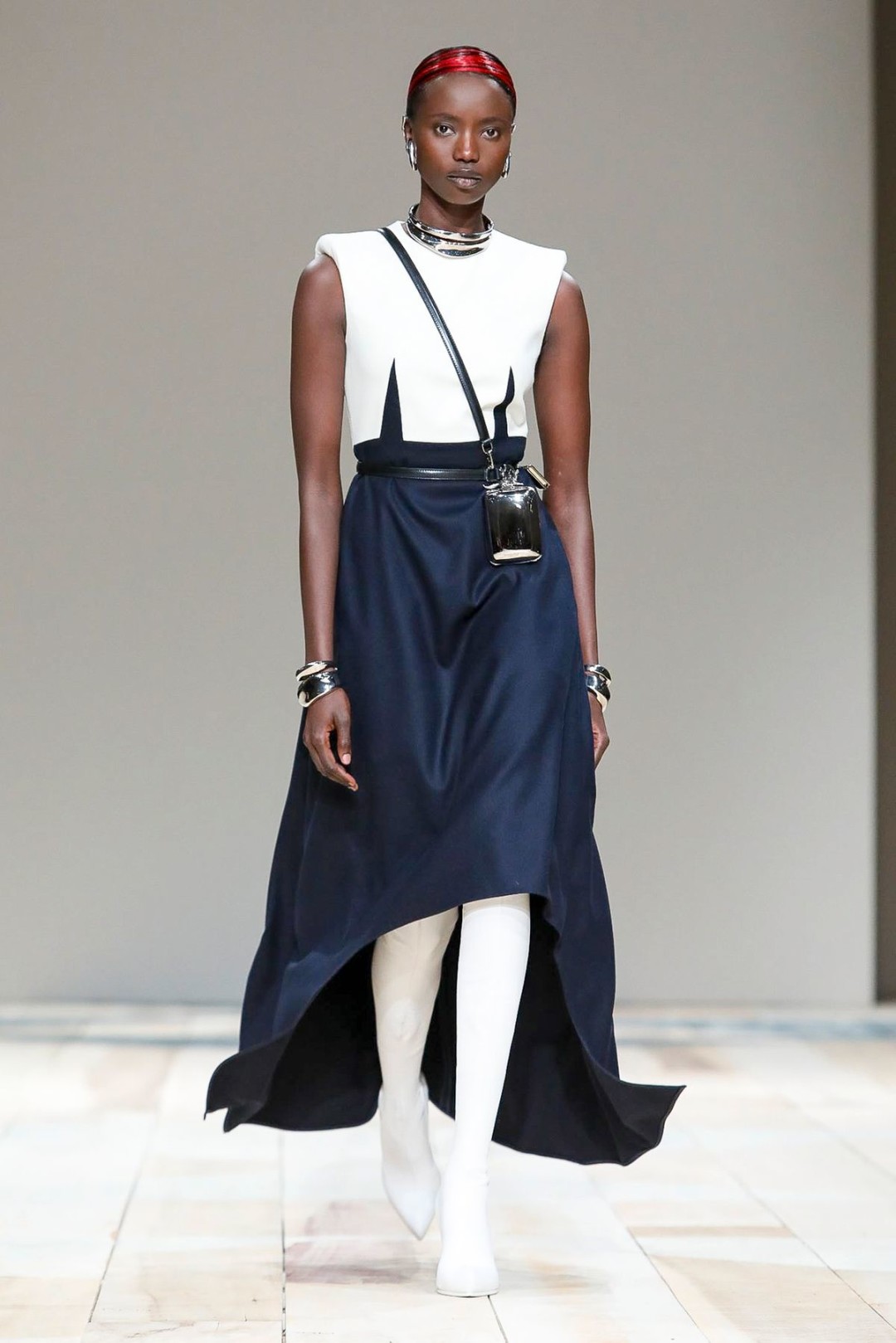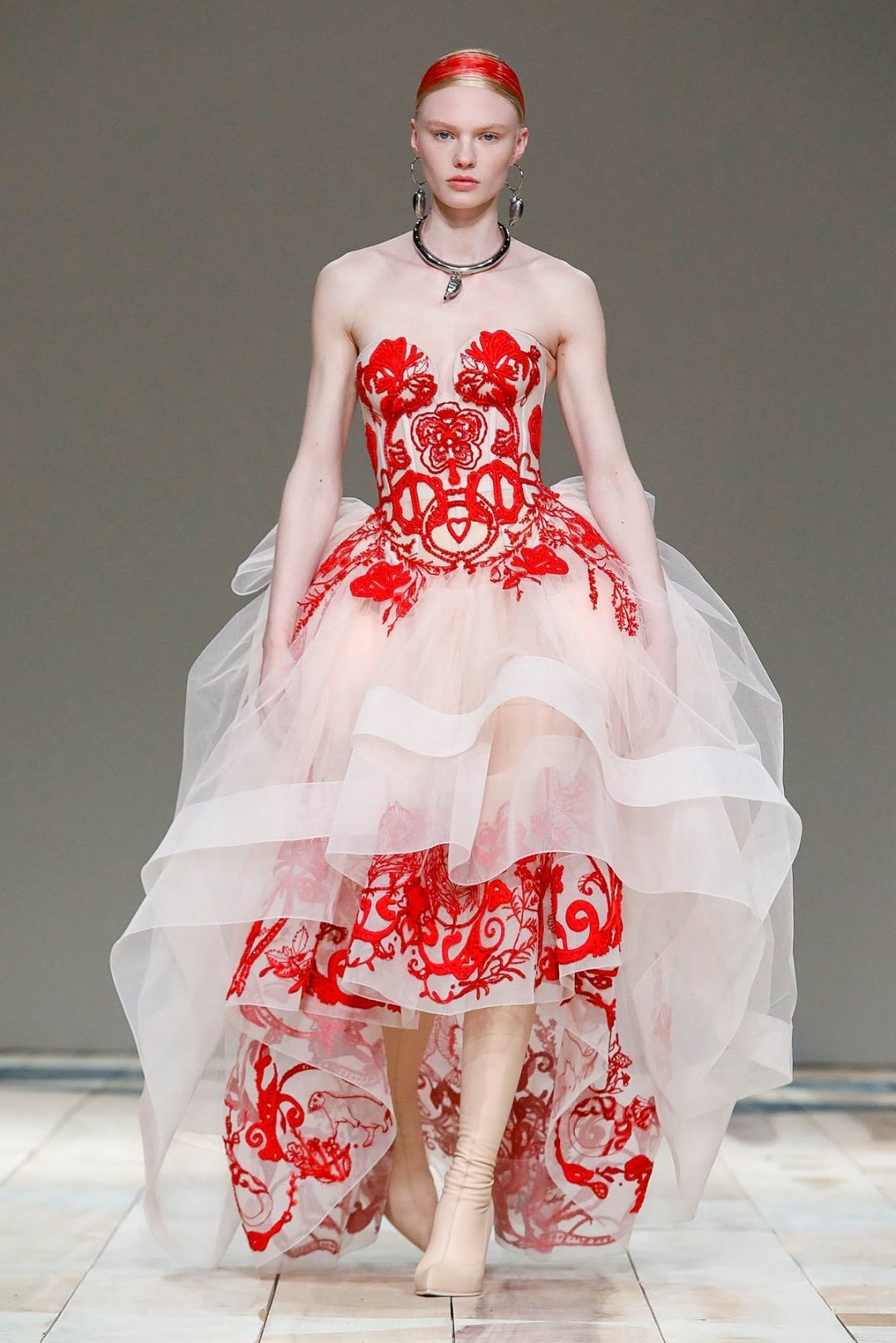 Ключевые цвета коллекции – красный, черный и белый. В этих оттенках (или в их сочетаниях) были созданы практически все 47 образов, показанных на подиуме. Образы моделей дополнили аккуратные прически с алыми прядями и натуральный (и не перетягивающий на себя внимание) макияж.