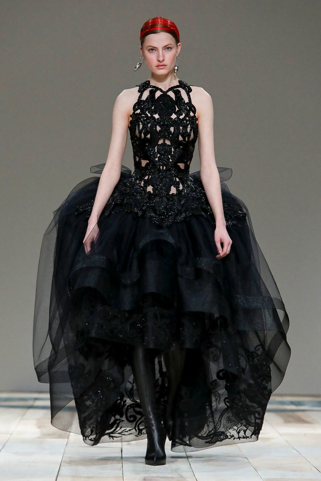 В Париже прошел показ Alexander McQueen: креативный директор бренда Сара Бертон показала осенне-зимнюю коллекцию, в которую вошли костюмы в клетку, платья с кожаными портупеями и высокие сапоги.
