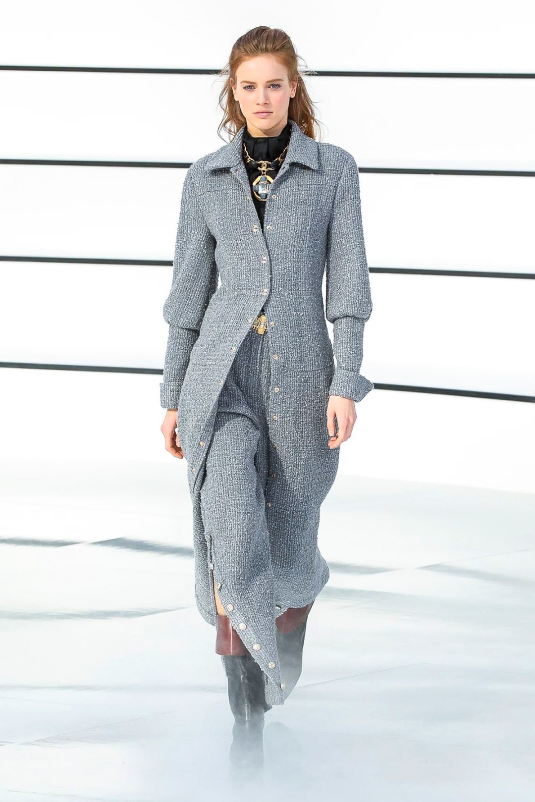 В Гран-Пале в Париже прошел показ осенне-зимней коллекции Chanel, в которую вошли длинные юбки с разрезами и кнопочной отделкой по краям, костюмы-тройки оттенка лимонного тарта и разноцветные кардиганы, напоминающие витражи в католических базиликах.