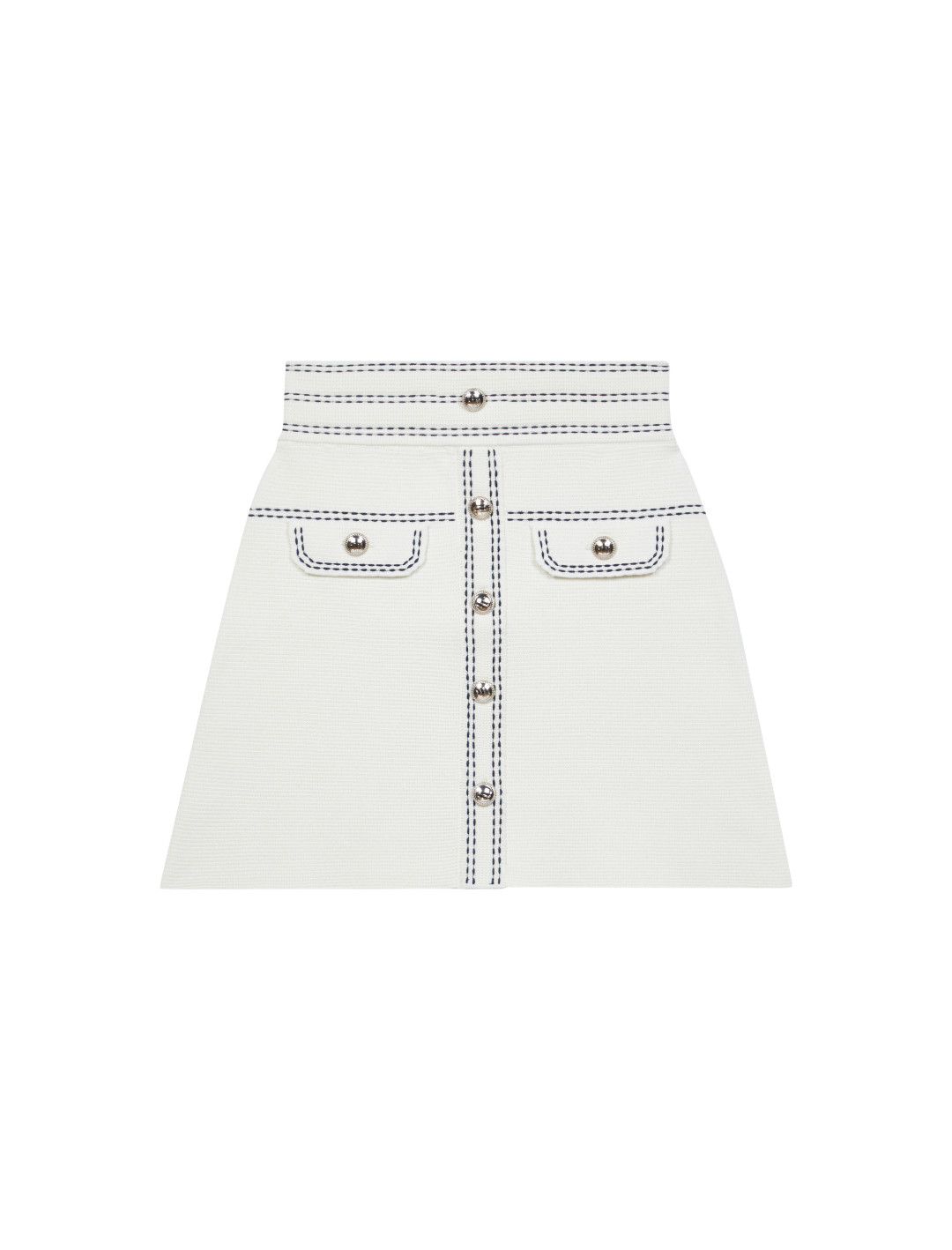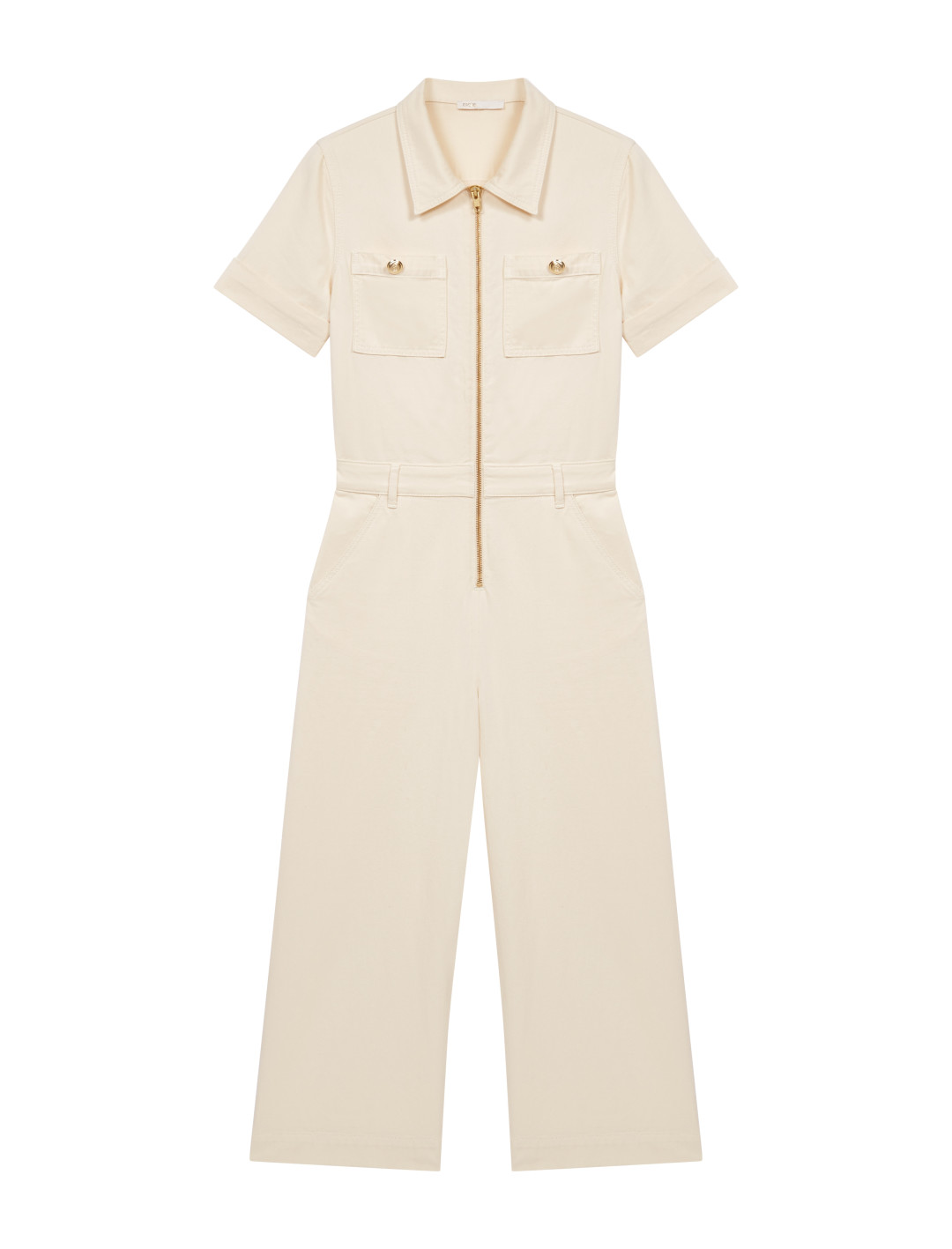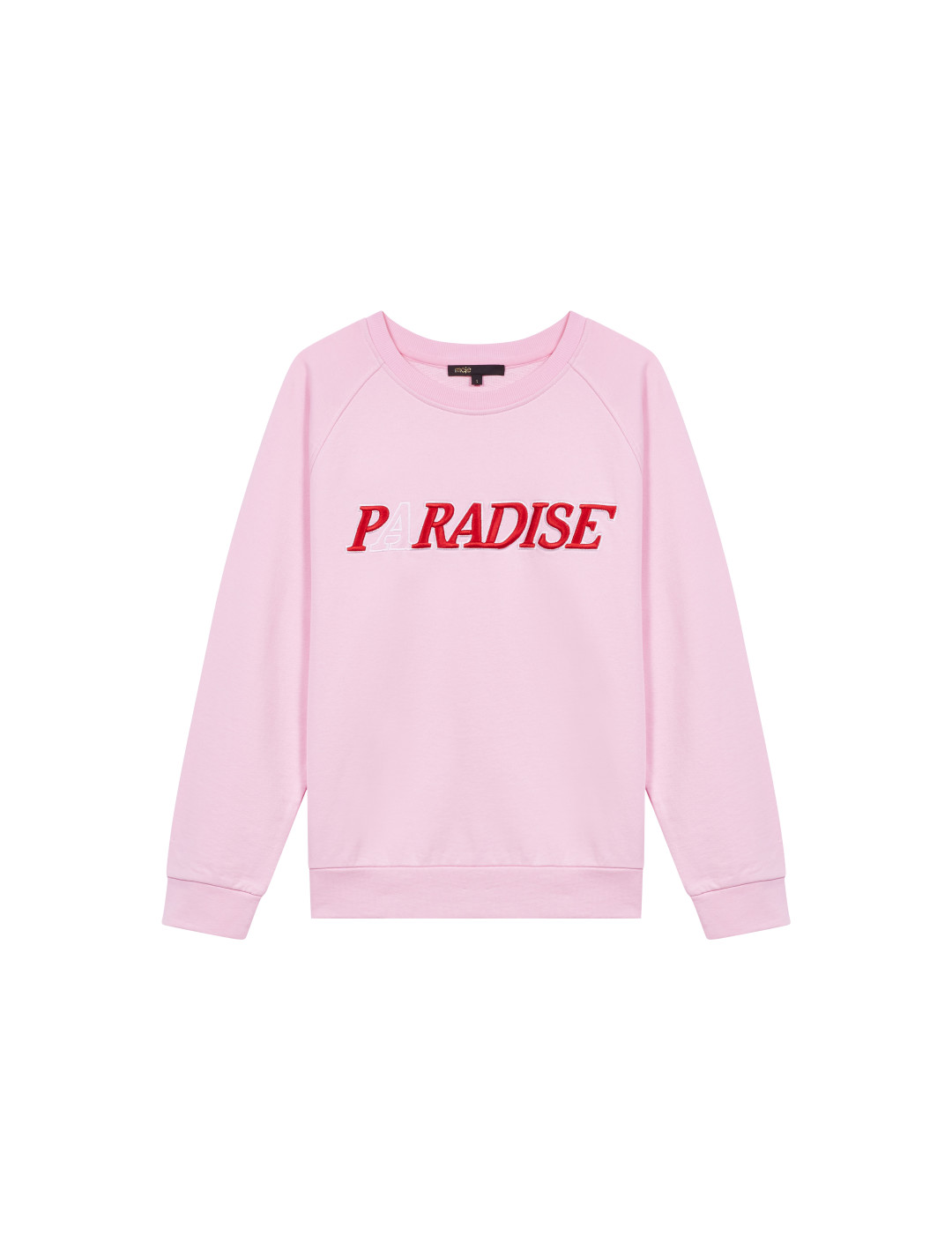 Атласный пиджак насыщенно-розового цвета – практичный предмет гардероба: с ним можно создавать как образы на каждый день (сочетая, например, с базовыми джинсами), так и для особого случая (дополняя мини-юбкой Maje с накладными карманами). Белый комбинезон с фурнитурой золотого оттенка станет новым вариантом casual-лука, который всегда под рукой, а свитшот с надписью Paradise – напоминанием, что рай там, где мы.