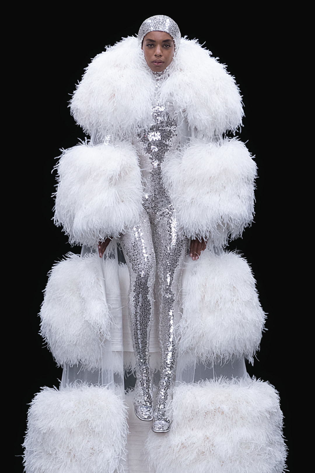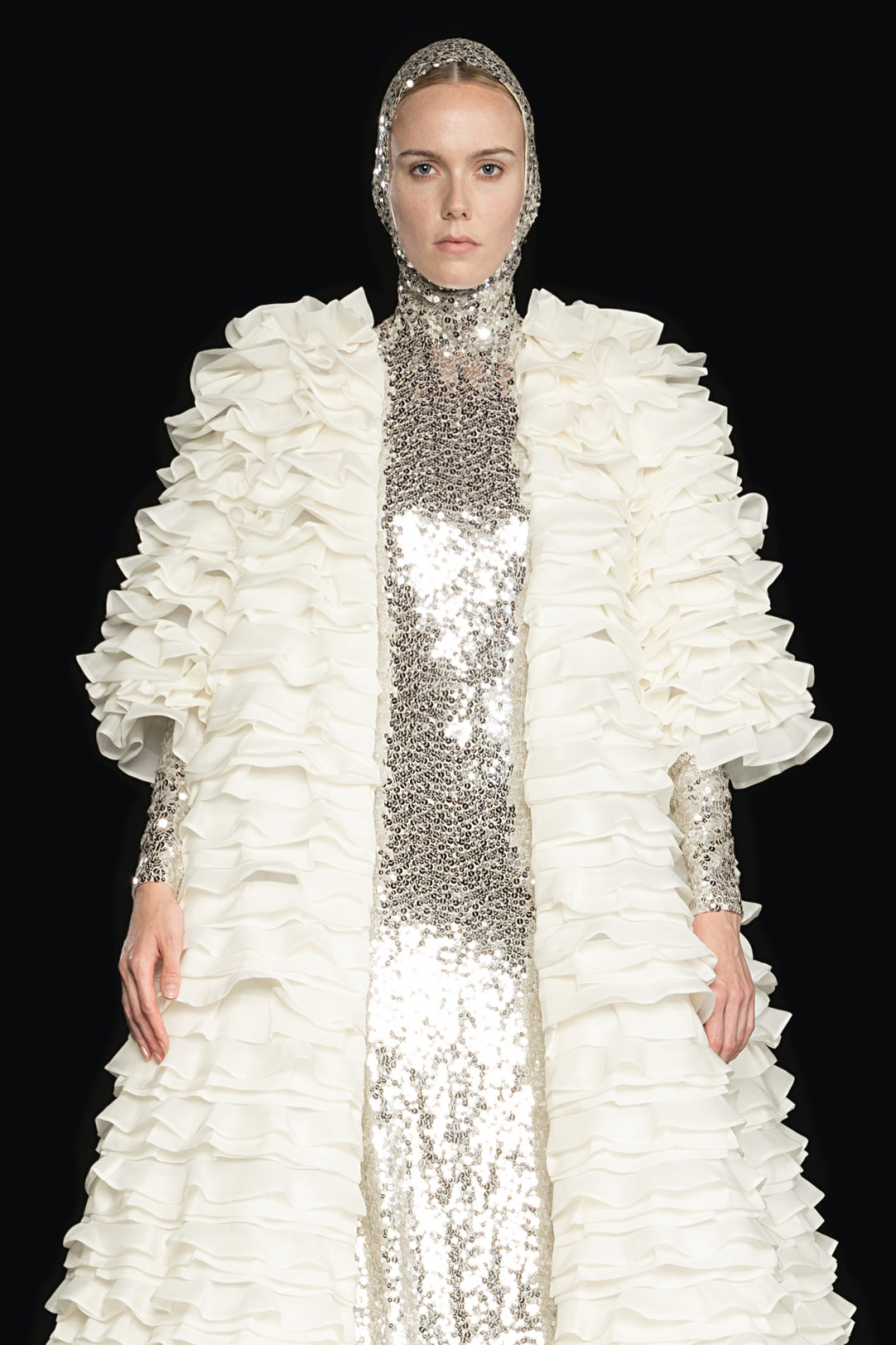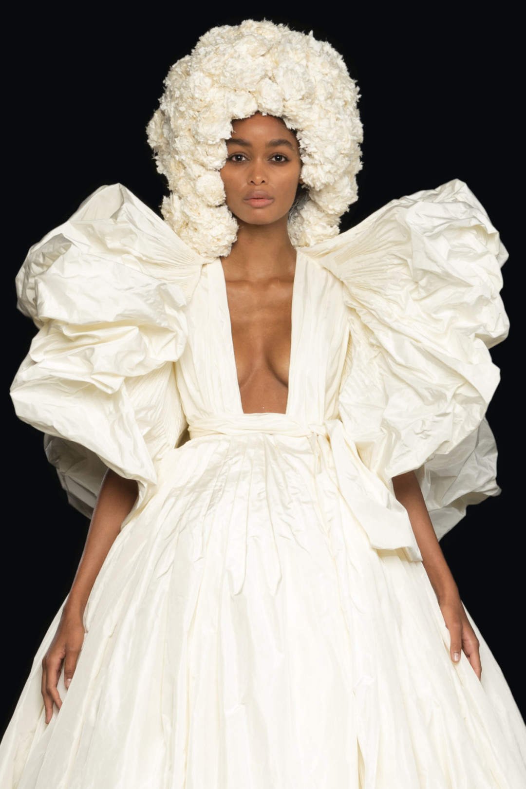 Для коллекции осень-зима 20-21 креативный директор бренда Пьерпаоло Пиччоли создал 14 платьев. Главный цвет кутюрной линии Valentino — белый. Именно в нем выполнено большинство платьев: фактурных, с воланам, объемными рукавами-фонариками, бантами и перьями. Засилие белого Пьерпаоло Пиччоли разбавил блестящими металлизированными образами с капорами. А некоторые платья дополнил головными уборами и высокими перчатками.