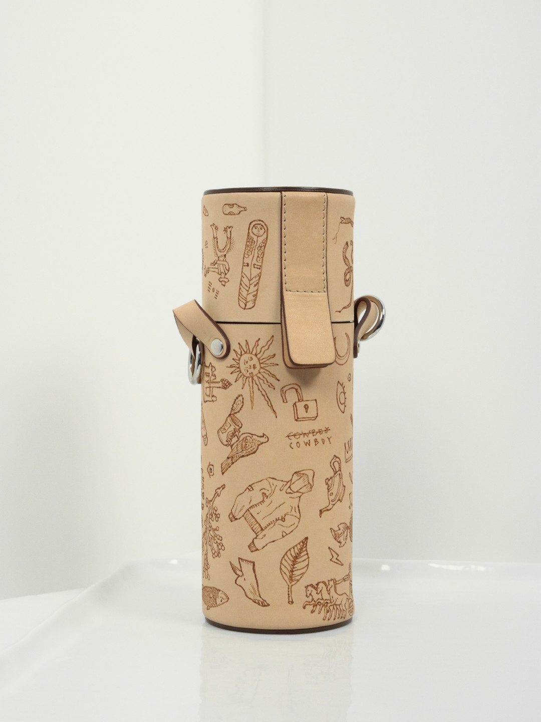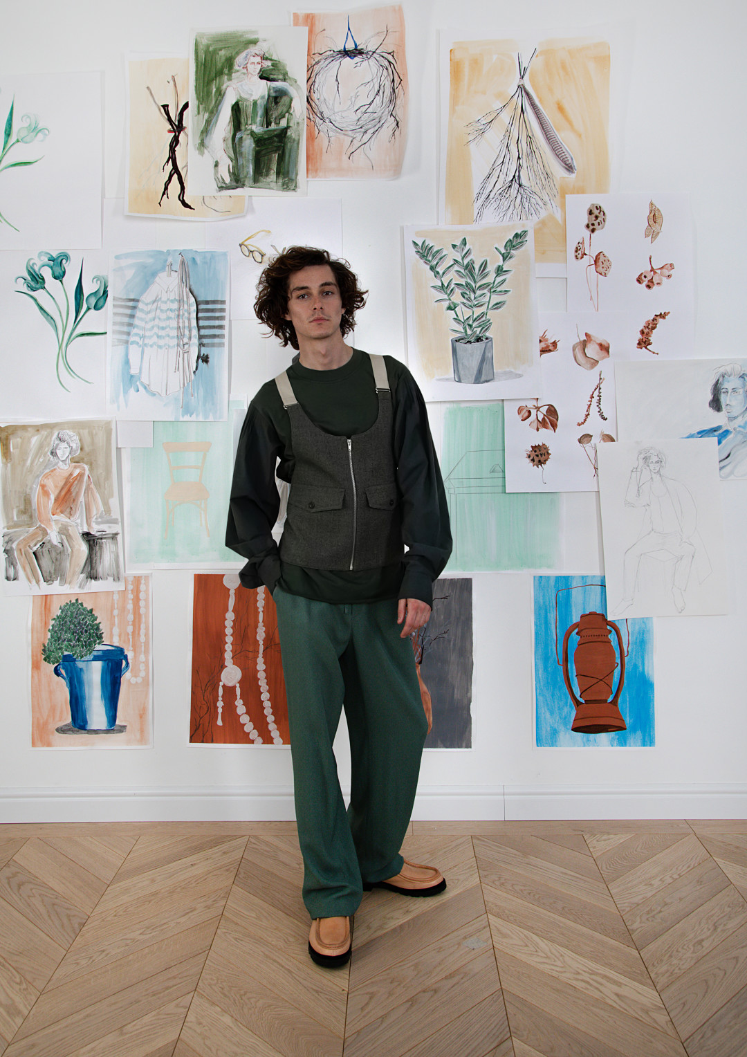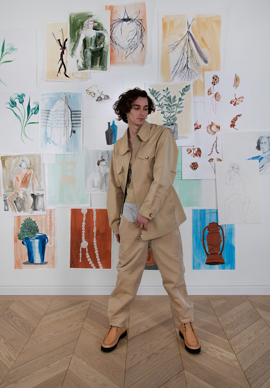 В коллекцию вошли плащи и куртки из хлопкового денима и бархата с ассиметричной застежкой и карманами на полочке похожей на передник художника, свитшоты с объемными рукавами из хлопкового трикотажа и сатина, хлопковые рубашки с накладными карманами, напоминающие о гавайских пальмах, сорочки из тонкого хлопкового батиста без рукавов, футболки с живописными принтами, дорожные костюмы: бомбер с молнией и брюки на кулиске из хлопкового денима, трикотажные джемперы из шерсти мериноса неотбеленных естественных оттенков и многоцветный джемпер связанный в технике «интарсия», отсылающий к пейзажам, которые видно из окна самолета. В качестве аксессуаров — тубусы для воды и кожаные сумки. Рисунки на них — не просто принты, а татуировки авторства петербургского тату-мастера Тимура Война Кошки.