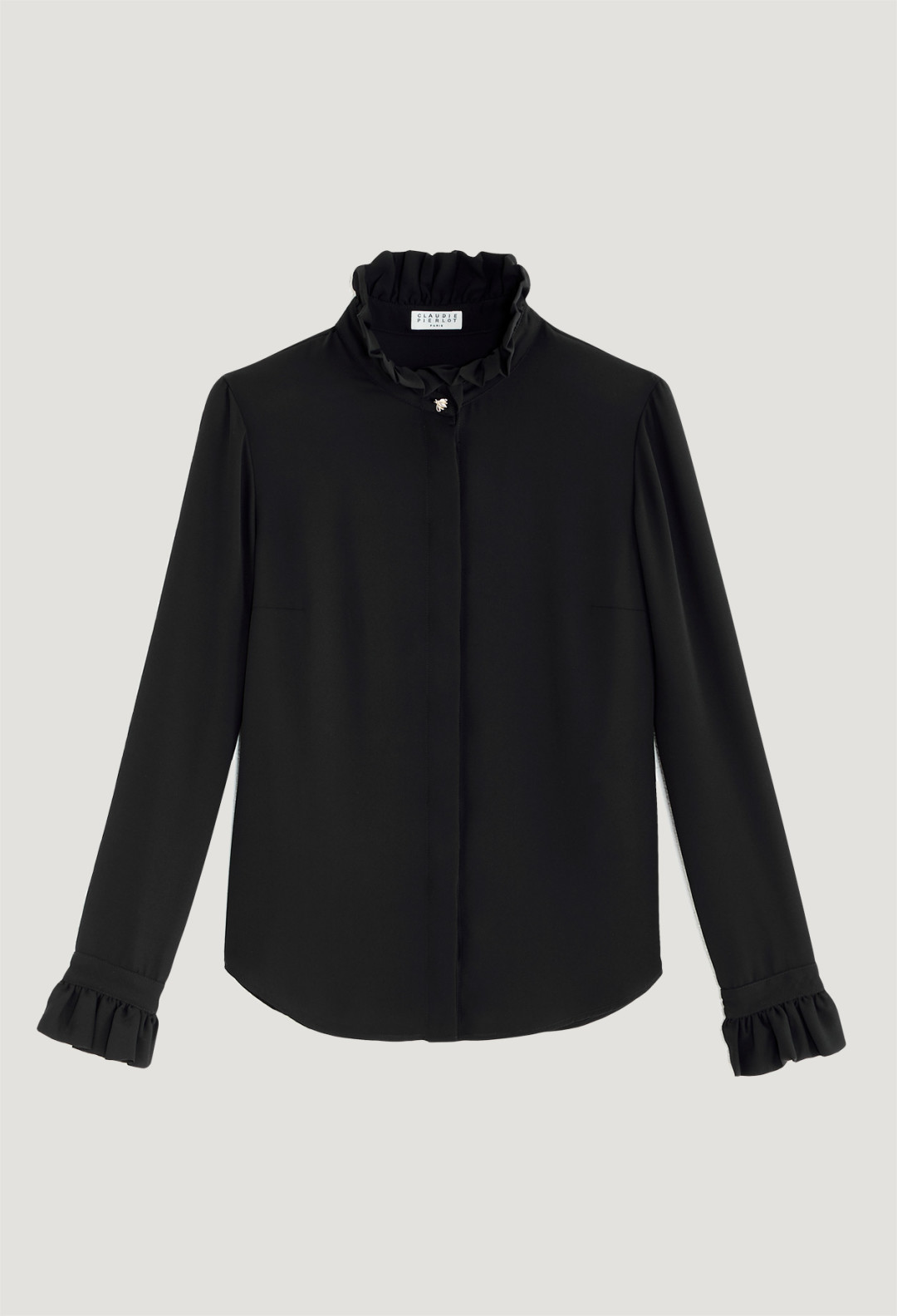 Вся вечерняя коллекция Claudie Pierlot выполнена в угольно-черном цвете, исключение — джинсы с высокой талией классического оттенка, которые следует носить с бархатным боди, украшенном стразами. Платья и аксессуары дизайнеры бренда тоже дополнили металлизированными элементами: заклепками, пайетками, шипами. Смягчают агрессивное настроение воротники-стойки, силуэты с запахом, жаккардовые детали, оборки и длина макси. В общем балансируем на грани, как, впрочем, и весь 2020 год.
