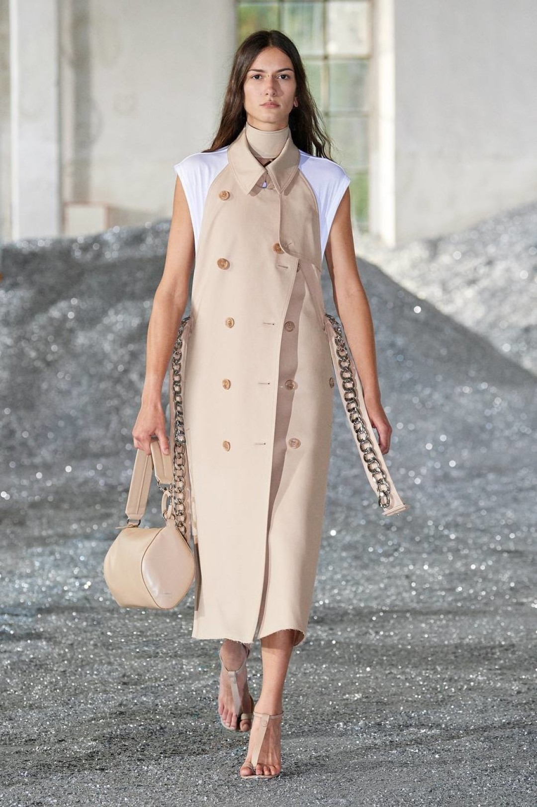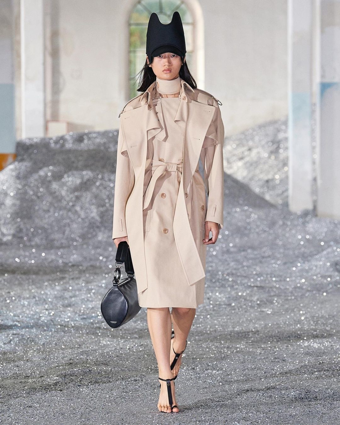 В новую коллекцию Burberry вошли как классические тренчи, которыми славится модный дом, так и с элементами деконструкции. Аналогичный прием Риккардо Тиши использовал при работе над мужской верхней одеждой также коллекции весна-лето 2022. Тренчи декорированы широким лацканам, украшениями из цепочек и необработанными краям. Отдельные вещи украсили абстрактные узоры, которые словно зеркально отражаются и создают эффект камуфляжного принта. Также Burberry представили бейсболки-короны, мини-платья, дополненные длинной бахромой, боди и трикотаж. Среди аксессуаров — новая сумка Rhombi в форме эллипса, вдохновленная абстрактными фигурными принтами коллекции. Образы моделей были дополнены накладными ушами, похожими на эльфийские, но заостренным концом вниз.