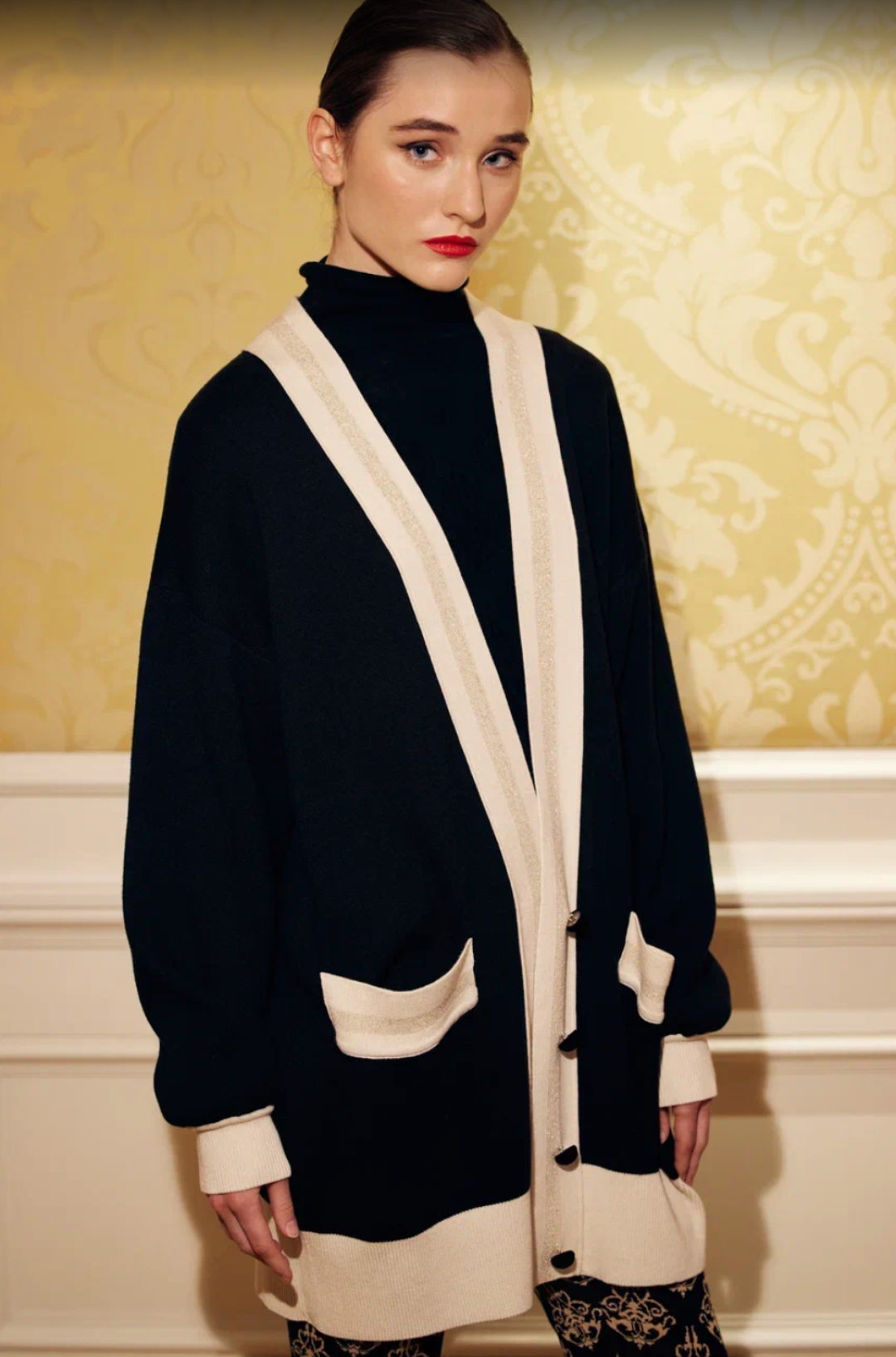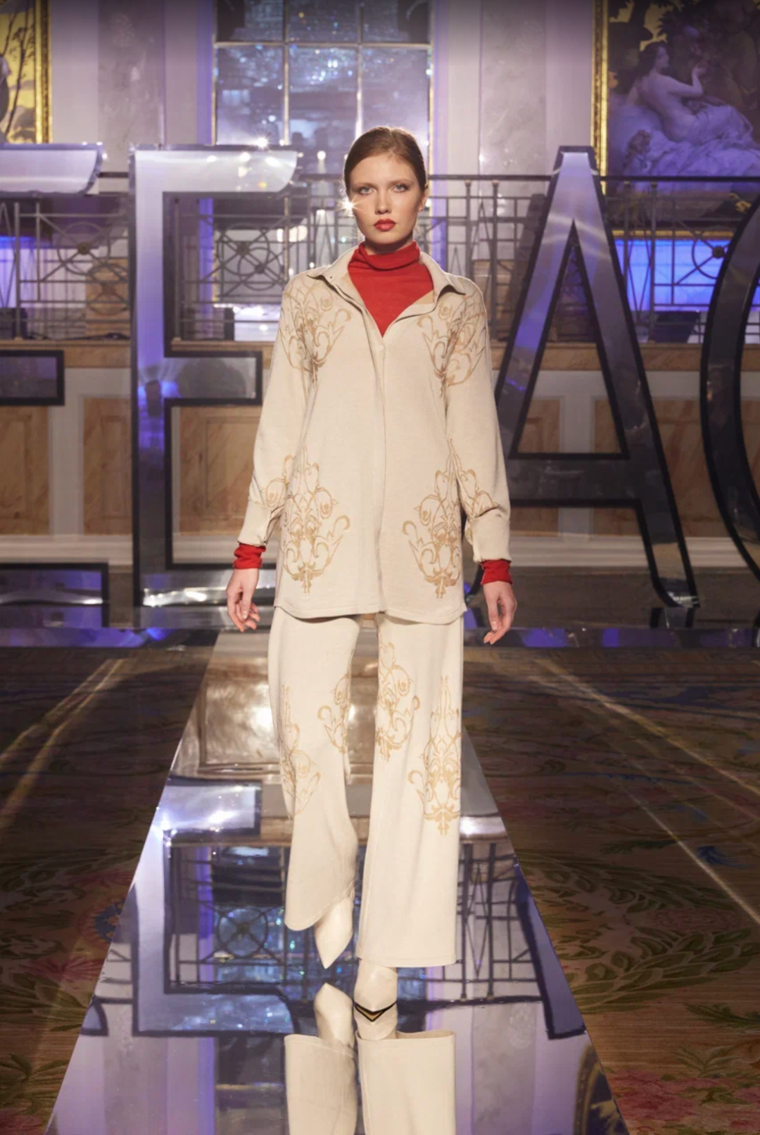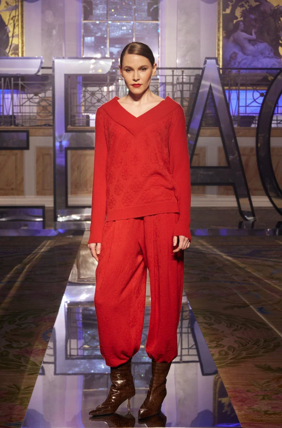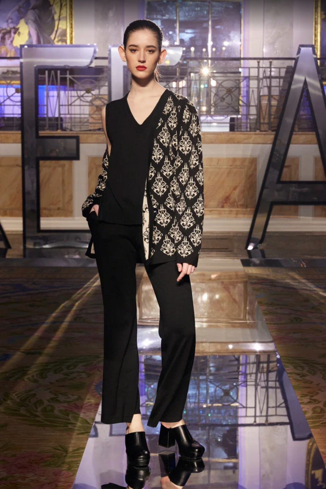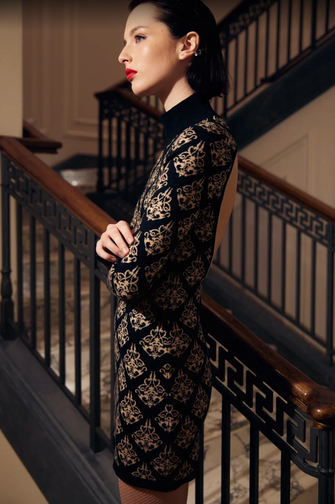 В базовую линейку вошли фирменные шелковые платья и кардиганы с отделкой золотом и серебром, брючные костюмы и мини-платья в черных и бежевых оттенках. Их украшает жаккардовый узор, созданный дизайнером марки Ириной Шарафутдиновой специально для этой коллекции. Он связан таким образом, что позволяет носить вещи с двух сторон – изнаночная сторона выглядит контрастно.