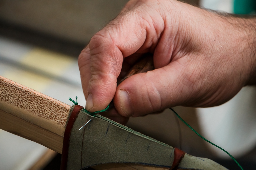 После этого, уже подготовленный крой разместить на колодке и можно начинать сам процесс. Для него потребуется: специальное шило с ушком; иголка, предназначенная для работы с кожей; мулине (предпочтительнее вискоза), нити которой уже намотаны с помощью веретена до определенной толщины и тачные нитки (капроновые или армированные).