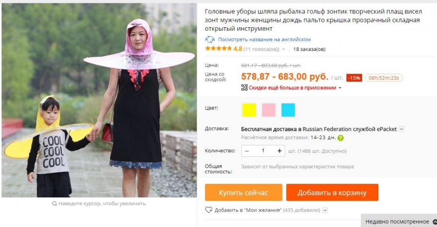 Гибрид дождевика и зонта, который хоть и защищает от осадков, но смотрится очень странно, уже появился на AliExpress. Азиатское изобретение напоминает конус, надетый на голову с помощью капюшона: на сайте его обзывают «творческим плащом», «рыбалкой», «пальто-крышкой» и «складным открытым инструментом». Несмотря на очевидный недостаток — зонт-дождевик спасает только верхнюю часть тела — в Китае надеются, что он сможет заменить собой обычные зонты, которые занимают руки и не дают фотографировать себя на фоне Спаса на Крови и Казанского собора.