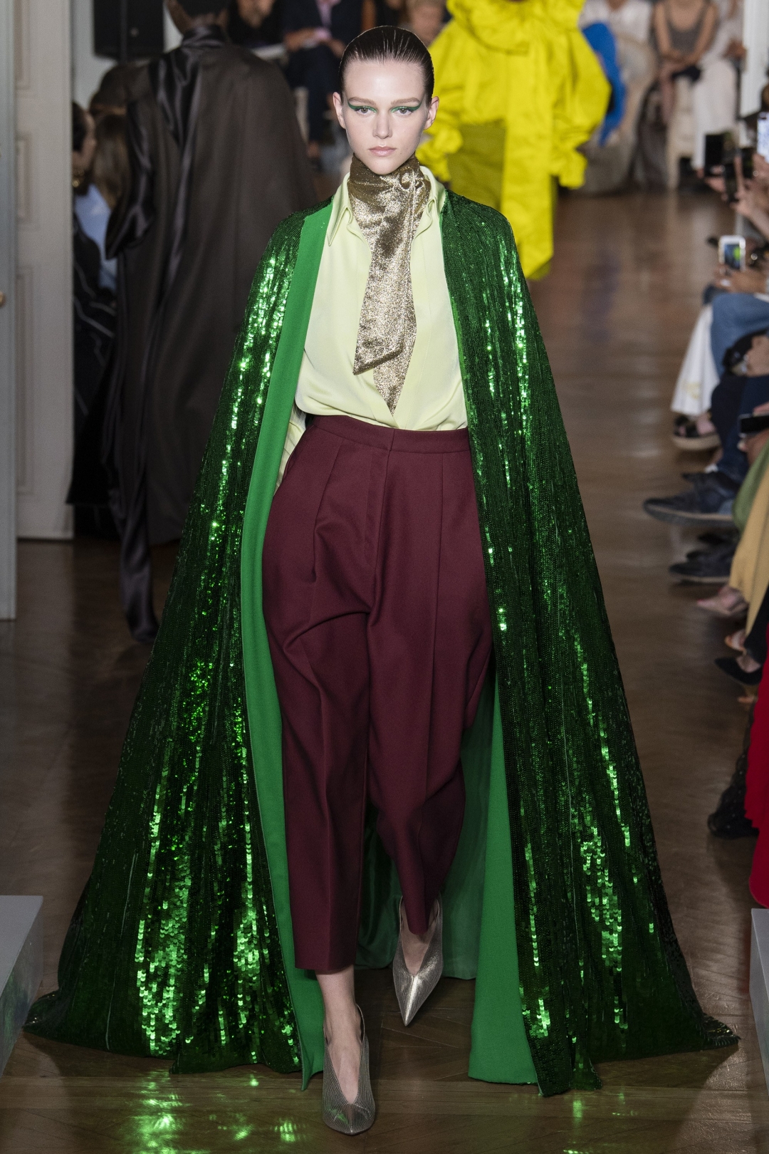 Отсюда такая неровная и разная, но очень красивая коллекция: с бесформенными платьями, накидками в пайетках, бадлонами-кольчугами, сюрреалистичными силэутами, костюмами а-ля фарфоровый сервиз и головными уборами из искусственных бутонов. Они имитировали прически из знаменитой серии снимков «Unseen Versailles», сделанных Деборой Турбевилль в 1981-м.