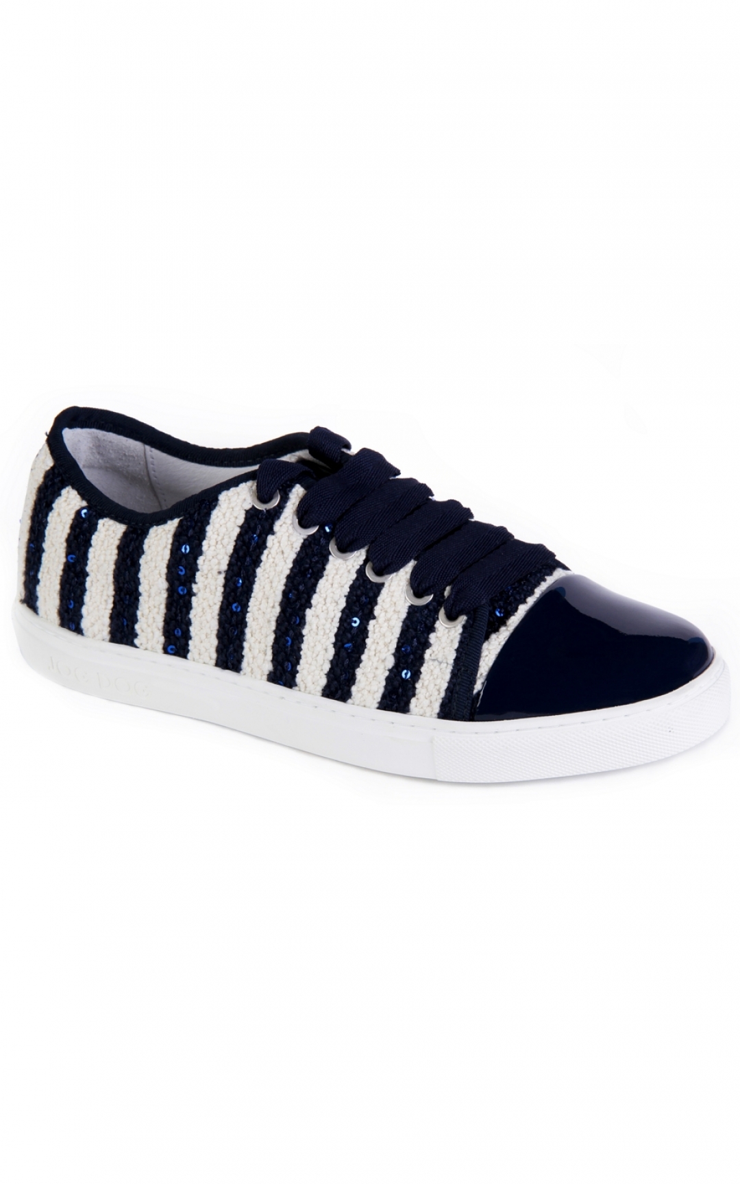 При виде полосатых летних твидовых кед Jog Dog на ум приходит поговорка: «Жизнь как зебра: то белая полоса, то черная». Только в случае с расцветками этой коллекции нам предлагают чередовать голубой, темно-синий и золотой цвета. Ну и правильно, какие черные полосы, когда такая погода! (jogdog.ru)