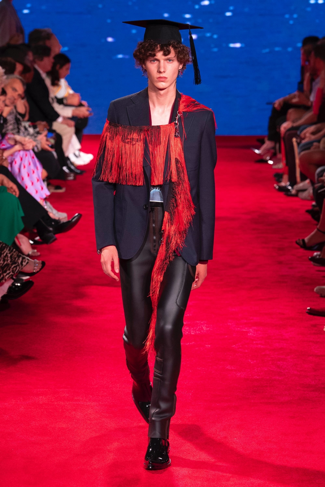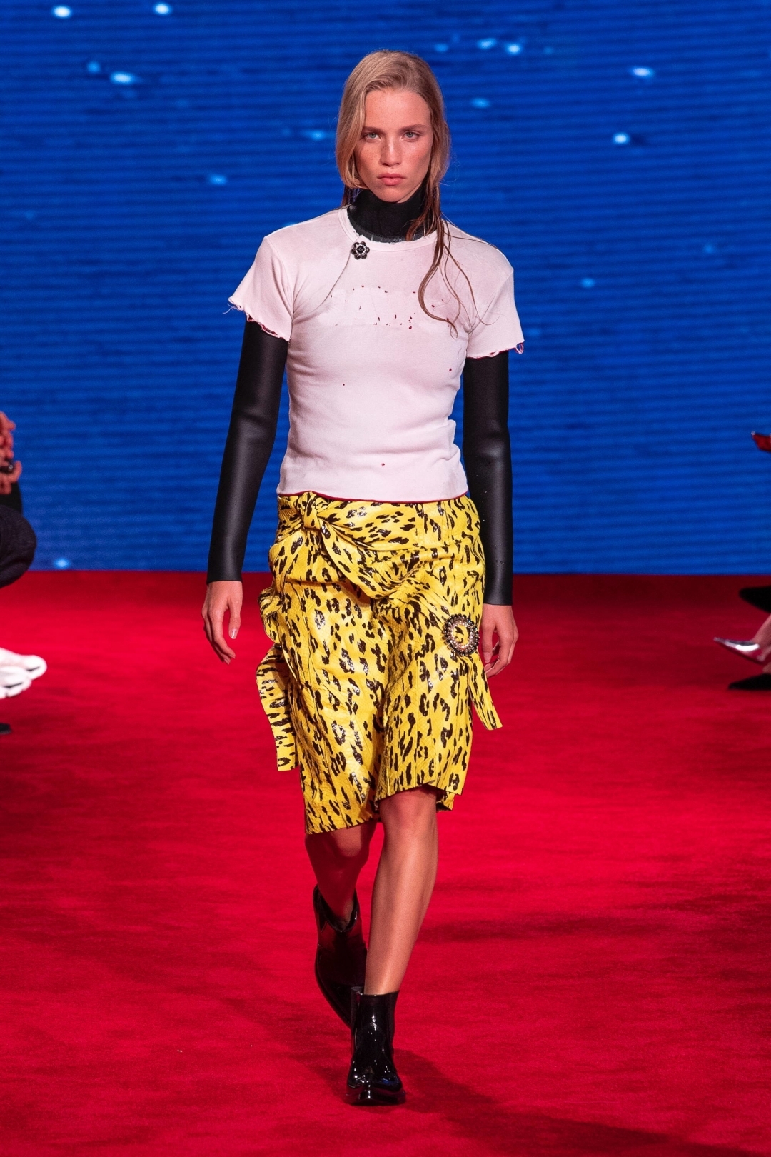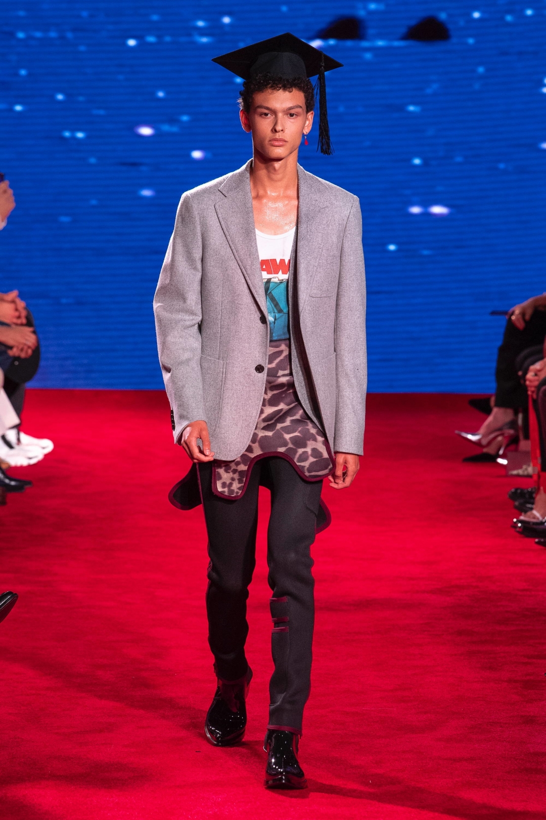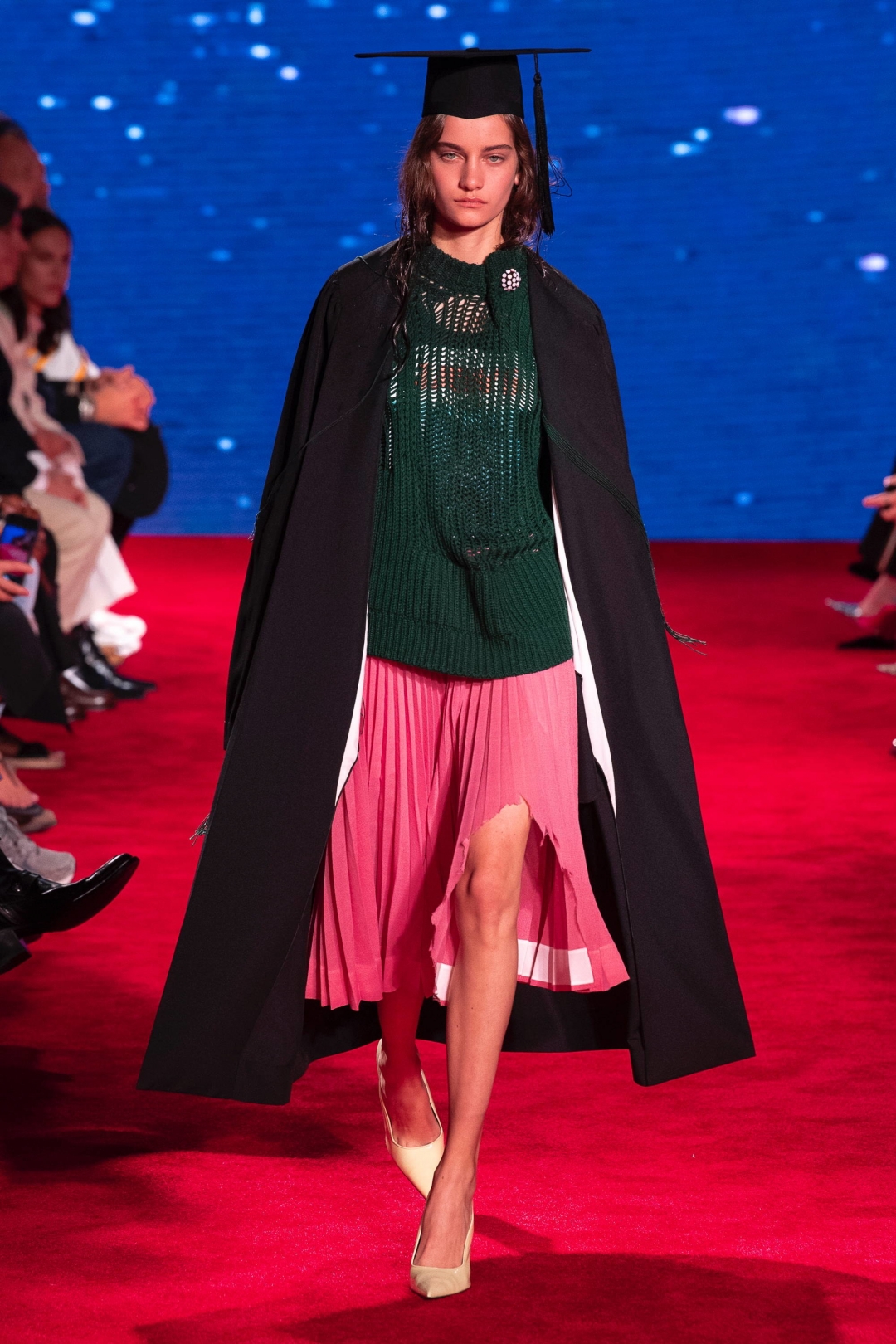 Морскую тему также подчеркивали красные шапочки — точь-в-точь, как у Жака-Ива Кусто и списанного с него образа Стива Зиссу из фильма Уэса Андресона. Но в некоторых образах стайлинг делали не хипстерские головные уборы, а университетские — еще одна отсылка Рафа Симонса к кинематографу, а именно к драматично-романтичному «Выпуснику». К нему же апеллировали буржуазные платья с крупными брошами и леопардовый принт, помещенный на фартуки и желтые юбки, — в новом сезоне будем косплеить если не жертв акульей охоты, то соблазнительную Миссис Робинсон.
