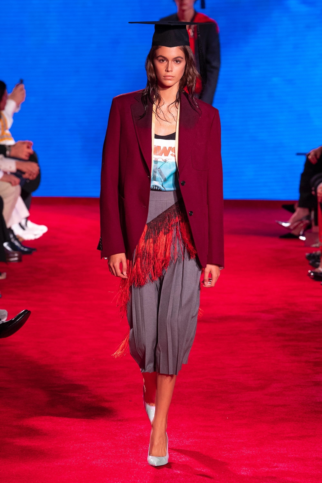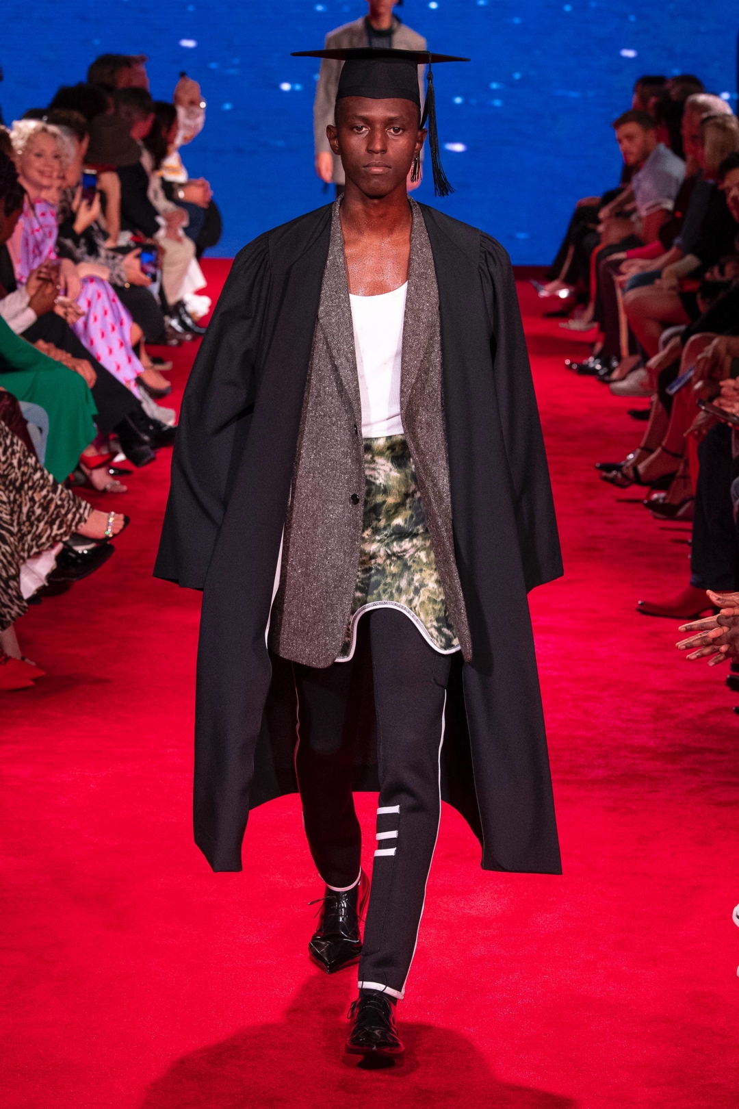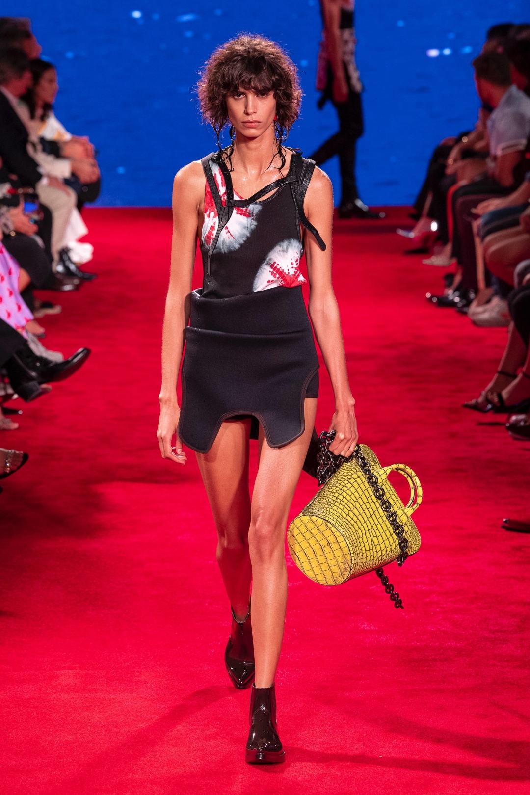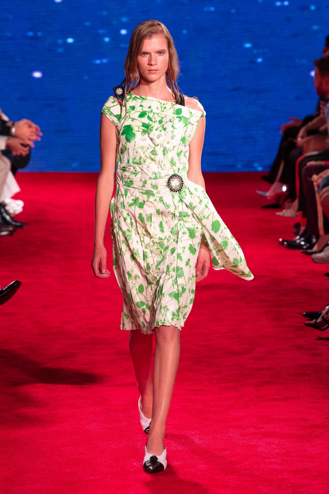 Морскую тему также подчеркивали красные шапочки — точь-в-точь, как у Жака-Ива Кусто и списанного с него образа Стива Зиссу из фильма Уэса Андресона. Но в некоторых образах стайлинг делали не хипстерские головные уборы, а университетские — еще одна отсылка Рафа Симонса к кинематографу, а именно к драматично-романтичному «Выпуснику». К нему же апеллировали буржуазные платья с крупными брошами и леопардовый принт, помещенный на фартуки и желтые юбки, — в новом сезоне будем косплеить если не жертв акульей охоты, то соблазнительную Миссис Робинсон.