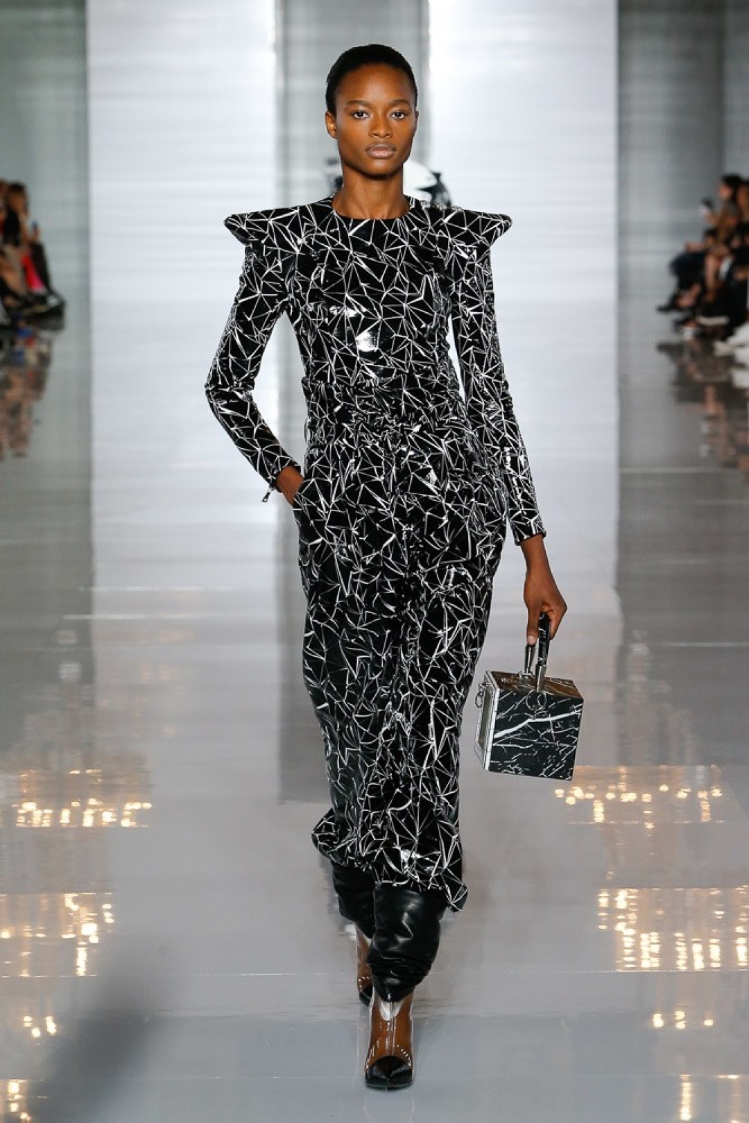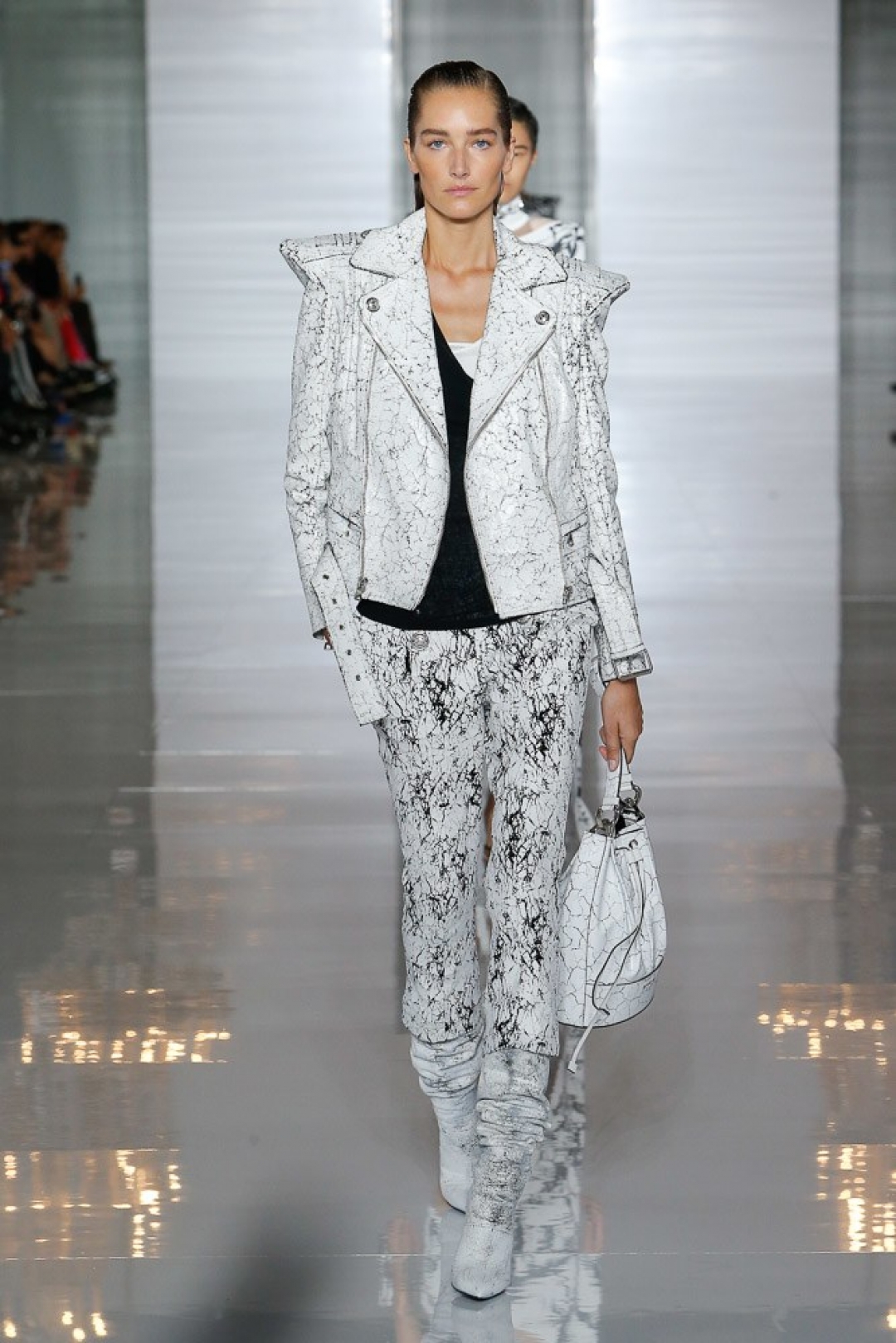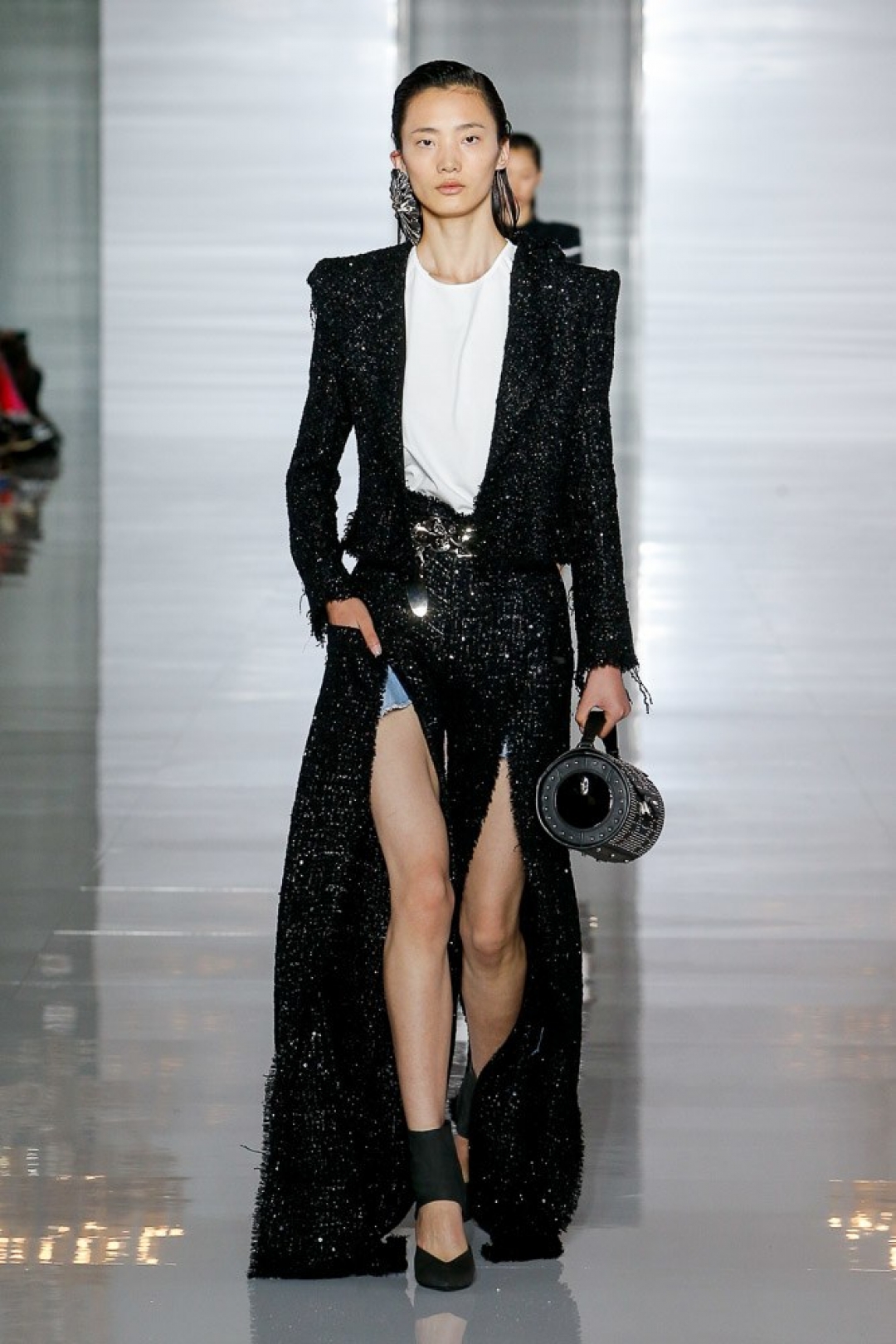 Шелковые костюмы-пижамы сменялись рваными свитерами и брюками в полиэтиленовых пакетах, вечерние платья с крыльями чередовались с нарядами из бинтов, а «хрустальные» комплекты с гигантскими моносерьгами перекликались с «кособокими» жакетами и сумками в стиле Issey Miyake. Приемы, которые использует Рустен (вещи с будто бы потрескавшейся краской, замшевые тотал-луки и бронированные корсеты, которые в Петербурге делает дизайнер Саша Амплитуда), совсем не новые, однако в рамках той стилистики, которую пропагандирует Balmain, они выглядят довольно здорово и аутентично.