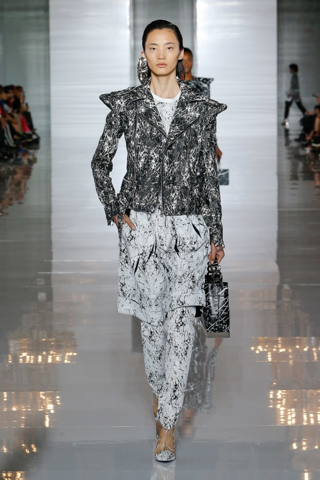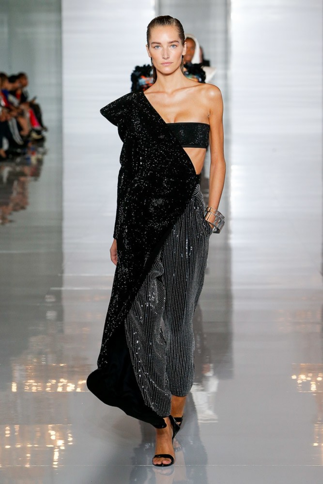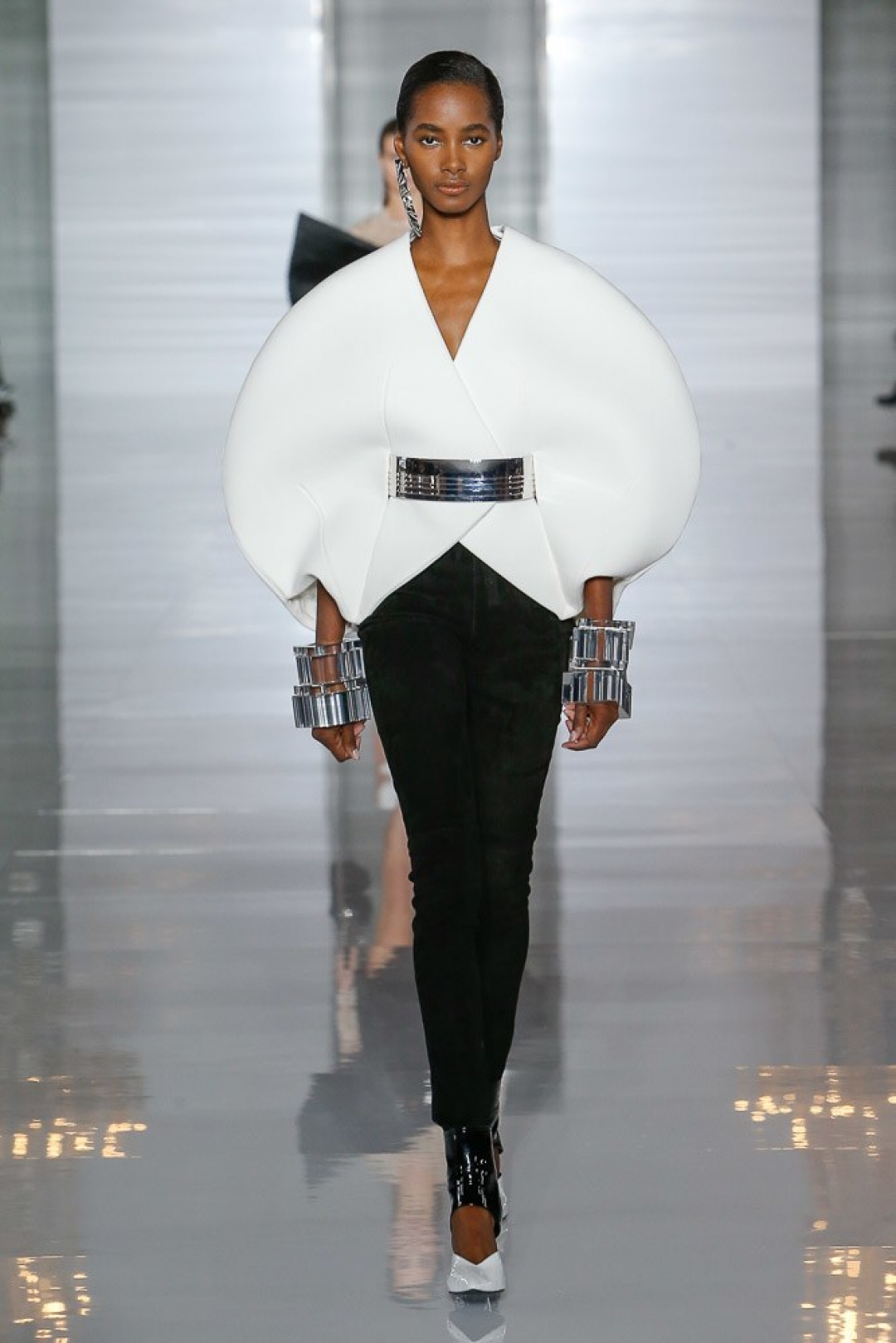 Шелковые костюмы-пижамы сменялись рваными свитерами и брюками в полиэтиленовых пакетах, вечерние платья с крыльями чередовались с нарядами из бинтов, а «хрустальные» комплекты с гигантскими моносерьгами перекликались с «кособокими» жакетами и сумками в стиле Issey Miyake. Приемы, которые использует Рустен (вещи с будто бы потрескавшейся краской, замшевые тотал-луки и бронированные корсеты, которые в Петербурге делает дизайнер Саша Амплитуда), совсем не новые, однако в рамках той стилистики, которую пропагандирует Balmain, они выглядят довольно здорово и аутентично.