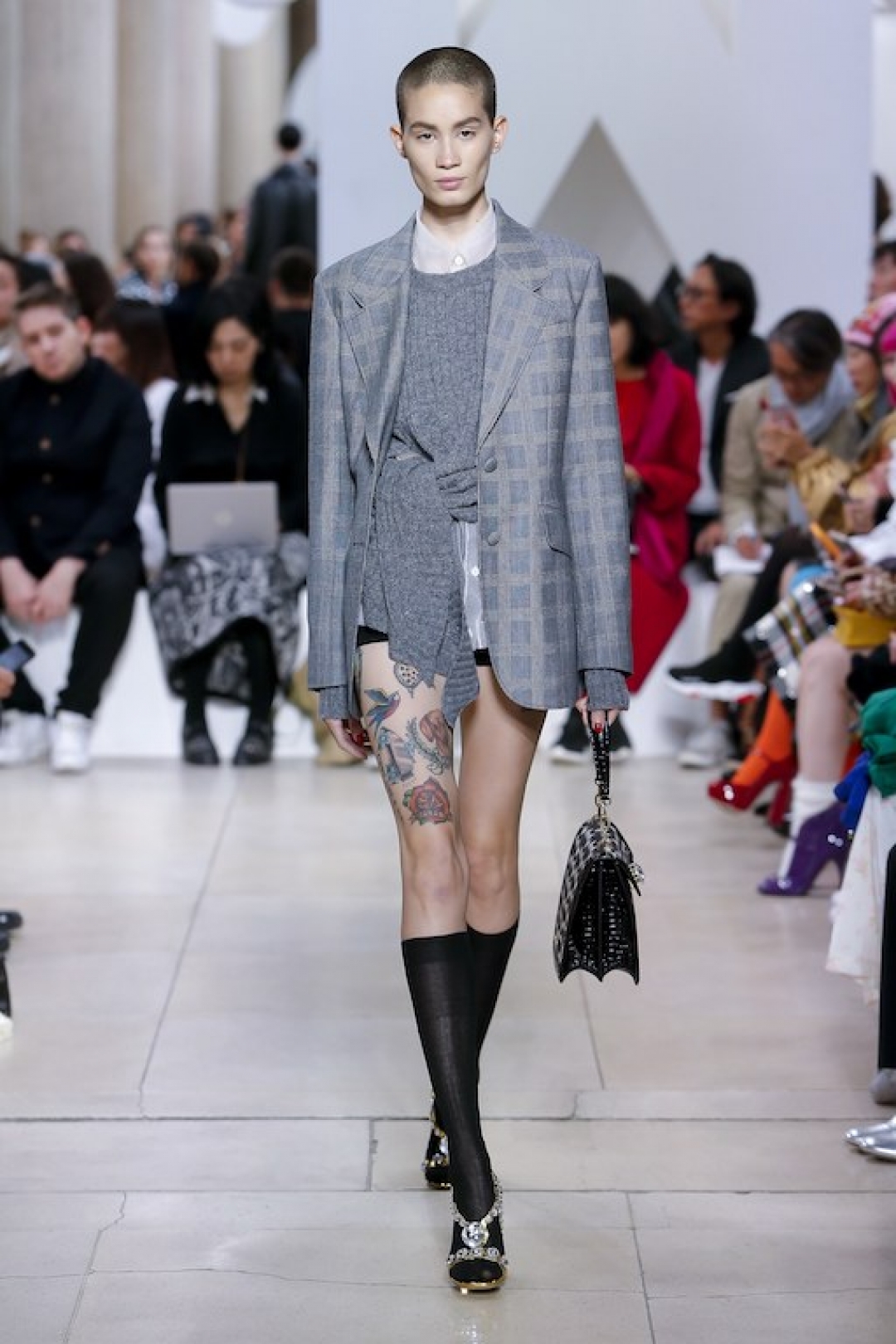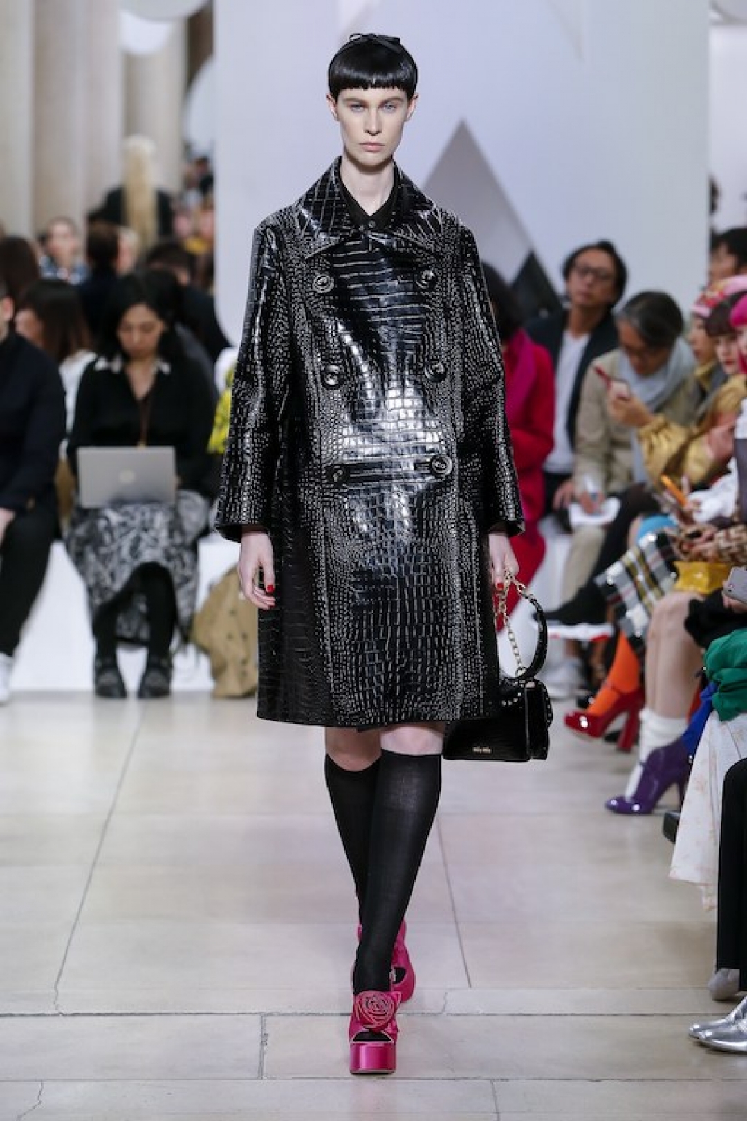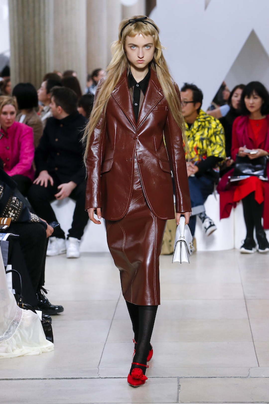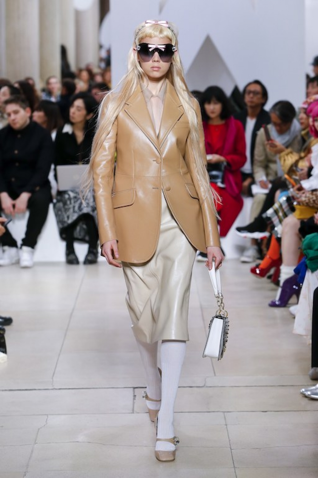 Некоторым героиням шоу сделали прически в стиле представительниц корейского K-Pop, перевязав волосы розовыми бантиками и дополнив образы огромными очками. Такой миллениальный инфантилизм появился на показе бренда неспроста: Miu Miu увеличивают мировые продажи и наглядно демонстрируют курс на нового покупателя. А мы и не против: будем носить ободки леденцовых оттенков вместе с виниловыми плащами, грубыми пиджаками и бюстгальтерами без футболок. Ведь коллекция, как объяснила Миучча, про «деконструированную красоту» и современное понимание тэйлоринга, гламура и элегантности.