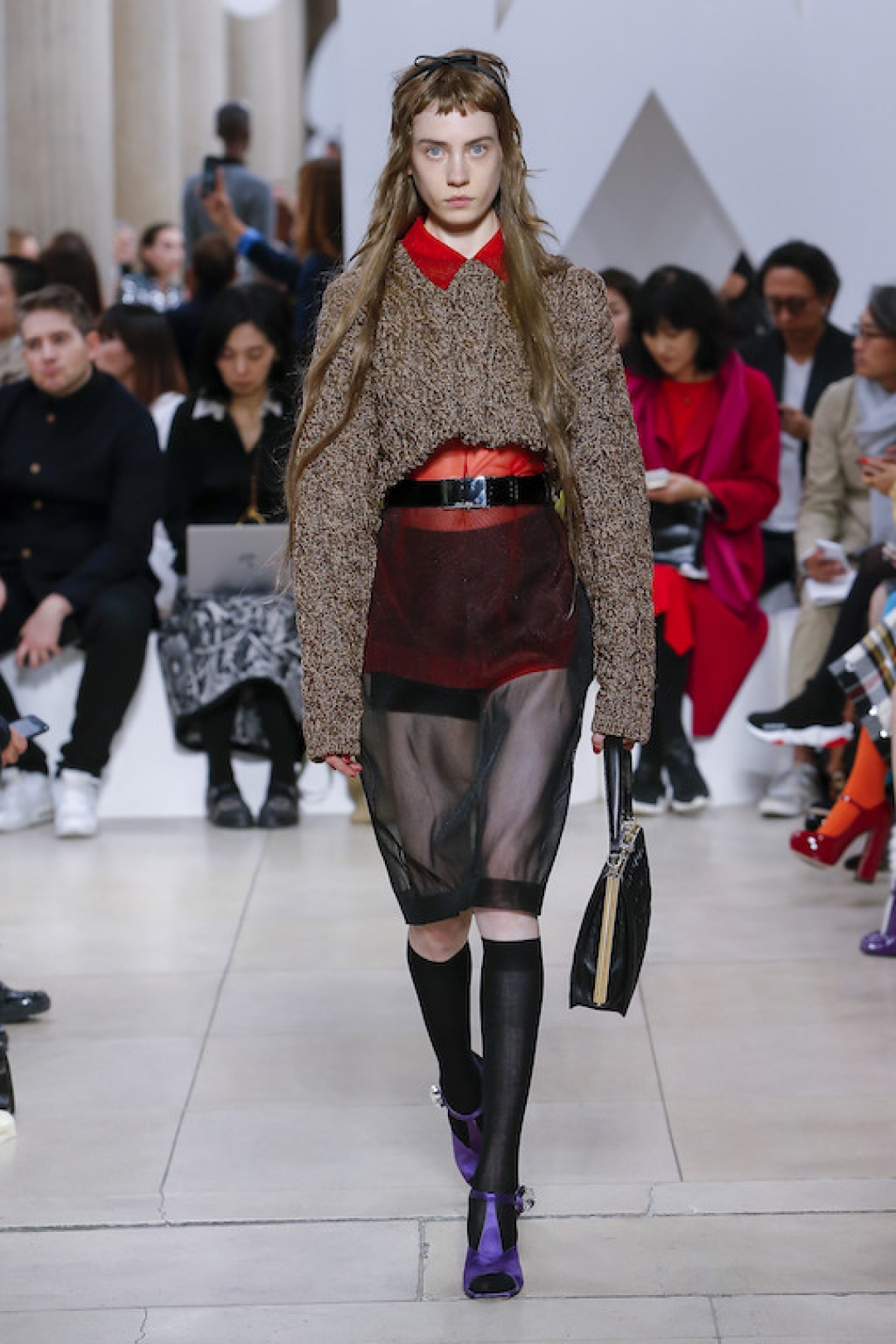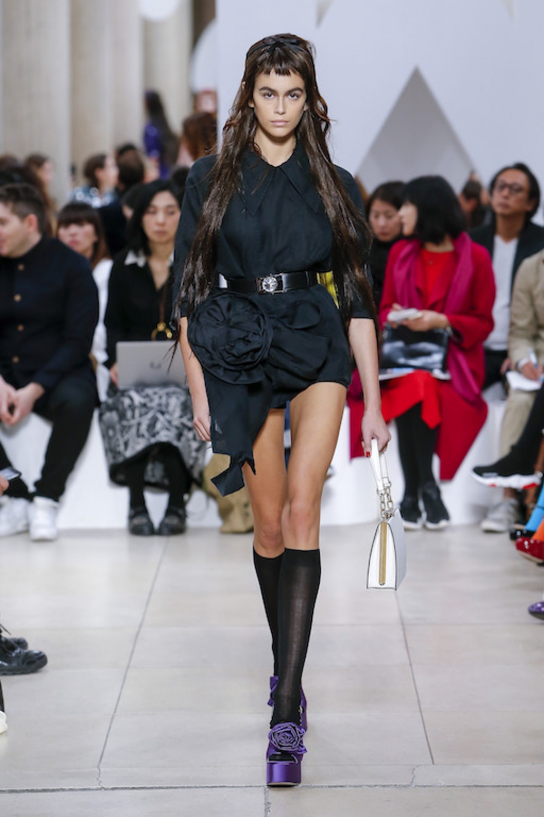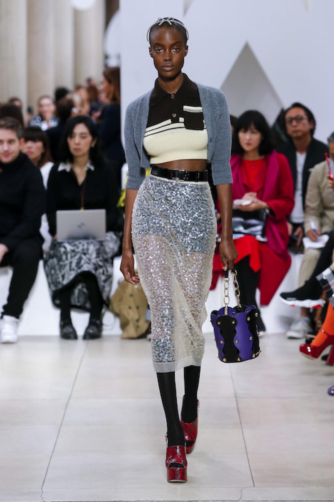 Некоторым героиням шоу сделали прически в стиле представительниц корейского K-Pop, перевязав волосы розовыми бантиками и дополнив образы огромными очками. Такой миллениальный инфантилизм появился на показе бренда неспроста: Miu Miu увеличивают мировые продажи и наглядно демонстрируют курс на нового покупателя. А мы и не против: будем носить ободки леденцовых оттенков вместе с виниловыми плащами, грубыми пиджаками и бюстгальтерами без футболок. Ведь коллекция, как объяснила Миучча, про «деконструированную красоту» и современное понимание тэйлоринга, гламура и элегантности.