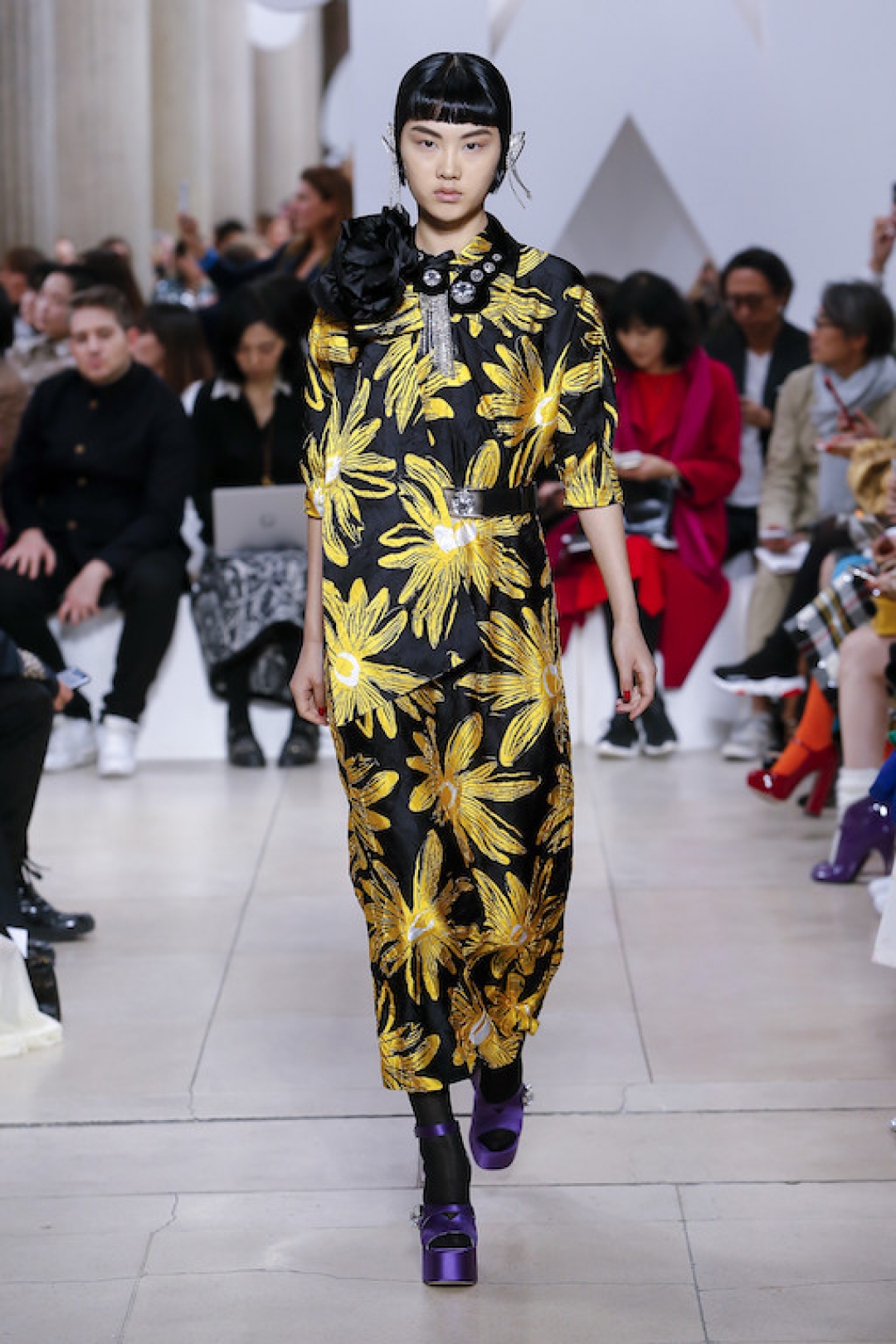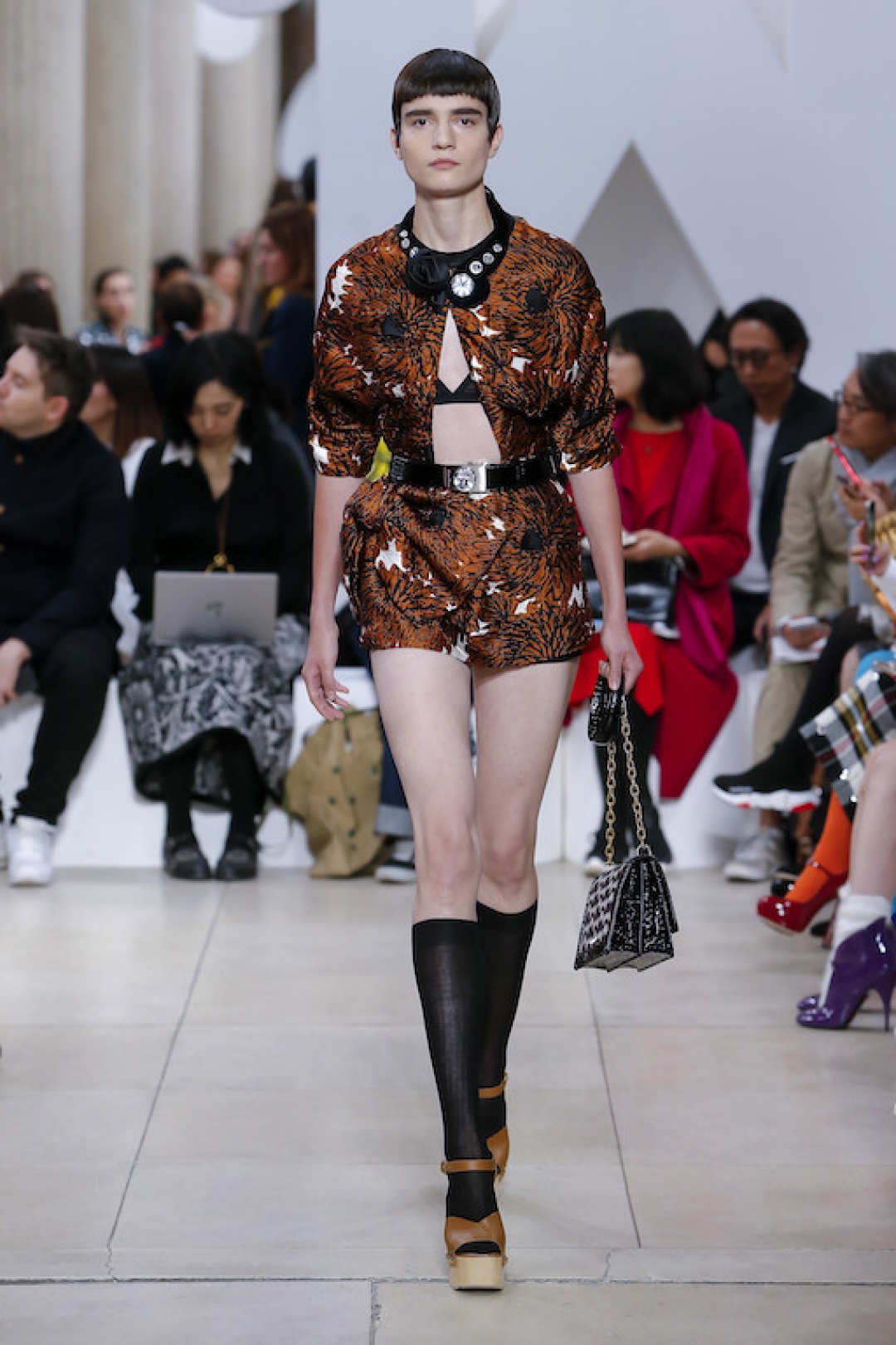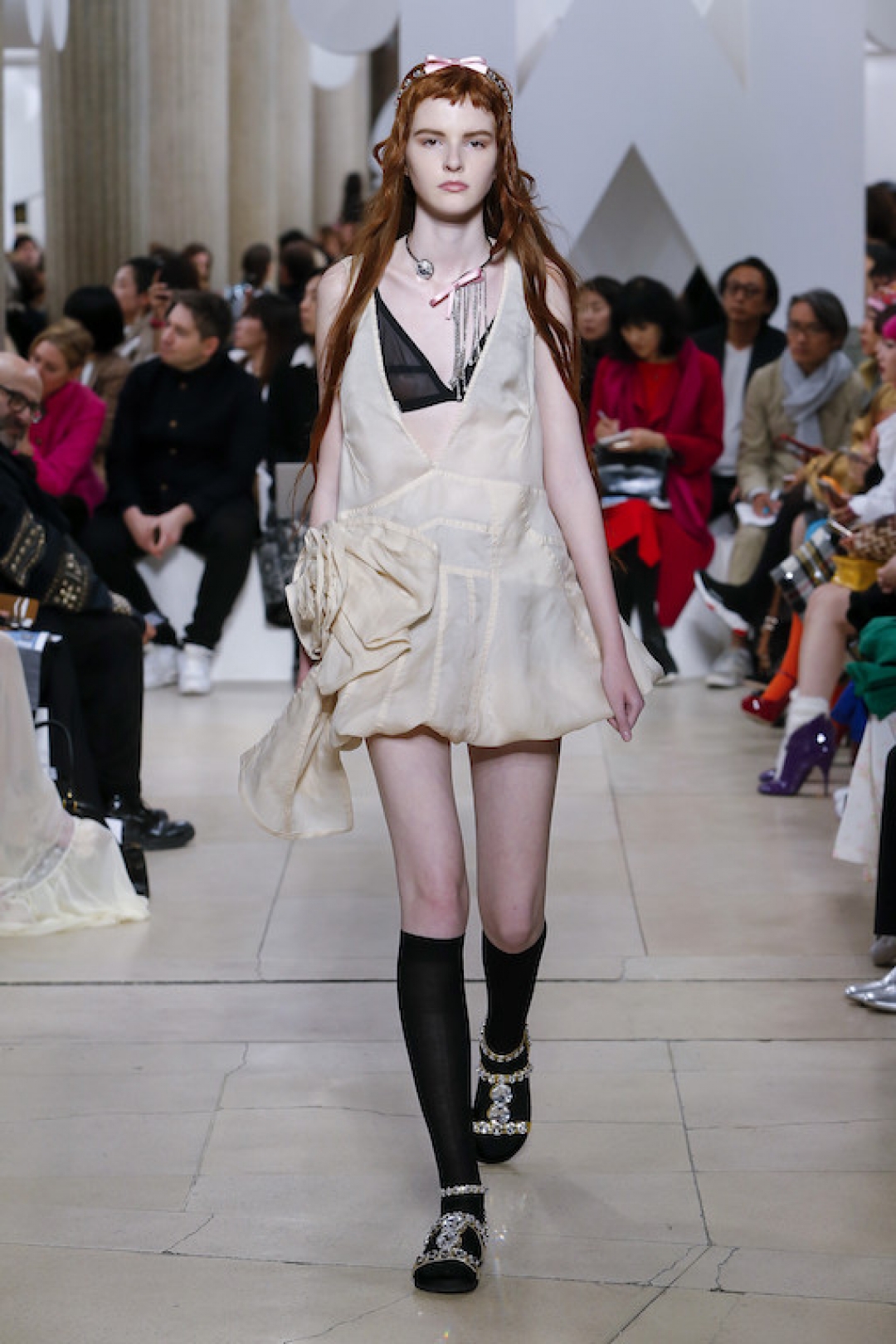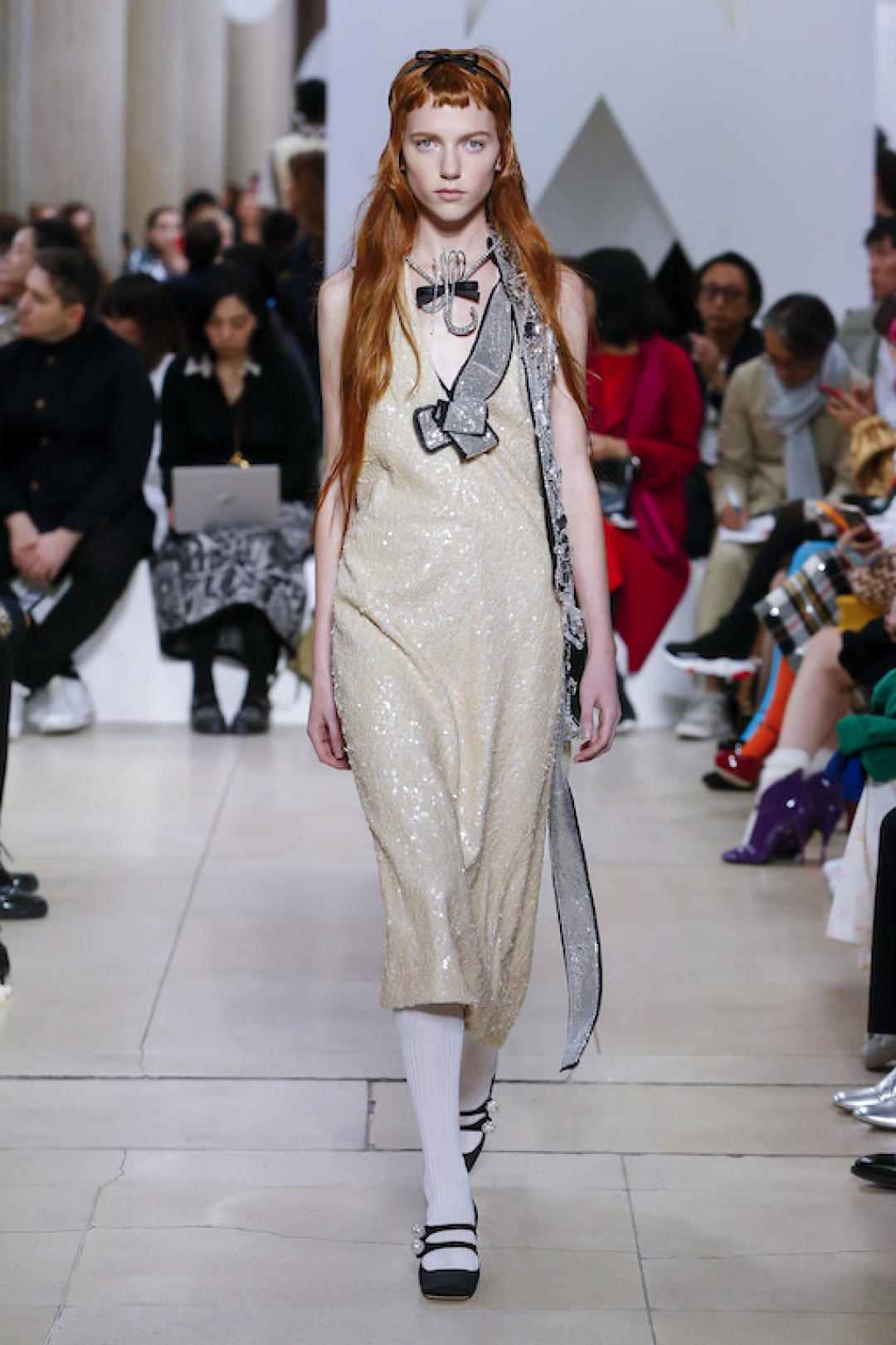 Некоторым героиням шоу сделали прически в стиле представительниц корейского K-Pop, перевязав волосы розовыми бантиками и дополнив образы огромными очками. Такой миллениальный инфантилизм появился на показе бренда неспроста: Miu Miu увеличивают мировые продажи и наглядно демонстрируют курс на нового покупателя. А мы и не против: будем носить ободки леденцовых оттенков вместе с виниловыми плащами, грубыми пиджаками и бюстгальтерами без футболок. Ведь коллекция, как объяснила Миучча, про «деконструированную красоту» и современное понимание тэйлоринга, гламура и элегантности.