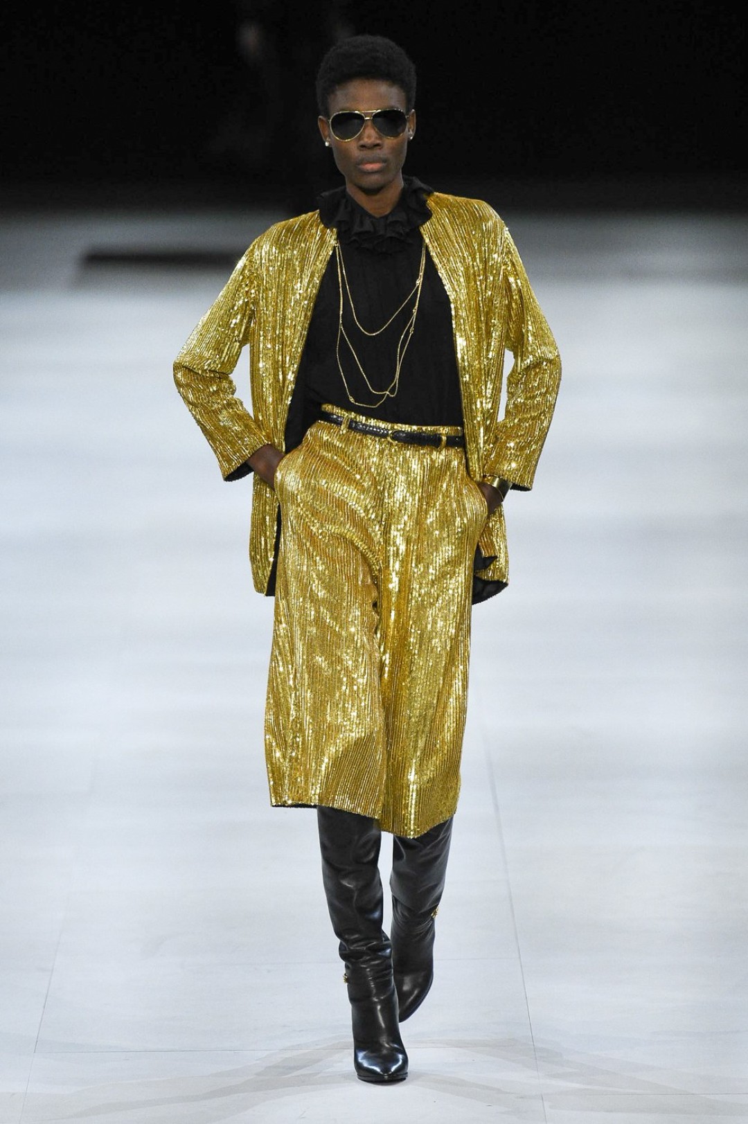 Главная вещь на показе (которую многие уже внесли в маст-хэв лист) — сапоги: утепленные изнутри овчиной, они стилизовали «лыжные» свитеры, белые шубы, «авиаторские» куртки и накидки, которые наверняка понравятся королеве Елизавете II. А учитывая любовь Эди Слимана к кастомизации платьев для красных дорожек, мы уже видим на звездах (и на себе!) платье с имитацией цепей и золотой тотал-лук с кюлотами.