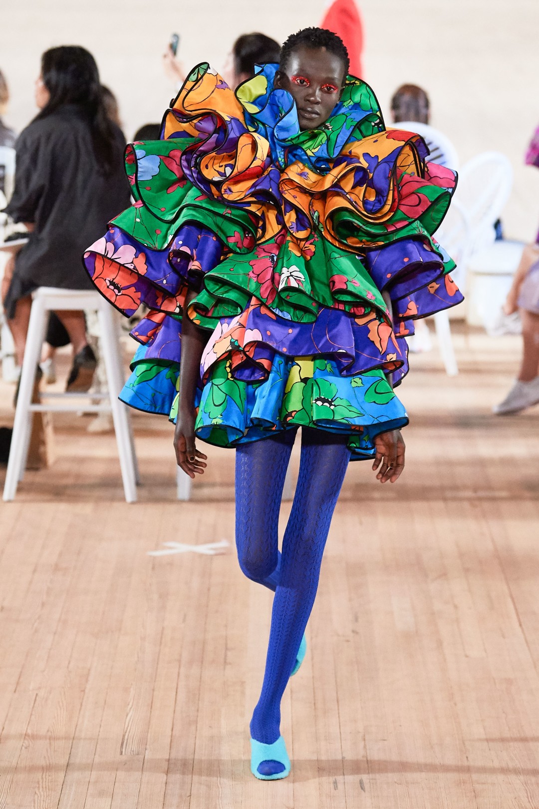 В некоторых образах угадывался стиль не только определенных личностей, но и актуальных сегодня брендов. Летящий желтый наряд с миниатюрной круглой сумкой наперевес был явной отсылкой к Jacquemus, пышные платья в цветах и косынки в перьях — к Valentino, а блестящие костюмы вкупе с «бабушкиными» очками — к Gucci. Сам же дизайнер остался верен себе и появился на подиуме с накрашенными ногтями, в подвернутых джинсах и красных полусапожках на каблуке.